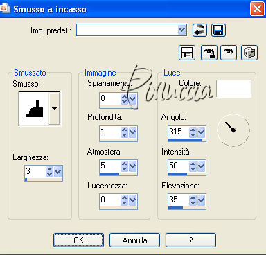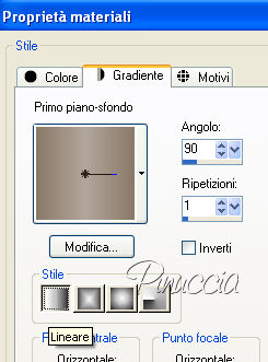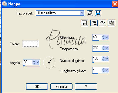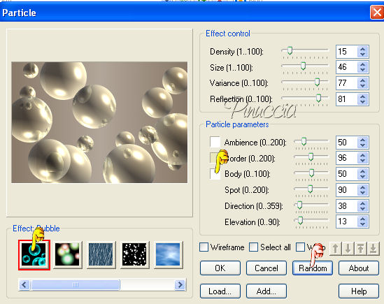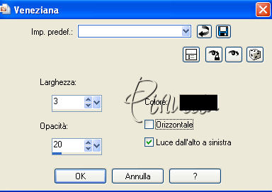 qui puoi trovare qualche risposta ai tuoi dubbi. Se l'argomento che ti interessa non è presente, ti prego di segnalarmelo. Per tradurre questo tutorial ho usato PSP X. Occorrente: Materiale qui I tubes sono di Nightangel e Roxanne. Filtri: FM Tile Tools qui Ulead Particle qui ![]() Se non vuoi sentire la musica premi il tasto ESC Imposta il colore di primo piano con #897968, e il colore di sfondo con #b2a69a. Passa il colore di primo piano a Gradiente di primo piano/sfondo con i seguenti settaggi: ![]() 1. Apri una nuova immagine trasparente 650 x 450 pixels, e riempila con il gradiente.2. Effetti>Plugins>Ulead Particle: ![]() Seleziona l'Effetto "Bubble" (in basso a sinistra) e, dopo aver impostato i settaggi, clicca il tasto Random (manina rossa). Se il risultato che vedi nella finestra dell'anteprima, puoi continuare a cliccare su Random, finchè non sarai soddisfatto. A titolo di esempio, perchè il tuo non dovrà essere necessariamente uguale, questo è stato il risultato scelto: ![]() 4. Regola>Tonalità e saturazione>Viraggio: ![]() 5. Effetti>Plugins>FM Tile Tools - Blend Emboss: ![]() 6. Immagine>Aggiungi bordatura, 1 pixel, simmetriche, con il colore di primo piano. Immagine>Aggiungi bordatura, 22 pixels, simmetriche, con il colore di sfondo. Seleziona questo bordo con la bacchetta magica ![]() 7. Effetti>Effetti di trama>Nappa: ![]() 8. Livelli>Nuovo livello raster. Riempi con il colore di sfondo.Nella paletta dei livelli abbassa l'opacità di questo livello al 50%. Livelli>Unisci>Unisci visibile. Selezione>Deseleziona. 9. Immagine>Aggiungi bordatura, 1 pixel, simmetriche, con il colore di primo piano. Immagine>Aggiungi bordatura, 25 pixels, simmetriche, con il colore di sfondo. Seleziona questo bordo con la bacchetta magica ![]() 10. Effetti>Plugins>Greg's Factory Poolshadow: ![]() 11. Effetti>Effetti di trama>Veneziana: ![]() 12. Effetti>effetti 3D>Smusso a incasso: ![]() 13. Regola>Messa a fuoco>Metti a fuoco - 1 o 2 volte. Selezione>Deseleziona. 14. Selezione>Seleziona tutto. Selezione>Modifica>Contrai - 48 pixels. Selezione>Inverti. Effetti>effetti 3D>Sfalsa ombra: ![]() Selezione>Deseleziona. 15. Apri il tube e vai a Modifica>Copia. Torna al tuo lavoro e vai a Modifica>Incolla come nuovo livello. Spostalo a sinistra.Abbassa l'opacità di questo livello al 90%. 16. Apri il tube della donna e vai a Modifica>Incolla come nuovo livello. Spostalo a destra.Effetti>Effetti 3D>Sfalsa ombra: ![]() Ripeti l'Effetto Sfalsa ombra, cambiando verticale e orizzontale con -5. Se vuoi, aggiungi il tuo nome e/o il tuo watermark. 17. Livelli>Unisci>Unisci tutto. Per lo script ti occorre anche un'immagine di sfondo e, se vuoi inserire un effetto "luminoso" anche un'immagine di sfondo per le tabelle. Per realizzare lo script di Jeannette - che trovi nel materiale perchè il sito è chiuso - puoi seguire i soliti preliminari descritti alla fine di questo tutorial, e sostituire le immagini, con le dovute variazioni, come spiegato nei precedenti tutorial. Se hai problemi o dubbi, o trovi un link non funzionante, o anche soltanto per un saluto, scrivimi. 13 Agosto 2009 |