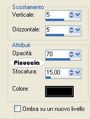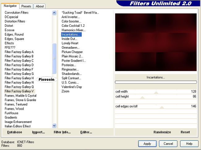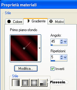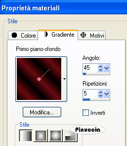 qui puoi trovare qualche risposta ai tuoi dubbi. Se l'argomento che ti interessa non è presente, ti prego di segnalarmelo. Per tradurre questo tutorial ho usato PSP X. Occorrente: Materiale qui I tubes sono di Maxyram, Brigitte e Sametra. Filtri: Simple qui Filters Unlimited 2.0 qui Filters Factory Gallery V qui I filtri Factory Gallery per essere usati devono prima essere convertiti. Come fare vedi qui Si usano importandoli in Filters Unlimited (come fare vedi qui) ma possono funzionare anche da soli ![]() Imposta il colore di primo piano con #000000, e il colore di sfondo con #690c11. Passa il colore di sfondo a Gradiente di primo piano/sfondo con i seguenti settaggi: ![]() 1. Apri una nuova immagine trasparente 700 x 500 pixels, e riempila con il gradiente.2. Regola>Sfocatura>Sfocatura gaussiana - raggio 15. ![]() 3. Effetti>Plugins>Filters Unlimited - Filter Factory Gallery V - Incantations: ![]() 4. Selezione>Seleziona tutto. Selezione>Modifica>Contrai - 100 pixel. 5. Selezione>Inverti. 6. Effetti>Plugins>Simple - Pizza Slice Mirror. 7. Effetti>Effetti di bordo>Aumenta. 8. Effetti>Effetti 3D>Sfalsa ombra: ![]() Ripeti l'Effetto Sfalsa ombra, cambiando verticale e orizzontale con -5. Selezione>Deseleziona. 9. Apri il tube Citynight e vai a Modifica>Copia. Torna al tuo lavoro e vai a Modifica>Incolla come nuovo livello. L'immagine è già correttamente posizionata. Non occorre spostarla. 10. Regola>Tonalità e saturazione>Viraggio. ![]() 11. Apri il tube con la donna. Immagine>Ridimensiona, a 500 pixels di altezza. Modifica>Copia. Torna al tuo lavoro e vai a Modifica>Incolla come nuovo livello. Sposta il tube a destra.12. Effetti>Effetti 3D>Sfalsa ombra. ![]() Ripeti l'Effetto Sfalsa ombra, cambiando verticale e orizzontale con -5. Regola>Messa a fuoco>Metti a fuoco. 13. Livelli>Unisci>Unisci visibile. 14. Immagine>Aggiungi bordatura, 1 pixel, simmetriche, con il colore nero. Immagine>Aggiungi bordatura, 28 pixels, simmetriche, con il colore di sfondo. Seleziona questo bordo con la bacchetta magica ![]() Cambia i settaggi del gradiente, togliendo la spunta a Inverti. ![]() Riempi la selezione con questo gradiente.15. Effetti>Effetti 3D>Smusso a incasso. ![]() 16. Selezione>Deseleziona. Immagine>Aggiungi bordatura, 1 pixel, simmetriche, con il colore nero. 17. Imposta il colore di sfondo con il colore rosso. Attiva lo strumento Testo , font Unsteady Oversteer, dimensione 72,e scrivi SKYLINE. Livelli>Converti in livello raster. 18. Effetti>Effetti 3D>Smusso a incasso: ![]() 19. Effetti>Effetti 3D>Sfalsa ombra: ![]() 20. Apri il tube con il vaso e vai a Modifica>Copia. Torna al tuo lavoro e vai a Modifica>Incolla come nuovo livello. Regola>Tonalità e saturazione>Viraggio, con i settaggi precedenti. 21. Sposta il tube in basso a sinistra.Effetti>Effetti 3D>Sfalsa ombra: ![]() Ripeti l'Effetto Sfalsa ombra cambiando verticale e orizzontale con i valori positivi. ![]() Livelli>Unisci>Unisci tutto. Per lo script ti occorre anche un'immagine di sfondo. Per realizzare lo script di Jeannette - che trovi nel materiale - puoi seguire i soliti preliminari descritti alla fine di questo tutorial, e sostituire le immagini, con le dovute variazioni, come spiegato nei precedenti tutorial. Se hai problemi o dubbi, o trovi un link non funzionante, o anche soltanto per un saluto, scrivimi. 26 Ottobre 2009 |