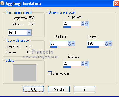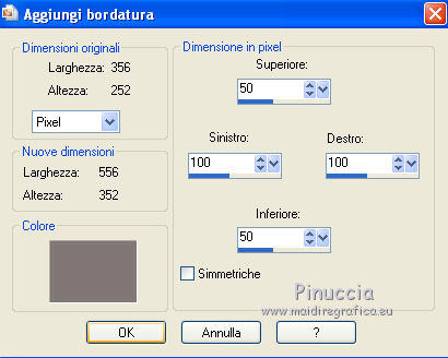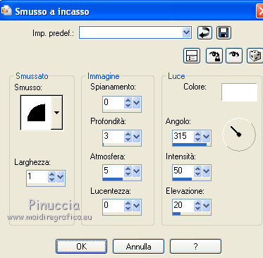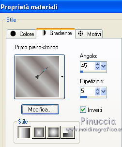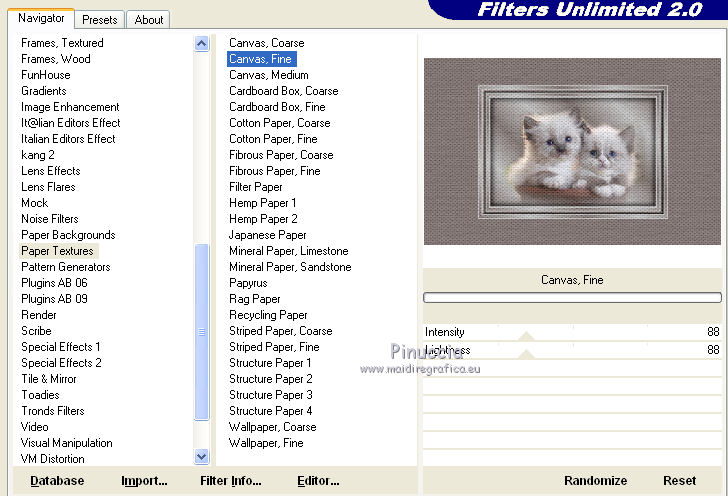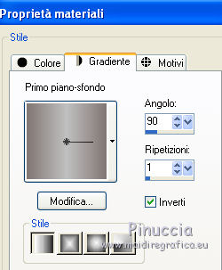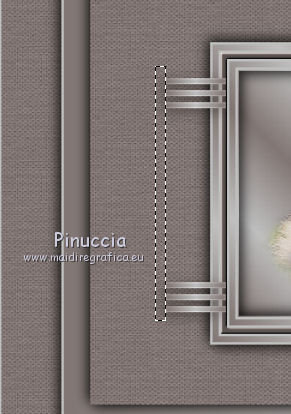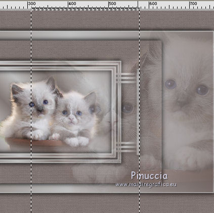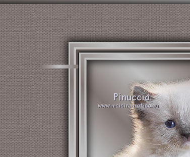 qui puoi trovare qualche risposta ai tuoi dubbi. Se l'argomento che ti interessa non è presente, ti prego di segnalarmelo. Per tradurre questo tutorial ho usato PSP X. Occorrente: Materiale qui Il tube è di Jeannette. Filtri: Filters Unlimited qui Imposta il colore di primo piano con #c0c0c0. e il colore di sfondo con #817673. Passa il colore di primo piano a Gradiente: ![]() Passa il colore di sfondo a Gradiente con i seguenti settaggi: ![]() 1. Apri il tube con i gattini, duplicalo con la combinazione di tasti maiuscola+d e chiudi l'originale. La copia sarà la base del tuo lavoro. 2. Elimina il livello del watermark. Se vuoi, puoi cambiare il livello di sfondo con un altro sfondo, a tua scelta. Livelli>Unisci>Unisci visibile. Immagine>Ridimensiona, a 310 pixels di larghezza. 3. Immagine>Aggiungi bordatura, 2 pixels, simmetriche, con il colore di primo piano. Immagine>Aggiungi bordatura, 5 pixels, simmetriche, con il colore di sfondo. Immagine>Aggiungi bordatura, 2 pixels, simmetriche, con il colore di primo piano. 4. Seleziona con la bacchetta magica il bordo centrale,e riempilo con il gradiente di sfondo (tasto destro del mouse).Selezione>Deseleziona. 5. Selezione>Seleziona tutto. Selezione>Modifica>Contrai - 10 pixels. Selezione>Inverti. 6. Effetti>Effetti 3D>Sfalsa ombra: ![]() Ripeti l'Effetto Sfalsa ombra, cambiando verticale e orizzontale con -3. Selezione>Deseleziona. 7. Immagine>Aggiungi bordatura, 5 pixels, simmetriche, con il colore di sfondo. Immagine>Aggiungi bordatura, 2 pixels, simmetriche, con il colore di primo piano. Immagine>Aggiungi bordatura, 5 pixels, simmetriche, con il colore di sfondo. Seleziona questo bordo con la bacchetta magica ![]() e riempilo con il gradiente di sfondo.Selezione>Deseleziona. Immagine>Aggiungi bordatura, 2 pixels, simmetriche, con il colore di primo piano. 8. Seleziona con la bacchetta magica il bordo scuro centrale.Effetti>Effetti 3D>Smusso a incasso. ![]() Selezione>Deseleziona. 9. Immagine>Aggiungi bordatura, simmetriche non selezionato, con il colore di sfondo. ![]() Seleziona il bordo con la bacchetta magica ![]() Effetti>Plugins>Filters Unlimited - Paper Textures - Canvas,Fine. ![]() 10. Selezione>Inverti. Effetti>Effetti 3D>Sfalsa ombra. ![]() Ripeti l'Effetto Sfalsa ombra, cambiando verticale e orizzontale con -3. Selezione>Deseleziona. 11. Immagine>Aggiungi bordatura, 2 pixels, simmetriche, con il colore di primo piano. 12. Immagine>Aggiungi bordatura, simmetriche non selezionato: ![]() Seleziona il bordo con la bacchetta magica ![]() e riempilo con il gradiente di primo piano.13. Selezione>Inverti. Effetti>Effetti 3D>Sfalsa ombra. ![]() Ripeti l'Effetto Sfalsa ombra, cambiando verticale e orizzontale con -3. Selezione>Deseleziona. 14. Immagine>Aggiungi bordatura, 2 pixels, simmetriche, con il colore di primo piano. Immagine>Aggiungi bordatura, 50 pixels, simmetriche, con il colore di sfondo. Seleziona questo bordo con la bacchetta magica ![]() Effetti>Plugins>Filters Unlimited, con i settaggi precedenti. Selezione>Inverti. Effetti>Effetti 3D>Sfalsa ombra, con i settaggi precedenti. Selezione>Deseleziona. 15. Immagine>Aggiungi bordatura, 2 pixels, simmetriche, con il colore di primo piano. 16. Apri una nuova immagine trasparente 50x5 pixels, e riempila con il gradiente di primo piano.Modifica>Copia. Torna al tuo lavoro e via a Modifica>Incolla come nuovo livello. Sposta la piccola striscia come nell'esempio.![]() 17. Effetti>Effetti 3D>Sfalsa ombra: ![]() Regola>Messa a fuoco>Metti a fuoco. 18. Livelli>Duplica, 2 volte, e sposta le barrette una sottol'altra.19. Chiudi il livello di sfondo. Livelli>Unisci>Unisci visibile. Riapri il livello di sfondo. 20. Modifica>Copia (stai copiando il livello Uniti). Modifica>Incolla come nuova immagine, e minimizza l'immagine, che userai più tardi. 21. Torna al tuo lavoro. Livelli>Duplica, e sposta le barrette a destra della cornice, un po' più in basso.22. Attiva il livello superiore. Livelli>Unisci>Unisci giù. 23. Attiva lo strumento Selezione , rettangolo,e traccia un rettangolo come nell'esempio. ![]() 24. Livelli>Nuovo livello raster. Riempi la selezione con il gradiente di primo piano.25. Effetti>Effetti 3D>Sfalsa ombra. ![]() Regola>Messa a fuoco>Metti a fuoco. Selezione>Deseleziona. 26. Livelli>Unisci>Unisci giù. 27. Livelli>Duplica. Immagine>Rifletti. Posiziona correttamente l'immagine a destra.Livelli>Unisci>Unisci visibile. 28. Attiva nuovamente il tube originale dei gattini. Immagine>Rifletti. Modifica>Copia. Torna al tuo lavoro e vai a Modifica>Incolla come nuovo livello. Sposta il tube a destra.29. Abbassa l'opacità di questo livello al 30%. 30. Attiva lo strumento Selezione , rettangolo,e traccia una selezione come nell'esempio. ![]() Premi sulla tastiera il tasto CANC. Selezione>Deseleziona. 31. Livelli>Unisci>Unisci visibile. 32. Attiva l'immagine con le tre barrette che hai messo da parte e vai a Modifica>Copia. Torna al tuo lavoro e vai a Modifica>Incolla come nuovo livello. Livelli>Duplica, 3 volte. E posizionane due a sinistra, e due a destra.33. Apri il tube strikje e vai a Modifica>Copia. Torna al tuo lavoro e vai a Modifica>Incolla come nuovo livello. Sposta il nastro tra i bordi, come nel mio esempio.Livelli>Unisci>Unsici visibile e salva in formato jpg. Se hai problemi o dubbi, o trovi un link non funzionante, o anche soltanto per un saluto, scrivimi. 2 Settembre 2010 |