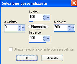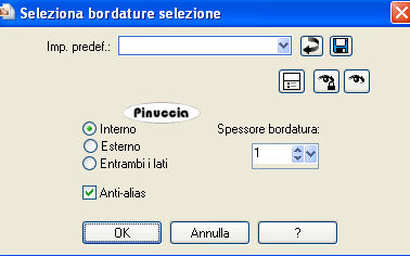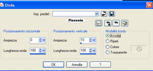 qui puoi trovare qualche risposta ai tuoi dubbi. Se l'argomento che ti interessa non è presente, ti prego di segnalarmelo. Per tradurre questo tutorial ho usato PSP X. Occorrente: Materiale qui I tubes sono di Azyzam, Lisa e Jeannette. Filtri: Greg's Factory Output II qui Imposta il colore di primo piano con #066B79. 1. Apri una nuova immagine trasparente 700 x 500 pixels, e riempila con il colore di primo piano.2. Effetti>Plugins>Greg's Factory Output - Poolshadow: ![]() 3. Attiva lo strumento Selezione ,clicca sull'icona Selezione personalizzata ![]() e imposta i seguenti settaggi: ![]() 4. Effetti>Effetti di bordo>Aumenta di più. 5. Selezione>inverti. 6. Livelli>Duplica. 7. Effetti>Effetti di riflesso>Caleidoscopio. ![]() 8. Abbassa l'opacità di questo livello al 50%. 9. Livelli>Unisci>Unisci visibile. Mantieni selezionato. 10. Selezione>inverti. 11. Selezione>Modifica>Seleziona bordature selezione: ![]() 12. Livelli>Nuovo livello raster. Riempi con il colore chiaro, clicca esattamente nella selezione.eventualmente, usa lo zoom usando la rotellina del mouse per ingrandire lo spazio ristretto da riempire 13. Selezione>Deseleziona. 14. Effetti>Plugins>Greg's Factory Output - Poolshadow, con i settaggi standard: ![]() 15. Effetti>Effetti 3D>Sfalsa ombra: ![]() 16. Livelli>Duplica. 17. Effetti>Effetti di distorsione>Onda: ![]() 18. Apri il tube di Lisa e vai a Modifica>Copia. Torna al tuo lavoro e vai a Modifica>Incolla come nuovo livello. Sposta il tube contro il bordo a destra.Nella paletta dei livelli abbassa l'opacità al 45%. 19. Livelli>Duplica. 20. Immagine>Rifletti. Sposta il duplicato a sinistra correttamente sovrapposto al precedente.21. Nella paletta dei livelli sposta il livello con l'onda (copia di Raster 1) in alto: ![]() 22. Apri il tube con la donna. Immagine>Ridimensiona, a 495 pixels di altezza. 23. Attiva lo strumento Selezione a mano libera , da punto a punto.![]() 24. Seleziona il viso della donna: ![]() 25. Selezione>Inverti. 26. Attiva lo strumento Sostituzione colore ![]() questo strumento di PSP X2 non si trova in PSP X. Se stai usando versioni precedenti a X2, puoi saltare questo passaggio 27. Clicca con il mouse una volta sui capelli e una volta sulla gonna come nell'immagine. ![]() 28. Selezione>Deseleziona. 29. Modifica>Copia. Torna al tuo lavoro e vai a Modifica>Incolla come nuovo livello. Sposta il tube un po' più a destra e in basso.30. Effetti>Effetti 3D>Sfalsa ombra: ![]() Ripeti l'Effetto Sfalsa ombra, cambiando verticale e orizzontale con -15. 31. Apri il tube con la lancia e vai a Modifica>Copia. Torna al tuo lavoro e vai a Modifica>incolla come nuovo livello. 32. Immagine>Ruota per gradi - 25 gradi a sinistra: ![]() 33. Nella paletta dei livelli sposta questo livello sotto il livello della donna. 34. Livelli>Unisci>Unisci tutto. 35. Immagine>Aggiungi bordatura, 2 pixels, simmetriche, con il colore bianco. Seleziona questo bordo con la bacchetta magica ![]() Livelli>Nuovo livello raster. Riempi il livello con il colore di primo piano.36. Effetti>Plugins>Greg's Factory output - Poolshadow, con i settaggi standard. 37. Effetti>Effetti 3D>Sfalsa ombra: ![]() Ripeti l'Effetto Sfalsa ombra cambiando verticale e orizzontale con -2. 38. Livelli>Unisci>Unisci tutto. L'immagine è finita. Se vuoi realizzare lo script, ti occorrono anche di due immagini di sfondo e dovrai inserire l'immagine principale 2 volte. Per realizzare lo script - che trovi qui puoi seguire i soliti preliminari descritti alla fine di questo tutorial, e sostituire le immagini, con le dovute variazioni, come spiegato nei precedenti tutorial. Se hai problemi o dubbi, o trovi un link non funzionante, o anche soltanto per un saluto, scrivimi. 7 Marzo 2009 |