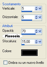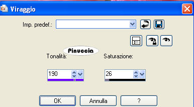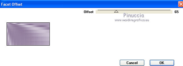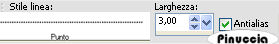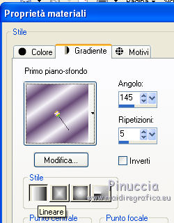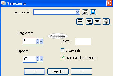 Imposta il colore di primo piano con #f5f3f8, e il colore di sfondo con #674a76. Passa il colore di primo piano a Gradiente di primo piano/sfondo con i seguenti settaggi: ![]() 1. Apri una nuova immagine trasparente 750 x 400 pixels, e riempila con il gradiente.2. Regola>Sfocatura>Sfocatura gaussiana - raggio 60. ![]() 3. Effetti>Plugins>Funhouse - Facet Offset: ![]() 4. Effetti>Effetti di bordo>Aumenta. 5. Apri il tube del fiore e vai a Modifica>Copia. Torna al tuo lavoro e vai a Modifica>Incolla come nuovo livello. Sposta il tube in alto a destra.6. Regola>Tonalità e Saturazione>Viraggio: ![]() 7. Effetti>Plugins>FM Tile Tools - Blend Emboss, con i settaggi standard. ![]() 8. Abbassa l'opacità di questo livello al 63%. Livelli>Unisci>Unisci visibile. 9. Immagine>Aggiungi bordatura, 2 pixels, simmetriche, con il colore di sfondo. Immagine>Aggiungi bordatura, 25 pixels, simmetriche, con il colore di primo piano. Seleziona questo bordo con la bacchetta magica ![]() e riempilo con il gradiente.10. Effetti>Effetti di trama>Veneziana (con il colore bianco): ![]() 11. Effetti>Effetti 3D>Sfalsa ombra: ![]() Selezione>Deseleziona. 12. Immagine>Aggiungi bordatura, 3 pixels, simmetriche, con il colore nero. Seleziona questo bordo con la bacchetta magica ![]() e riempilo con il gradiente.13. Effetti>Effetti 3D>sfalsa ombra: ![]() Ripeti l'Effetto Sfalsa ombra, cambiando verticale e orizzontale con -1. Selezione>Deseleziona. 14. Immagine>Aggiungi bordatura, 15 pixels, simmetriche, con il colore di sfondo. Seleziona questo bordo con la bacchetta magica ![]() e riempilo con il gradiente.15. Effetti>Plugins>Cybia Screenworks - Pin Hole. Livelli>Nuovo livello raster. Riempi con il gradiente.Abbassa l'opacità di questo livello al 65%. 16. Effetti>Effetti 3D>Sfalsa ombra: ![]() Ripeti l'Effetto Sfalsa ombra, cambiando verticale e orizzontale con -1. Selezione>Deseleziona. Livelli>Unisci>Unisci tutto. 17. Immagine>Aggiungi bordatura, 3 pixels, simmetriche, con il colore nero. Seleziona questo bordo con la bacchetta magica ![]() e riempilo con il gradiente.Ripeti l'Effetto Sfalsa ombra, con i settaggi precedenti. Selezione>Deseleziona. 18. Apri il tube della donna e vai a Modifica>Copia. Torna al tuo lavoro e vai a Modifica>Incolla come nuovo livello. Sposta il tube a sinistra.19. Effetti>Effetti 3D>Sfalsa ombra: ![]() Ripeti l'Effetto Sfalsa ombra, con i seguenti settaggi: ![]() Regola>Messa a fuoco>Metti a fuoco. 20. Livelli>Unisci>Unisci tutto. 21. Duplica l'immagine usando la combinazione shift+D. Immagine>Ridimensiona, a 250 pixels di larghezza. Modifica>Copia. 22. Torna al tuo lavoro e vai a Modifica>Incolla come nuovo livello. Effetti>Effetti 3D>sfalsa ombra: ![]() Sposta l'immagine in alto a destra (vedi il mio esempio).23. Livelli>Duplica. Immagine>Rifletti. Sposta l'immagine sotto la precedente.24. Attiva il livello inferiore. 25. Attiva lo strumento Penna - stile linea "Punto", con i seguenti settaggi: ![]() Traccia una linea dall'alto in basso lungo il bordo della cornice. Livelli>Converti in livello raster. Effetti>Effetti 3D>Sfalsa ombra: ![]() Livelli>Duplica, e posiziona la seconda linea sul bordo destro delle cornici. 27. Apri il tube "knopje" e vai a Modifica>Copia. Torna al tuo lavoro e vai a Modifica>Incolla come nuovo livello. Livelli>Duplica, quante volte necessarie per posizionare il bottone in ogni angolo delle piccole cornici.28. Livelli>Unisci>Unisci tutto. 29. Passa il colore di sfondo a gradiente. Attiva lo strumento Testo e scrivi un testo sull'immagine.Effetti>Effetti 3D>Sfalsa ombra: ![]() Regola>Messa a fuoco>Metti a fuoco. Livelli>Unisci>Unisci tutto e salva in formato jpg. L'immagine è finita. Se vuoi realizzare lo script ti servirà anche un'immagine di sfondo. Per realizzare lo script - che trovi qui puoi seguire i soliti preliminari descritti alla fine di questo tutorial, e sostituire le immagini, con le dovute variazioni, come spiegato nei precedenti tutorial. Se hai problemi o dubbi, o trovi un link non funzionante, o anche soltanto per un saluto, scrivimi. 17 Luglio 2009 |