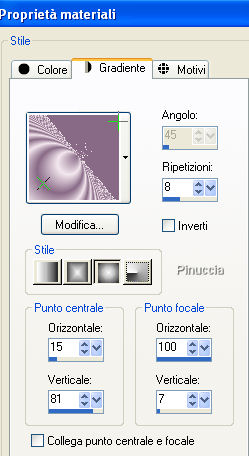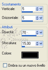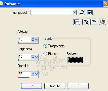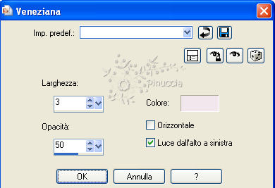 qui puoi trovare qualche risposta ai tuoi dubbi. Se l'argomento che ti interessa non è presente, ti prego di segnalarmelo. Per tradurre questo tutorial ho usato PSP X. Occorrente: Materiale qui I tubes sono di Colombe, Filly e Marlies. Filtri: Screenworks qui Greg's Factory Output II qui FM Tile Tools qui ![]() Se non vuoi sentire la musica premi il tasto ESC Imposta il colore di primo piano con #886986, e il colore di sfondo con #f3e7ee. Passa il colore di primo piano a Gradiente di primo piano/sfondo con i seguenti settaggi: ![]() 1. Apri una nuova immagine trasparente 750 x 500 pixels, e riempila con il gradiente.2. Clicca con la bacchetta magica sulla parte colorata a destra,e premi sulla tastiera il tasto CANC ![]() Selezione>Deseleziona. 3. Livelli>Duplica. Immagine>Rifletti. Sposta le due immagini una contro l'altra, lasciando uno spazio tra 200 e 550 pixels.![]() 4. Livelli>Nuovo livello raster. Riporta il colore di primo piano da gradiente a Colore. Riempi con il colore di primo piano.5. Effetti>Effetti di trama>Veneziana. ![]() 6. Livelli>Disponi>Porta sotto. ![]() 7. Attiva il livello superiore. 8. Apri il tube con i fiori, che ha i livelli chiusi. Apri e attiva il livello del tube e vai a Modifica>Copia. Torna al tuo lavoro e vai a Modifica>Incolla come nuovo livello. Sposta il tube in alto a destra.9. Effetti>Plugins>FM Tile Tools - Blend Emboss - 2 volte. ![]() Abbassa l'opacità di questo livello al 33%. 10. Apri il tube della donna e vai a Modifica>Copia. Torna al tuo lavoro e vai a Modifica>Incolla come nuovo livello. Sposta il tube a sinistra, appoggiando il taglio del gomito contro il bordo dell'immagine.11. Effetti>Effetti 3D>Sfalsa ombra: ![]() Ripeti l'Effetto Sfalsa ombra, cambiando verticale e orizzontale con -5. Regola>Messa a fuoco>Metti a fuoco. 12. Attiva lo strumento Penna , stile linea Punto:![]() 13. Traccia una linea in alto (se tieni premuto il tasto della maiuscola avrai una linea diritta). ![]() Livelli>Converti in livello raster. 14. Effetti>Effetti 3D>Sfalsa ombra: ![]() Regola>Messa a fuoco>Metti a fuoco - 3 volte. 15. Apri il tube "Tekst" e vai a Modifica>Copia. Torna al tuo lavoro e vai a Modifica>Incolla come nuovo livello. Sposta il tube sulle lineette.16. Effetti>Effetti 3D>sfalsa ombra: ![]() 17. Attiva lo strumento Gomma ![]() e cancella il pezzetto degli anelli a destra: ![]() in modo che l'anello sembri appeso sulla linea. ![]() 18. Apri il tube del gatto e vai a Modifica>Copia. Torna al tuo lavoro e vai a Modifica>Incolla come nuovo livello. Sposta il tube a destra, come nel mio esempio.19. Controlla che tutto sia al posto giusto e vai a Livelli>Unisci>Unisci visibile. 20. Effetti>Effetti 3D>Pulsante: ![]() 21. Immagine>Aggiungi bordatura, 1 pixel, simmetriche, con il colore di sfondo. Immagine>Aggiungi bordatura, 10 pixels, simmetriche, con il colore di primo piano. Seleziona questo bordo con la bacchetta magica ![]() Effetti>Plugins>Greg's Factory Output II - Poolshadow, con i settaggi standard: ![]() 22. Effetti>Plugins>Screenworks - Bot Screen. Regola>Messa a fuoco>Metti a fuoco - 2 volte. 23. Livelli>Nuovo livello raster. Riempi il livello con il colore di sfondo.Abbassa l'opacità di questo livello al 42%. Selezione>Deseleziona. 24. Immagine>Aggiungi bordatura, 1 pixel, simmetriche, con il colore di sfondo. L'immagine è finita. Per lo script serve anche un'immagine di sfondo. Per realizzare lo script - che trovi qui puoi seguire i soliti preliminari descritti alla fine di questo tutorial, e sostituire le immagini, con le dovute variazioni, come spiegato nei precedenti tutorial. Se hai problemi o dubbi, o trovi un link non funzionante, o anche soltanto per un saluto, scrivimi 9 Agosto 2009 |