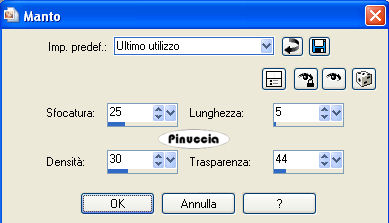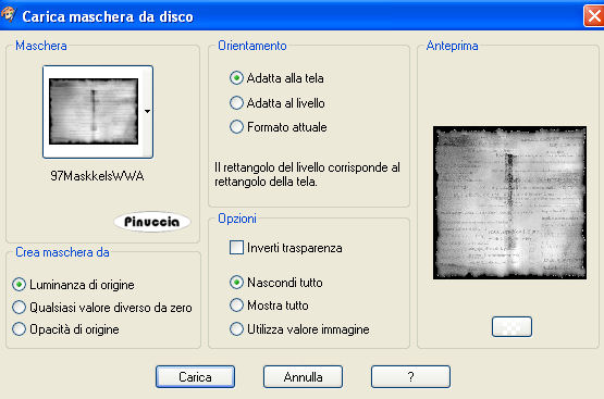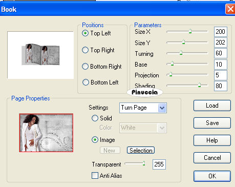qui puoi trovare qualche risposta ai tuoi dubbi. Se l'argomento che ti interessa non è presente, ti prego di segnalarmelo. Per tradurre questo tutorial ho usato PSP X. Occorrente: Materiale qui I tubes sono di Lut e Friemelien. Metti la maschera97Maskkels nella cartella Maschere. Apri il font e minimizzalo nella tua area di lavoro. Lo troverai nella lista dei font disponibili quando ti servirà. Filtri: Greg's Factory Output II qui Vizros qui Imposta il colore di primo piano con #EBEBEB, e il colore di sfondo con il bianco #808080. 1. Apri una nuova immagine trasparente 700 x 500 pixels, e riempila con il colore di sfondo.2. Livelli>Nuovo livello raster. Riempi con il colore di primo piano.3. Effetti>Plugins>Greg's Factory - Pool Shadow: ![]() 4. Livelli>Carica/Salva maschera>Carica maschera da disco. Cerca e carica la maschera 97Maskkels: ![]() 5. Livelli>Elimina e rispondi sì alla domanda Unire la maschera nel livello corrente: ![]() 6. Livelli>Unisci>Unisci gruppo. 7. Apri il tube con il fiore. Posizionati sul livello del tube. 8. Regola>Tonalità e saturazione>Viraggio: ![]() 9. Modifica>Copia. Torna al tuo lavoro e vai a Modifica>Incolla come nuovo livello. Sposta il tube in alto a destra.10. Regola>Messa a fuoco>Metti a fuoco, 3 volte. Abbassa l'opacità di questo livello al 42%. 11. Apri il tube con la donna. Immagine>Ridimensiona, a 550 pixels di altezza. 12. Modifica>Copia. Torna al tuo lavoro e vai a Modifica>Incolla come nuovo livello. Sposta il tube a sinistra.13. Effetti>Effetti 3D>Sfalsa ombra: ![]() Ripeti l'Effetto Sfalsa ombra, cambiando verticale e orizzontale con -5. 14. Duplica l'immagine usando sulla tastiera la combinazione di tasti shift(maiuscola)+D e metti da parte la copia che userai più tardi. 15. Apri il tube Diamantkrul e vai a Modifica>Copia. Torna al tuo lavoro e vai a Modifica>Incolla come nuovo livello. Sposta il tube in basso a destra.16. Effetti>Effetti 3D>Sfalsa ombra: ![]() Regola>Messa a fuoco>Metti a fuoco. 17. Livelli>Unisci>Unisci visibile. 18. Effetti>Plugins>Vizros - Book, con i seguenti settaggi: ![]() 19. Attiva lo strumento Bacchetta magica ![]() ![]() e clicca sullo sfondo bianco. ![]() 20. Selezione>Inverti. Selezione>Modifica>Contrai - 1 pixel. 21. Modifica>Copia. Modifica>Incolla come nuova IMMAGINE. 22. Seleziona con la bacchetta magica nello spazio grigio, se necessario anche più volte per selezionare tutto lo spazio.![]() 23. Effetti>Plugins>Greg's Factory - Pool Shadow: ![]() Selezione>Deseleziona. 23. Attiva lo strumento Testo , con i seguenti settaggi (attenzione: direzione verticale selezionato).![]() 25. Scrivi Mode (o quello che preferisci). 26. Livelli>Converti in livello raster. Effetti>Effetti 3D>Sfalsa ombra: ![]() 27. Livelli>Unisci>Unisci visibile. Modifica>Copia. 28. Attiva l'immagine che hai messo da parte al punto 13 e vai a Modifica>Incolla come nuovo livello. 29. Immagine>Ruota per gradi - 20 gradi a destra: ![]() 30. Sposta l'immagine in basso a destra.Abbassa l'opacità di questo livello all'81%. 31. Effetti>Effetti 3D>sfalsa ombra: ![]() 32. Apri il tube Hoedenspeld, Modifica>Copia. Torna al tuo lavoro e vai a Modifica>Incolla come nuovo livello. Spostalo sopra il libro.33. Effetti>Effetti 3D>Sfalsa ombra: ![]() 34. Livelli>Unisci>Unisci visibile. 35. Immagine>Aggiungi bordatura, 1 pixel, simmetriche, con un colore grigio scuro (più scuro del colore di sfondo). Immagine>Aggiungi bordatura, 10 pixels, simmetriche, con il colore di primo piano. Immagine>Aggiungi bordatura, 1 pixels, simmetriche, con il colore nero. 36. Seleziona il bordo chiaro con la bacchetta magica ![]() 37. Effetti>Effetti di trama>Manto: ![]() 38. Regola>Messa a fuoco>Metti a fuoco - 3 volte. Selezione>Deseleziona. Firma il tuo lavoro e salva in formato jpg. Se vuoi realizzare lo script, ti occorrono anche due immagini di sfondo. Per realizzare lo script - che trovi qui puoi seguire i soliti preliminari descritti alla fine di questo tutorial, e sostituire le immagini, con le dovute variazioni, come spiegato nei precedenti tutorial. Se hai problemi o dubbi, o trovi un link non funzionante, o anche soltanto per un saluto, scrivimi. 4 Febbraio 2009 |