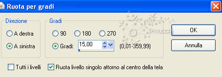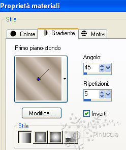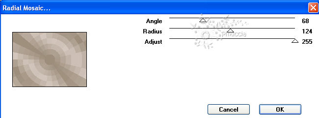 qui puoi trovare qualche risposta ai tuoi dubbi. Se l'argomento che ti interessa non è presente, ti prego di segnalarmelo. Per tradurre questo tutorial ho usato PSP X. Occorrente: Materiale qui Filtri: VM Toolbox qui Imposta il colore di primo piano con #9d8e7b, e il colore di sfondo con #d4c7be. Passa il colore di primo piano a Gradiente di primo piano/sfondo con i seguenti settaggi: ![]() 1. Apri una nuova immagine trasparente 750 x 550 pixels, e riempila con il gradiente.2. Effetti>Plugins>VM Toolbox - Radial Mosaic: ![]() 3. Effetti>Effetti di bordo>Aumenta di più. 4. Livelli>Nuovo livello raster. Riempi il livello con il colore di primo piano.Abbassa l'opacità di questo livello al 50%. Livelli>Unisci>Unisci visibile. 5. Selezione>Seleziona tutto. Selezione>Modifica>Contrai - 50 pixels. 6. Selezione>Inverti. Regola>Sfocatura>Sfocatura gaussiana - raggio 15. ![]() 7. Effetti>Effetti 3D>sfalsa ombra: ![]() Ripeti l'Effetto Sfalsa ombra con i seguenti settaggi: ![]() 8. Selezione>Modifica>Seleziona bordature selezione: ![]() 9. Livelli>Nuovo livello raster. Riempi con il gradiente.Attenzione a riempire entrambe le selezioni; eventualmente ingrandisci l'immagine per vedere meglio l'area da selezionare. Se imposti lo strumento Riempimento in modalità di corrispondenza "Nessuno", basterà un solo clic. 10. Regola>Messa a fuoco>Metti a fuoco. Selezione>Deseleziona. 11. Apri il tube con il fiore e vai a Modifica>copia. Torna al tuo lavoro e vai a Modifica>Incolla come nuovo livello. Sposta il tube un po' più a destra.12. Regola>Tonalità e saturazione>Viraggio: ![]() 13. Apri il tube di Maxima e vai a Modifica>Copia. Torna al tuo lavoro e vai a Modifica>Incolla come nuovo livello. Immagine>Ruota per gradi - 15 gradi a sinistra: ![]() 14. Sposta il tube un po' più a sinistra.![]() 15. Apri il tube lijstje e duplicalo due volte (sulla tastiera combinazione di tasti maiuscola+D). Avrai 3 cornici. ![]() 16. Apri il tube di un bambino e vai a Modifica>Copia. Attiva una cornice e vai a Modifica>Incolla come nuovo livello. Livelli>Unisci>Unisci visibile. Ripeti per gli altri due bambini. Avrai l'immagine dei tre bambini in cornice. ![]() 17. Copia e incolla le tre immagini sul tuo lavoro. Su ogni livello di queste immagini: Effetti>Effetti 3D>sfalsa ombra: ![]() 18. Attiva il livello del bambino al centro. Immagine>Ruota per gradi, con i settaggi precedenti. 19. Apri il tube knopje e vai a Modifica>Copia. Torna al tuo lavoro e vai a Modifica>Incolla come nuovo livello. Effetti>Effetti 3D>Sfalsa ombra: ![]() Livelli>Duplica, 2 volte e posiziona una vite su ogni cornice.20. Apri il tube dell'angolo e vai a Modifica>Copia. Torna al tuo lavoro e vai a Modifica>Incolla come nuovolivello. Effetti>Effetti 3D>sfalsa ombra: ![]() Posiziona l'angolo, e ripeti il passaggio per gli altri tre angoli. 21. Quando hai finito e hai controllato che tutto sia al posto giusto: Livelli>Unisci>Unisci visibile. 22. Imposta il colore di sfondo con il gradiente. Attiva lo strumento Testo , scegli un font e scrivi un testo sull'immagine.Livelli>Converti in livello raster. 23. Effetti>Effetti 3D>Sfalsa ombra: ![]() Aggiungi il tuo nome e/o il tuo watermark. 24. Livelli>Unisci>Unisci tutto e salva in formato jpg. L'immagine è finita. Se vuoi realizzare lo script ti servirà anche un'immagine di sfondo. Per realizzare lo script - che trovi qui puoi seguire i soliti preliminari descritti alla fine di questo tutorial, e sostituire le immagini, con le dovute variazioni, come spiegato nei precedenti tutorial. Se hai problemi o dubbi, o trovi un link non funzionante, o anche soltanto per un saluto, scrivimi. 16 Giugno 2009 |
