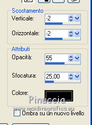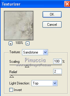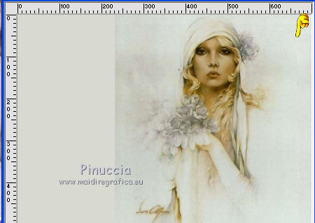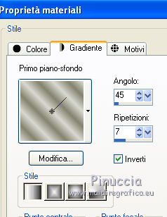 qui puoi trovare qualche risposta ai tuoi dubbi. Se l'argomento che ti interessa non è presente, ti prego di segnalarmelo. Per tradurre questo tutorial ho usato PSP X. Occorrente: Materiale qui L'immagine è di Sara Moon. Filtri: Texturizer qui Imposta il colore di primo piano con #84836f. e il colore di sfondo con #d8d9d1. 1. Apri una nuova immagine trasparente 700 x 500 pixels, e riempila con il colore di sfondo.2. Apri l'immagine di Sara Moon e vai a Modifica>Copia. Torna al tuo lavoro e vai a Modifica>Incolla come nuovo livello. 3. Livelli>Duplica. Immagine>Rifletti. Sposta l'immagine riflessa completamente a destra,e il primo livello contro questo in modo che non si veda la "cucitura" tra le due immagini. ![]() 4. Attiva il livello superiore e vai a Livelli>Unisci>Unisci giù. 5. Livelli>Duplica. Immagine>Rifletti. Sposta questo duplicato a sinistra, oltre il bordo.![]() 6. Abbassa l'opacità di questo livello al 32%. Livelli>Unisci>Unisci visibile. 7. Immagine>Aggiungi bordatura, 3 pixels, simmetriche, con il colore di primo piano. Seleziona questo bordo con la bacchetta magica ![]() e riempilo con il colore di sfondo.8. Effetti>Effetti 3D>Smusso a incasso. ![]() 9. Regola>Messa a fuoco>Metti a fuoco. Selezione>Deseleziona. 10. Immagine>Aggiungi bordatura, 7 pixels, simmetriche, con il colore di primo piano. Seleziona questo bordo con la bacchetta magica ![]() 11. Effetti>Plugins>Texture - Texturizer. ![]() 12. Regola>Messa a fuoco>Metti a fuoco. Effetti>Effetti 3D>Smusso a incasso. ![]() 13. Selezione>Deseleziona. 14. Immagine>Aggiungi bordatura, 3 pixels, simmetriche, con il colore di sfondo. 15. Ripeti i punti 8 e 9. 16. Immagine>Aggiungi bordatura, 15 pixels, simmetriche, con il colore di primo piano. Seleziona questo bordo con la bacchetta magica .Passa il colore di primo piano a Gradiente. ![]() Riempi la selezione con il gradiente.17. Effetti>Plugins>Texture - Texturizer, con i settaggi precedenti. 18. Effetti>Effetti 3D>Smusso a incasso, come al punto 8. Selezione>Deseleziona. 19. Attiva nuovamente l'immagine di Sara Moon. Immagine>Ridimensiona, a 175 pixels di altezza, tutti i livelli e mantieni proporzioni selezionati. 20. Ripeti i bordi dal punto 7 al punto 16, con la differenza che invece di 15 pixels aggiungi un bordo da 7 pixels. 21. Quando hai fatto, copia l'immagine: Modifica>Copia. Torna al tuo lavoro e vai a Modifica>Incolla come nuovo livello. Livelli>Duplica. Posiziona i due quadretti come nel mio esempio.22. Attiva il livello superiore dei due quadretti. Livelli>Unisci>Unisci giù. 23. Effetti>Effetti 3D>Sfalsa ombra: ![]() Salva in formato jpg. Se hai problemi o dubbi, o trovi un link non funzionante, o anche soltanto per un saluto, scrivimi. 4 Giugno 2011 |
