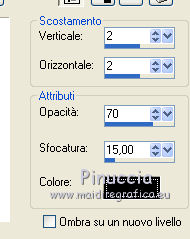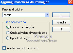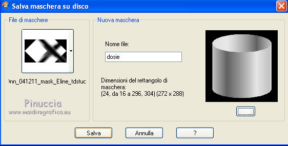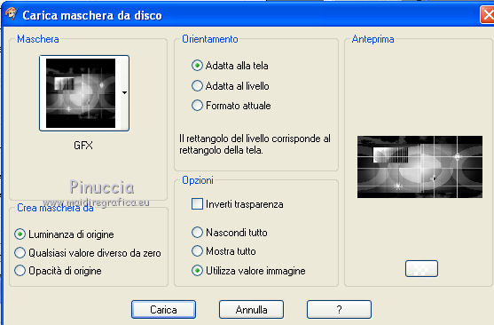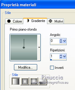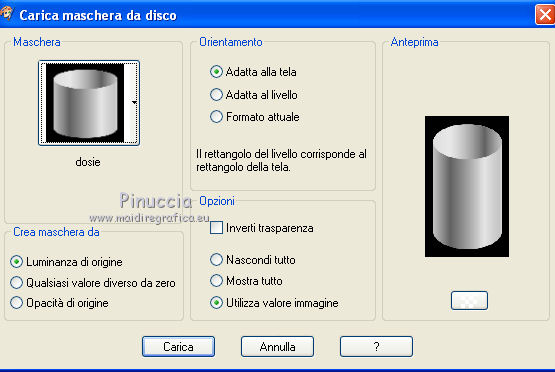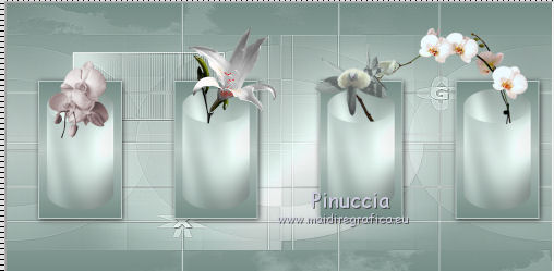 qui puoi trovare qualche risposta ai tuoi dubbi. Se l'argomento che ti interessa non è presente, ti prego di segnalarmelo. Per tradurre questo tutorial ho usato PSP X. Occorrente: Materiale qui Filtri: Greg's Factory Output vol.II qui Metti la maschera GFX nella cartella Maschere. Imposta il colore di primo piano con #738c85. e il colore di sfondo con #bcc9c5. Passa il colore di primo piano a Gradiente, con i seguenti settaggi. ![]() 1. Apri una nuova immagine trasparente 1000 x 500 pixels, e riempila con il gradiente.2. Livelli>Nuovo livello raster. Riempi con il colore di sfondo.3. Effetti>Plugins>Greg's Factory Output II - Pool shadow. ![]() se non vuoi aggiungere nuovi filtri nei Percorsi Files, ricorda che questo filtro è identico al Pool Shadow di Tramages e al Cross Shadow di Graphics Plus 4. Livelli>Carica/Salva maschera>Carica maschera da disco. Cerca e carica la maschera GFX. ![]() Livelli>Elimina e rispondi sì alla domanda Unire la maschera nel livello corrente. ![]() Livelli>unisci>Unisci gruppo. Effetti>Effetti di bordo>Aumenta. 5. Apri una nuova immagine trasparente 150 x 250 pixels, e riempila con il gradiente.6. Livelli>Nuovo livello raster. Riempi con il colore di sfondo.7. Effetti>Plugins>Greg's Factory Output II - Pool shadow. ![]() 8. Apri l'immagine Doosje. Livelli>Nuovo livello maschera>Da immagine. Essendo attiva l'immagine la troverai già sotto la finestra di origine. Clicca ok. ![]() Avrai questo. ![]() 9. Livelli>Carica>Salva maschera>Salva maschera su disco. Salva la maschera con lo stesso nome. ![]() In questo modo hai anche imparato a creare una maschera. 10. Attiva l'immagine 150x250. Carica/Salva maschera>Carica maschera da disco e carica la maschera che hai appena salvato. ![]() Livelli>Elimina e rispondi sì. Livelli>Unisci>Unisci tutto. 11. Immagine>Aggiungi bordatura, 2 pixels, simmetriche, con il colore di sfondo. 12. Modifica>Copia. Torna al tuo lavoro e vai a Modifica>Incolla come nuovo livello. Effetti>Effetti 3D>Sfalsa ombra. ![]() 13. Livelli>Duplica - 3 volte, in modo da avere quattro immagini. Posiziona le immagini come nel mio esempio,facendo attenzione che le due immagini esterne non siano troppo vicino al bordo. ![]() 14. Apri il primo tube dei fiori - orchidpeach_gbodcheryl406 - e vai a Modifica>Copia. Torna al tuo lavoro e vai a modifica>Incolla come nuovo livello. Posiziona il tube su una delle maschere.Cancella lo stelo che rimane visibile sotto quello che dovrebbe sembrare un vaso.![]() Effetti>Effetti 3D>Sfalsa ombra, con i settaggi precedenti. Regola>Messa a fuoco>Metti a fuoco. 15. Ripeti il passo 14 con gli altri tre tubes dei fiori forniti con il materiale. Alla fine dovresti avere questo. ![]() 16. Livelli>Unisci>Unisci visibile e salva in formato jpg. 17. Per realizzare lo script ti occorre anche il tube della donna. Apri il tube di Grisi e attiva il livello del tube. Modifica>Copia. Modifica>Incolla come nuova IMMAGINE. Salva in formato gif o png per conservare lo sfondo trasparente. Se hai problemi o dubbi, o trovi un link non funzionante, o anche soltanto per un saluto, scrivimi. 9 Giugno 2011 |