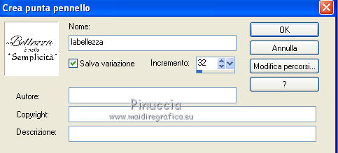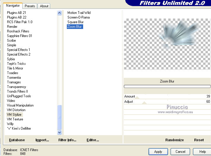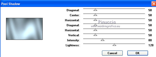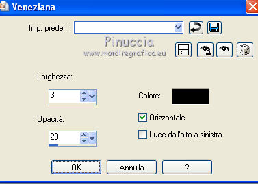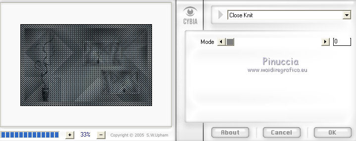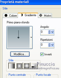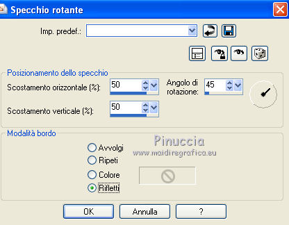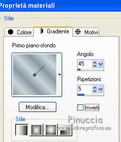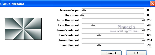 qui puoi trovare qualche risposta ai tuoi dubbi. Se l'argomento che ti interessa non è presente, ti prego di segnalarmelo. Per tradurre questo tutorial ho usato PSP X. Occorrente: Materiale qui Il tube è di Jo v Glabbeek. Filtri: se hai problemi con i filtri, ricorda di consultare la mia sezione filtri qui Greg's Factory Output qui Simple qui Cybia Screenworks qui VM Stylize qui Italian Editor Wipe Generator qui ![]() Imposta il colore di primo piano con #889ba5, e il colore di sfondo con #ccd4d7. Passa il colore di sfondo a Gradiente con i seguenti settaggi. ![]() 1. Apri una nuova immagine trasparente 750 x 450 pixels, e riempila con il gradiente.2. Effetti>Plugins>Italian Editor Wipe Generator - Clock Generator. ![]() 3. Effetti>Plugins>Simple - Blintz. 4. Effetti>Effetti di riflesso>Specchio rotante. ![]() 5. Regola>Messa a fuoco>Metti a fuoco. Livelli>Nuovo livello raster. Riempi con il colore di primo piano.Abbassa l'opacità di questo livello al 75%. 6. Effetti>Plugins>Greg's Factory Output II - Poolshadow. ![]() 7. Livelli>Unisci>Unisci visibile. 8. Apri il tube e vai a Modifica>Copia. Torna al tuo lavoro e vai a Modifica>Incolla come nuovo livello. Spostalo al centro dell'immagine.![]() Cambia la modalità di miscelatura di questo livello in Luminanza (esistente). 9. Duplica l'immagine usando la combinazione di tasti maiuscola+D e metti da parte la copia. 10. Continua sull'originale. Effetti>Effetti 3D>Sfalsa ombra. ![]() Livelli>Unisci>Unisci visibile. 11. Immagine>Ridimensiona, a 225 pixels di larghezza, tutti i livelli selezionato. Regola>Messa a fuoco>Metti a fuoco. 12. Immagine>Aggiungi bordatura, 1 pixel, simmetriche, con il colore di sfondo. Immagine>Aggiungi bordatura, 3 pixels, simmetriche, con il colore di primo piano. Immagine>Aggiungi bordatura, 1 pixel, simmetriche, con il colore di sfondo. 13. Immagine>Aggiungi bordatura, 5 pixels, simmetriche, con il colore di primo piano. Seleziona questo bordo con la bacchetta magica ![]() Effetti>Plugins>Greg's Factory Output II - Pool Shadow, come al punto 6. 14. Effetti>Effetti 3D>Smusso a incasso. ![]() 15. Selezione>Deseleziona. Immagine>Aggiungi bordatura, 1 pixel, simmetriche, con il colore di sfondo. 16. Immagine>Ridimensiona, a 150 pixels di altezza, tutti i livelli selezionato. Modifica>Copia. Attiva la copia che hai minimizzato prima. 17. Sposta il tube a sinistra.Abbassa l'opacità di questo livello all'86%. Regola>Messa a fuoco>Metti a fuoco. Livelli>Unisci>Unisci visibile. 18. Modifica>Incolla come nuovo livello. Immagine>Rifletti. Sposta la piccola immagine in alto a destra, pressappoco come nell'esempio.![]() 19. Livelli>Duplica. Attiva il livello sottostante dell'originale. 20. Effetti>Plugins>Filters Unlimited 2.0 - VM Stylize - Zoom Bloor. ![]() 21. Abbassa l'opacità di questo livello intorno al 40%, e sposta l'immagine un po' più in alto a destra.22. Livelli>Unisci>Unisci giù. 23. Attiva il livello superiore. Effetti>Effetti 3D>Sfalsa ombra. ![]() 24. Livelli>Duplica. Immagine>Rifletti. Sposta l'immagine un po' più in basso a destra.25. Controlla che tutto sia correttamente posizionato. Livelli>Unisci>Unisci tutto. 26. Immagine>Aggiungi bordatura, 1 pixel, simmetriche, con il colore di sfondo. Immagine>Aggiungi bordatura, 20 pixels, simmetriche, con il colore primo piano. Seleziona questo bordo con la bacchetta magica ![]() Cambia i settaggi del gradiente. ![]() Riempi la selezione con il gradiente.27. Effetti>Plugins>Cybia Screenworks - Close Knit. ![]() Livelli>Nuovo livello raster. Riempi con il gradiente.Abbassa l'opacità di questo livello intorno all'80%. Selezione>Deseleziona. Livelli>Unisci>Unisci visibile. 28. Immagine>Aggiungi bordatura, 1 pixel, simmetriche, con il colore di sfondo. Immagine>Aggiungi bordatura, 20 pixels, simmetriche, con il colore di primo piano. Seleziona questo bordo con la bacchetta magica ![]() Cambia i settaggi del gradiente, selezionando Inverti, e riempi la selezione con il gradiente.29. Effetti>Effetti di trama>Veneziana. ![]() 30. Regola>Messa a fuoco>Metti a fuoco. Selezione>Deseleziona. Immagine>Aggiungi bordatura, 1 pixel, simmetriche, con il colore di sfondo. 31. Apri il tube con il testo. File>Esporta>Pennello personalizzato - assegna un nome al pennello e ok. ![]() se vuoi usare il mio testo prendilo qui 32. Livelli>Nuovo livello raster. Attiva lo strumento Pennello ![]() cerca il pennello che hai esportato, e applicalo cliccando con il tasto destro del mouse per usare il colore di sfondo. 33. Sposta il testo dove preferisci.Effetti>Effetti 3D>Sfalsa ombra, con i settaggi precedenti. Regola>Messa a fuoco>Metti a fuoco - 2 volte. Livelli>Unisci>Unisci tutto. L'immagine principale è finita. Per realizzare lo script ti serviranno anche tre immagini di sfondo. 11. Per realizzare lo script - che trovi qui puoi seguire i soliti preliminari descritti alla fine di questo tutorial, e sostituire le immagini, con le dovute variazioni, come spiegato nei precedenti tutorial. Se hai problemi o dubbi, o trovi un link non funzionante, o anche soltanto per un saluto, scrivimi. |