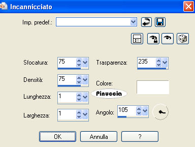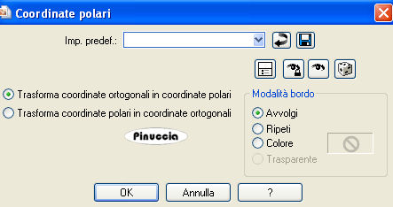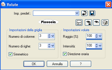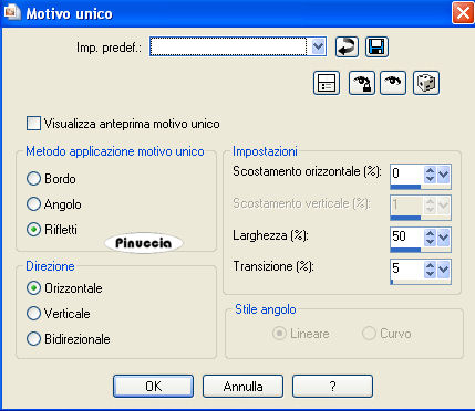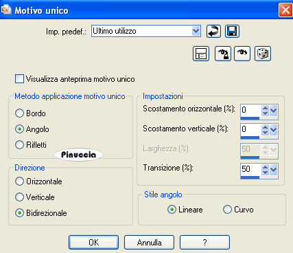 qui puoi trovare qualche risposta ai tuoi dubbi. Se l'argomento che ti interessa non è presente, ti prego di segnalarmelo. Per tradurre questo tutorial ho usato PSP X. Occorrente: Materiale qui Il tube della farfalla è di Suzi Sgai. La maschera è di Serena. Metti la maschera nella cartella Maschere. Imposta il colore di primo piano con il bianco #ffffff, e il colore di sfondo con #d5d5d5. 1. Apri una nuova immagine bianca 1000 x 500 pixels. 2. Selezione>Seleziona tutto. 3. Apri il tube di Suzi Sgai e vai a Modifica>Copia. non chiuderlo perchè ti servirà ancora Torna al tuo lavoro e vai a Modifica>Incolla nella selezione. Selezione>Deseleziona. 4. Regola>Sfocatura>Sfocatura gaussiana - raggio 40. ![]() 5. Effetti>Effetti di trama>Veneziana: ![]() 6. Effetti>Effetti di distorsione>Volute: ![]() 7. Effetti>Effetti di distorsione>Coordinate polari: ![]() 8. Effetti>Effetti di distorsione>Mulinello - 180 gradi: ![]() 9. Effetti>Effetti di immagine>Motivo unico: ![]() 10. Regola>Messa a fuoco>Metti a fuoco. 11. Attiva nuovamente il tube della farfalla. Immagine>Rifletti. 12. Modifica>Copia. Torna al tuo lavoro e vai a Modifica>Incolla come nuovo livello. Sposta il tube a sinistra, a circa mezzo centimetro dal bordo.13. Effetti>Effetti 3D>sfalsa ombra: ![]() Ripeti l'Effetto Sfalsa ombra, cambiando verticale e orizzontale con -2. 14. Livelli>Unisci>Unisci visibile. 15. Livelli>Carica/Salva maschera>Carica maschera da disco. Cerca e carica la maschera 113074. ![]() Livelli>Elimina e rispondi sì alla domanda Unire la maschera nel livello corrente. ![]() Livelli>Unisci>Unisci gruppo. 16. Apri una nuova immagine con il colore di sfondo 100 x 100 pixels. 17. Effetti>Effetti di trama>Incannicciato: ![]() 18. Effetti>Effetti di immagine>Motivo unico: ![]() Minimizza l'immagine. 19. Passa il colore di primo piano a Motivi, apri il menu e seleziona l'immagine che hai appena minimizzato: ![]() 20. Torna al tuo lavoro. Livelli>Nuovo livello raster. Riempi il livello con il motivo che hai appena impostato.21. Nella paletta dei livelli porta il livello inferiore in alto. 22. Effetti>Effetti 3D>Sfalsa ombra: ![]() 23. Chiudi il colore di primo piano. 24. Attiva lo strumento Testo e scrivi il tuo nome in basso a destra.Non vedrai il testo perchè ha lo stesso colore dello sfondo, ma tra poco, dopo aver applicato l'effetto sfalsa ombra, sarà visibile. Effetti>Effetti 3D>Sfalsa ombra, con i settaggi precedenti - 2 volte. 25. Apri il tube con la piccola farfalla e vai a Modifica>Copia. Torna al tuo lavoro e vai a Modifica>Incolla come nuovo livello. Immagine>Rifletti. Sposta la farfalla in basso a destra, vicino o sotto il nome.26. Effetti>Effetti 3D>Sfalsa ombra, come al punto 22. L'immagine è finita. Potrai usare la piccola immagine di sfondo creata al punto 16 come sfondo dello script. Per realizzare lo script - che trovi qui puoi seguire i soliti preliminari descritti alla fine di questo tutorial, e sostituire le immagini, con le dovute variazioni, come spiegato nei precedenti tutorial. Se hai problemi o dubbi, o trovi un link non funzionante, o anche soltanto per un saluto, scrivimi. 11 Maggio 2009 |
