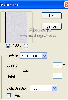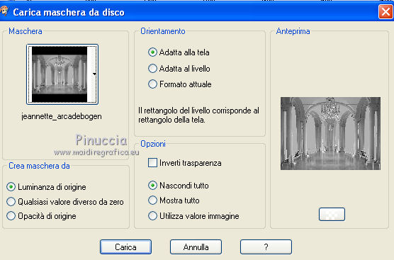 qui puoi trovare qualche risposta ai tuoi dubbi. Se l'argomento che ti interessa non è presente, ti prego di segnalarmelo. Per tradurre questo tutorial ho usato PSP X. Occorrente: Materiale qui I tubes sono di Gini e Lut. Filtri: Texture - Texturizer qui Greg's Factory Output vol.II qui Metti la maschera Jeannette-arcadebogen nella cartella Maschere. Imposta il colore di primo piano con #dbdae0. e il colore di sfondo con #0f0909. 1. Apri una nuova immagine trasparente 750 x 550 pixels, e riempila con il colore di sfondo.2. Livelli>Nuovo livello raster. Riempi con il colore di primo piano.3. Livelli>Carica/Salva maschera>Carica maschera da disco. Cerca e carica la maschera Jeannette-arcadebogen. ![]() Livelli>Elimina e rispondi sì alla domanda Unire la maschera nel livello corrente. ![]() Livelli>unisci>Unisci gruppo. Livelli>Unisci>Unisci visibile. 4. Regola>Tonalità e saturazione>Viraggio. ![]() 5. Effetti>Plugins>Greg's Factory Output II - Pool shadow. ![]() se non vuoi aggiungere nuovi filtri nei Percorsi Files, ricorda che questo filtro è identico al Pool Shadow di Tramages e al Cross Shadow di Graphics Plus Regola>Messa a fuoco>Metti a fuoco. 6. Imposta il colore di sfondo con #7d91a2. 7. Apri il tube di Lut. Immagine>Ridimensiona, a 300 pixels di altezza. Modifica>Copia (e minimizzalo perchè ti servirà ancora). Torna al tuo lavoro e vai a Modifica>Incolla come nuovo livello. Spostalo nell'angolo in basso a destra.10. Effetti>Effetti 3D>Sfalsa ombra. ![]() Regola>Messa a fuoco>Metti a fuoco. 11. Livelli>Duplica. Immagine>Rifletti. Livelli>Unisci>Unisci visibile. 12. Apri una nuova immagine trasparente 70 x 125 pixels, e riempila con il colore di primo piano.13. Effetti>Plugins>Texture - Texturizer. ![]() 14. Attiva nuovamente il tube di Lut. Immagine>Ridimensiona, a 70 pixels di larghezza. Modifica>Copia. Torna alla piccola immagine 70x125 e vai a Modifica>Incolla come nuovo livello. Livelli>Unisci>Unisci tutto. 15. Immagine>Aggiungi bordatura, 6 pixels, simmetriche, con il colore di sfondo. Seleziona questo bordo con la bacchetta magica ![]() Effetti>Plugins>Greg's Factory Output II - Pool Shadow, come al punto 5. 16. Effetti>Effetti 3D>Smusso a incasso. ![]() Selezione>Deseleziona. 17. Modifica>Copia. Torna al tuo lavoro principale e vai a Modifica>Incolla come nuovo livello. Sposta il piccolo quadro sulla parete a destra.![]() 18. Premi il tasto D per attivare lo strumento Deformazione ![]() e, tenendo premuto il tasto della maiuscola per attivare la modalità Inclinazione, usa gli angoli per inclinare i lati del quadro. ![]() Usando i nodi centrali, adatta il quadro alla superficie tra le colonne. ![]() 19. Effetti>Effetti 3D>Sfalsa ombra. ![]() 20. Livelli>Duplica. Immagine>Rifletti. Posiziona correttamente il quadro tra le colonne.21. Livelli>Unisci>Unisci tutto. 22. Immagine>Aggiungi bordatura, 1 pixel, simmetriche, con il colore di primo piano. Immagine>Aggiungi bordatura, 15 pixels, simmetriche, con il colore #828c96. Seleziona questo bordo con la bacchetta magica ![]() 23. Effetti>Plugins>Greg's Factory Output - Pool Shadow, come al punto 4. Selezione>Deseleziona. 24. Immagine>Aggiungi bordatura, 1 pixels, simmetriche, con il colore di primo piano. 25. Apri il tube MR_fashion models. Immagine>Ridimensiona, a 420 pixels di altezza. Modifica>Copia. Torna al tuo lavoro e vai a Modifica>Incolla come nuovo livello. Sposta il tube un po' più a sinistra, in basso.25. Effetti>Effetti 3D>sfalsa ombra, con i settaggi precedenti. Regola>Messa a fuoco>Metti a fuoco. 26. Livelli>Unisci>Unisci tutto. Salva in formato jpg ![]() Le vostre versioni. Grazie ![]() Paola Se hai problemi o dubbi, o trovi un link non funzionante, o anche soltanto per un saluto, scrivimi. 20 Agosto 2011 |