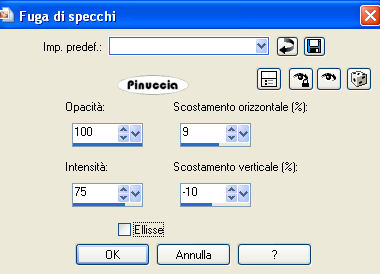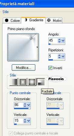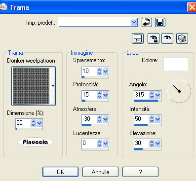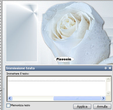 qui puoi trovare qualche risposta ai tuoi dubbi. Se l'argomento che ti interessa non è presente, ti prego di segnalarmelo. Per tradurre questo tutorial ho usato PSP X. Occorrente: Materiale qui Il tube delle rose è di Fredo. Imposta il colore di primo piano con #B4C2CD, e il colore di sfondo con il bianco #ffffff. Passa il colore di primo piano a Gradiente di primo piano/sfondo: ![]() 1. Apri il tube delle rose. Duplica il tube usando sulla tastiera la combinazione di tasti shift(maiuscola)+D e metti da parte il tube. 2. Elimina il livello del watermark. Regola>Messa a fuoco>Metti a fuoco. 3. Livelli>Nuovo livello raster. Riempi il livello con il gradiente (adesso l'immagine delle rose è coperta, ma la vedrai più tardi).4. Effetti>Effetti di bordo>Aumenta di più. 5. Effetti>Effetti di riflesso>Fuga di specchi: ![]() 6. Regola>Messa a fuoco>Metti a fuoco - 3 volte. 7. Livelli>Duplica. Immagine>Rifletti. Immagine>Capovolgi. 8. Abbassa l'opacità di questo livello al 50%. 9. Nella paletta dei livelli chiudi il livello delle rose. 10. Livelli>Unisci>Unisci visibile. Regola>Messa a fuoco>Metti a fuoco. 11. Riapri il livello con le rose e spostalo sopra il livello uniti. 12. Effetti>Effetti 3D>sfalsa ombra. ![]() Livelli>Unisci>Unisci tutto. 13. Attiva lo strumento Forme predefinite rettangolo ![]() inverti i colori nella paletta dei materiali: ![]() e traccia un rettangolo in alto a sinistra. ![]() 14. Attiva lo strumento testo .ho usato il font Bookman Old style ![]() Inverti nuovamente i colori nella paletta dei materiali: ![]() Passa il mouse sulla griglia e quando vedi la A sottolineata da una mezza luna, clicca per far apparire la finestra del testo. ![]() Scrivi una serie di punti per coprire tutto il perimetro del rettangolo. ![]() 16. Effetti>Effetti 3D>Sfalsa ombra, come al punto 12. Regola>Messa a fuoco>Metti a fuoco - 2 volte. Selezione>Deseleziona. 17. Nella paletta dei livelli clicca con il tasto destro del mouse sul livello Vettore e Converti in livello raster. ![]() 18. Livelli>Nuovo livello raster. Chiudi il colore di primo piano e lascia lo strumento Testo con le impostazioni precedenti. Scrivi un testo sul rettangolo. 19. Effetti>Effetti 3D>sfalsa ombra, come al punto 12 - 2 volte. Regola>Messa a fuoco>Metti a fuoco. Selezione>Deseleziona. 20. Attiva nuovamente il tube delle rose. Duplicalo nuovamente e chiudi l'originale. Elimina il livello del watermark. Immagine>Ridimensiona, 95 x 71 pixels. Regola>Messa a fuoco>Metti a fuoco, 2 volte. Modifica>Copia. non chiuderlo, ti servirà ancora, se vorrai realizzare lo script Torna al tuo lavoro e vai a Modifica>Incolla come nuovo livello. Sposta queste rose sotto il testo.Effetti>Effetti 3D>Sfalsa ombra, come al punto 12. Livelli>Unisci>Unisci tutto. 21. Imposta il colore di primo piano con il gradiente. 22. Immagine>Aggiungi bordatura, 1 pixel, simmetriche, con il colore di primo piano. Immagine>Aggiungi bordatura, 4 pixels, simmetriche, con il colore bianco. Seleziona il bordo bianco con la bacchetta magica ![]() Effetti>Effetti di trama>Trama - seleziona la trama Donker weefpatroon (la trovi qui) ![]() 23. Regola>Messa a fuoco>Metti a fuoco. Selezione>Deseleziona. 24. Immagine>Aggiungi bordatura, 2 pixels, simmetriche, con il colore di primo piano. Immagine>Aggiungi bordatura, 4 pixels, simmetriche, con il colore bianco. Seleziona questo bordo con la bacchetta magica ![]() Effetti>Effetti di trama>Trama, con i settaggi precedenti. Regola>Messa a fuoco>Metti a fuoco, 2 volte. Selezione>Deseleziona. 25. Immagine>Aggiungi bordatura, 5 pixels, simmetriche, con il colore di primo piano. Seleziona questo bordo con la bacchetta magica ![]() Effetti>Effetti 3D>Smusso a incasso, con i seguenti settaggi: ![]() 26. Selezione>Deseleziona. L'immagine è finita. Se vuoi realizzare lo script ti serviranno anche due immagini di sfondo e la piccola immagine delle rose che dovrai salvare in formato gif (come fare vedi qui) Per realizzare lo script - che trovi qui puoi seguire i soliti preliminari descritti alla fine di questo tutorial, e sostituire le immagini, con le dovute variazioni, come spiegato nei precedenti tutorial. Se hai problemi o dubbi, o trovi un link non funzionante, o anche soltanto per un saluto, scrivimi. 7 Marzo 2009 |