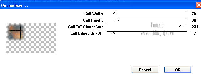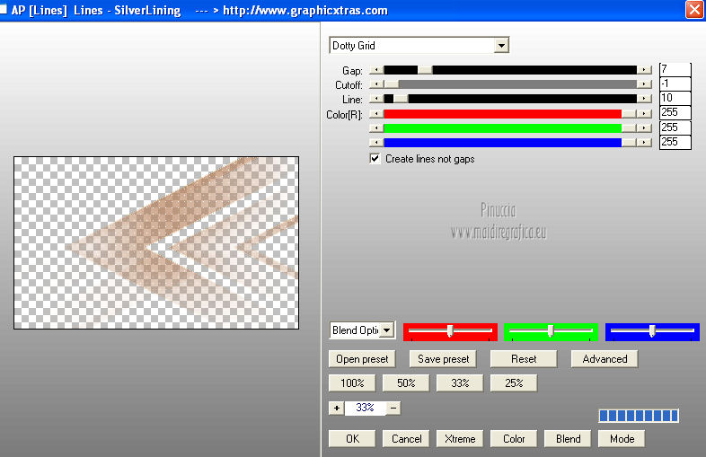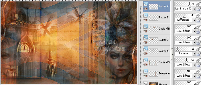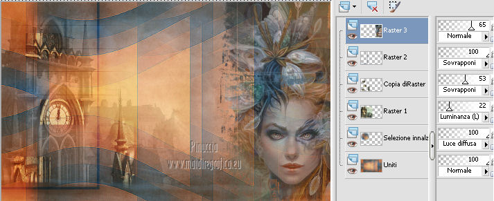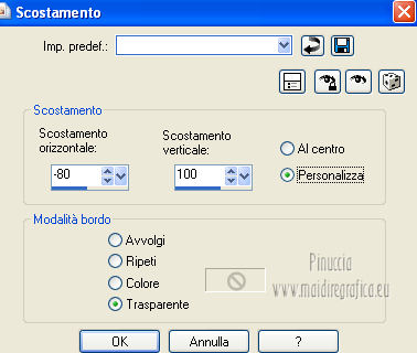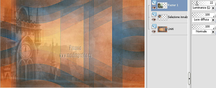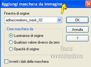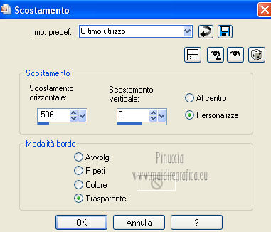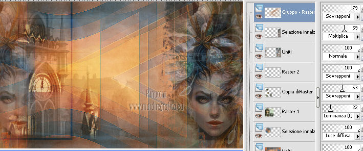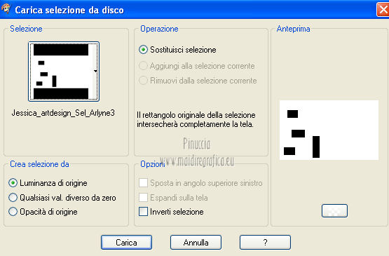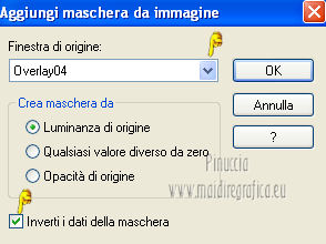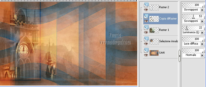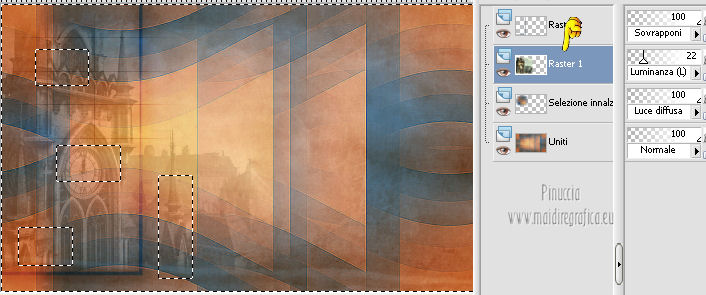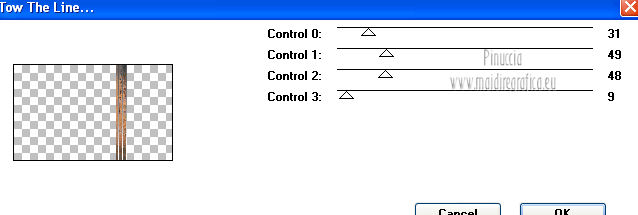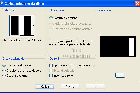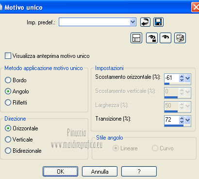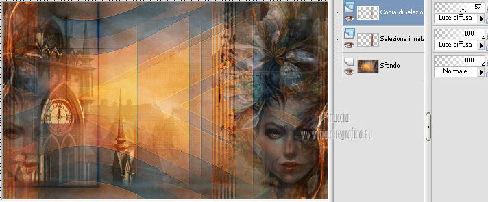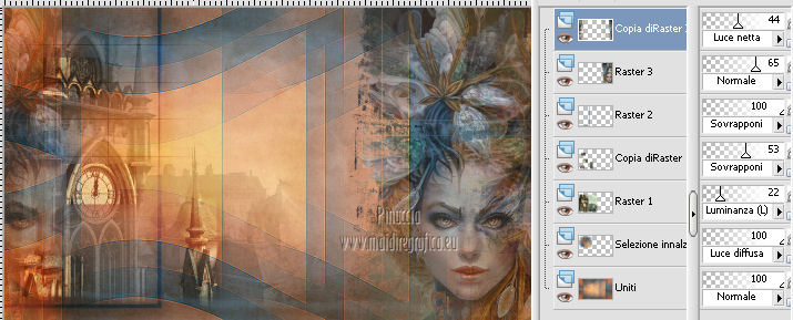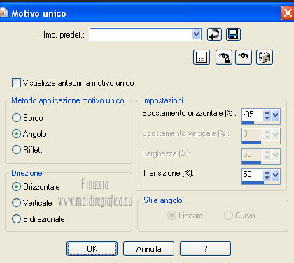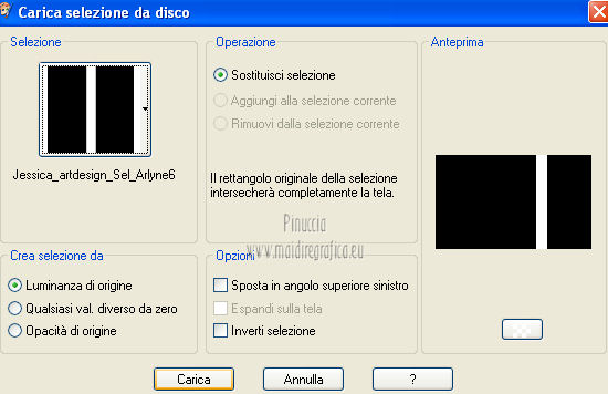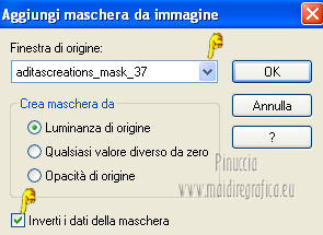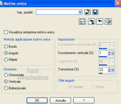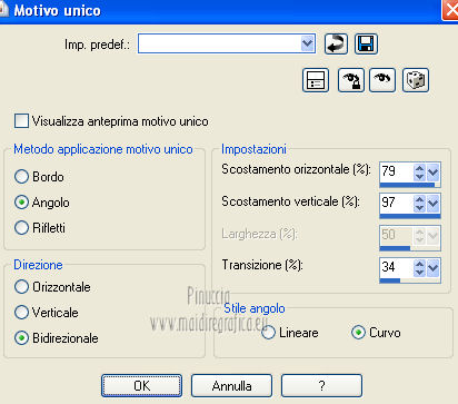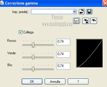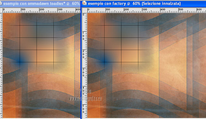 qui puoi trovare qualche risposta ai tuoi dubbi. Se l'argomento che ti interessa non è presente, ti prego di segnalarmelo. Per tradurre questo tutorial ho usato PSP X. Occorrente: Materiale qui Filtri in caso di dubbi, ricorda di consultare la mia sezione filtri qui Filters Unlimited 2.0 qui Filter Factory Gallery V qui AP Lines - Lines SilverLining qui Tramage - Tow the line qui I filtri Factory Gallery per essere usati devono prima essere convertiti. Come fare vedi qui Si usano importandoli in Filters Unlimited (come fare vedi qui) ma possono funzionare anche da soli Le Factory fornite sono state già convertite. Anche i filtri Tramages si possono usare da soli o importati in Filters Unlimited. ![]() Metti le selezioni nella cartella Selezioni. Apri le maschere "aditascreations_mask_37" e "aditascreations_mask_02" in PSP, e minimizzale con il resto del materiale. 1. Imposta il colore di primo piano con #B78059 e il colore di sfondo con #2F4D67. ![]() 2. Apri una nuova immagine trasparente 950 x 575 pixels, e riempila con il colore di primo piano.3. Livelli>Nuovo livello raster. Riempi con il colore di sfondo.4. Livelli>Nuovo livello maschera>Da immagine. Apri il menu sotto la finestra di origine e vedrai la lista dei files aperti. Seleziona la maschera aditascreations_mask_37, con i seguenti settaggi: ![]() Livelli>Duplica. Livelli>Unisci>Unisci gruppo. 5. Livelli>Unisci>Unisci visibile. Effetti>Effetti di bordo>Aumenta. 6. Effetti>Effetti di immagine>Motivo unico. ![]() Regola>Messa a fuoco>Accentua messa a fuoco. 7. Livelli>Nuovo livello raster. Selezione>Seleziona tutto. Apri "Jessica_artdesign_texture1" e vai a Modifica>Copia. Torna al tuo lavoro e vai a Modifica>Incolla nella selezione. Cambia la modalità di miscelatura di questo livello in Sovrapponi. Selezione>Deseleziona. 8. Premi sulla tastiera la combinazione di tasti maiuscola+G per attivare Correzione gamma e imposta i seguenti settaggi. se stai usando PSP 9 lo strumento si trova sotto Regola>Luminosità e contrasto>Correzione gamma ![]() 9. Livelli>Unisci>Unisci visibile. 10. Selezione>Carica/Salva selezione>Carica selezione da disco. Cerca e carica la selezione Jessica_artdesign_Sel_Arlyne1. ![]() Selezione>Innalza selezione a livello. Selezione>Deseleziona. 11. Effetti>Plugins>Filter Factory Gallery V - Ommadawn. ![]() attenzione, se non trovi l'effetto nella lista del filtro, vuol dire che hai inserito in precedenza questo effetto in un altro filtro, per esempio nel filtro Toadies. Per usare l'Effetto contenuto nel filtro della Gallery V, devi rimuovere Toadies dai Percorsi Files. Puoi anche usare quello contenuto in Toadies, perchè in questo caso il risultato non cambia, come puoi vedere dalla schermata sotto. ![]() 12. Cambia la modalità di miscelatura di questo livello in Luce diffusa. 13. Apri "Jessica_artdesign_FantasyTower" e vai a Modifica>Copia. Torna al tuo lavoro e vai a Modifica>Incolla come nuovo livello. Immagine>Ridimensiona, all'80%, bicubica, tutti i livelli non selezionato. 14. Effetti>Effetti di immagine>Scostamento. ![]() Cambia la modalità di miscelatura di questo livello in Luminanza (esistente), e abbassa l'opacità al 22%. ![]() 15. Livelli>Nuovo livello raster. Selezione>Carica/Salva selezione>Carica selezione da disco. Cerca e carica la selezione Jessica_artdesign_Sel_Arlyne2. ![]() Riempi la selezione con il colore di sfondo.Selezione>Deseleziona. Cambia la modalità di miscelatura di questo livello in Sovrapponi. 16. Effetti>Effetti 3D>Sfalsa ombra. ![]() Selezione>Carica/Salva selezione>Carica selezione da disco. Cerca e carica la selezione Jessica_artdesign_Sel_Arlyne3. ![]() 17. Attiva il livello sottostante - Raster 1. ![]() Livelli>Duplica. Premi sulla tastiera il tasto CANC. Selezione>Deseleziona. Cambia la modalità di miscelatura di questo livello in Sovrapponi, e abbassa l'opacità al 53%. ![]() 18. Effetti>Effetti 3D>Sfalsa ombra, con i settaggi precedenti. 19. Apri "Overlay04". Livelli>Unisci>Unisci tutto, e in questo modo l'immagine si appiattirà in un unico livello di sfondo. ![]() Immagine>Ruota a destra se stai usando PSP 9: Immagine>Ruota - 90 gradi in senso orario E avrai questo. ![]() Minimizza questa immagine che al prossimo passaggio ti servirà da maschera. 20. Apri l'immagine "Victorian-voodoo". Livelli>Nuovo livello maschera>Da immagine. Apri il menu sotto la finestra di origine e vedrai la lista dei files aperti. Seleziona l'immagine Overlay04, con i seguenti settaggi: ![]() Livelli>Duplica. Livelli>Unisci>Unisci gruppo. E avrai questo. ![]() Modifica>Copia. 21. Torna al tuo lavoro. Attiva il livello superiore e vai a Modifica>Incolla come nuovo livello. Immagine>Ridimensiona, all'80%, bicubica, tutti i livelli non selezionato. 22. Effetti>Effetti di immagine>Scostamento. ![]() 23. Abbassa l'opacità di questo livello al 65%. ![]() 24. Livelli>Duplica. Effetti>Effetti di immagine>Motivo unico, con i settaggi precedenti. Cambia la modalità di miscelatura di questo livello in Luce netta, e abbassa l'opacità al 44%. ![]() 25. Livelli>Unisci>Unisci giù. in alcune versioni di PSP e con determinate condizioni di colori e miscelatura, con questo comando l'immagine "scolora". Se questo è il tuo caso, annulla il comando (Modifica>Annulla azione Unisci giù), chiudi tutti i livelli tranne i due livelli superiori, e vai a Livelli>Unisci>Unisci visibile. Riapri poi i livelli chiusi (Livelli>Visualizza>Tutto). Rimani posizionato sul livello superiore. ![]() 26. Selezione>Carica/Salva selezione>Carica selezione da disco. Cerca e carica la selezione Jessica_artdesign_Sel_Arlyne5. ![]() Selezione>Innalza selezione a livello. Selezione>Deseleziona. Cambia la modalità di miscelatura di questo livello in Moltiplica, e abbassa l'opacità al 59%. 27. Effetti>Effetti 3D>Sfalsa ombra, con i settaggi precedenti. 28. Livelli>Nuovo livello raster. Riempi con il colore di primo piano.29. Livelli>Nuovo livello maschera>Da immagine. Apri il menu sotto la finestra di origine e seleziona l