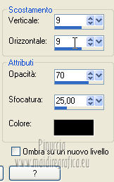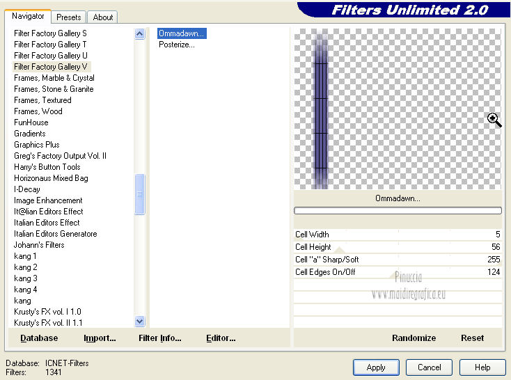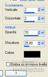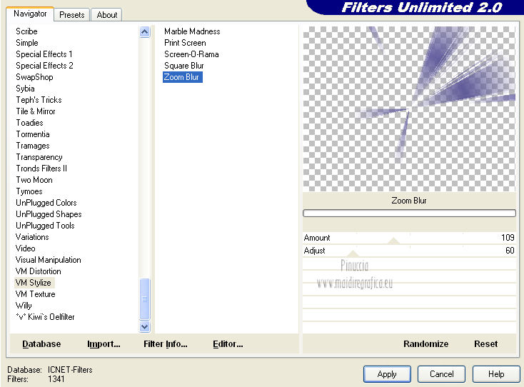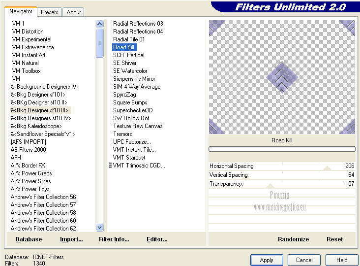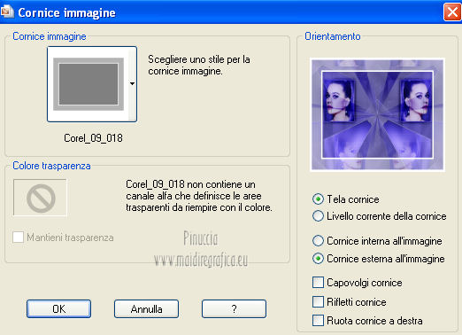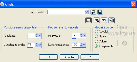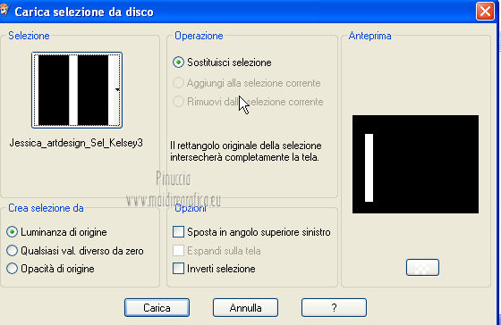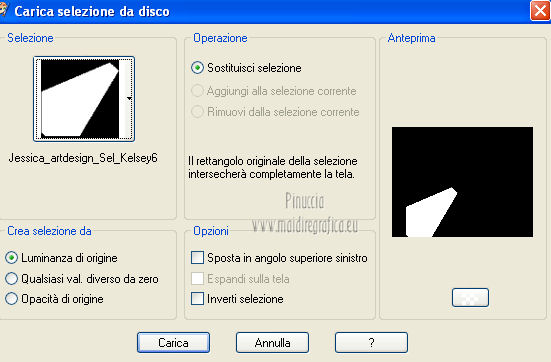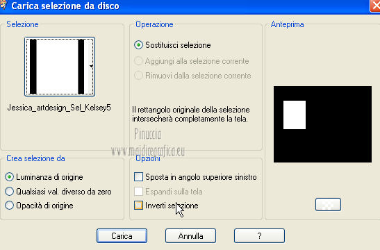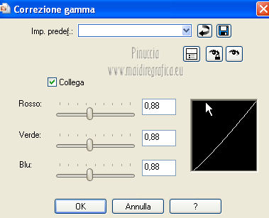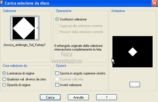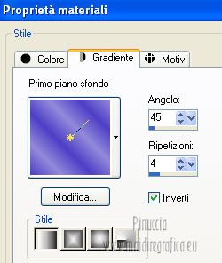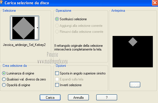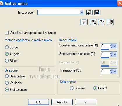 qui puoi trovare qualche risposta ai tuoi dubbi. Se l'argomento che ti interessa non è presente, ti prego di segnalarmelo. Per tradurre questo tutorial ho usato PSP X. Occorrente: A scelta il tube di un viso. Il resto del materiale qui I tubes usati per i miei esempi sono di Gabry Filtri in caso di dubbi, ricorda di consultare la mia sezione filtri qui Filters Unlimited 2.0 qui &<BKG Designer sf10III> (da importare in Unlimited) qui Filter Factory V qui Graphics Plus - Cross Shadow qui AP Innovations - Lines SilverLining qui VM Stylize qui I filtri Factory Gallery per essere usati devono prima essere convertiti. Come fare vedi qui Si usano importandoli in Filters Unlimited (come fare vedi qui) ma possono funzionare anche da soli. Le Factory fornite sono state già convertiti. Anche i filtri Graphics Plus e vM Stylize si possono usare da soli o importati in Unlimited ![]() Metti le selezioni nella cartella Selezioni. Apri la maschera in PSP e minimizzala con il resto del materiale. 1. Scegli due colori dal tuo tubes. Imposta il colore di primo piano con il colore chiaro, e il colore di sfondo con il colore scuro. 2. Apri una nuova immagine trasparente 800 x 625 pixels, e riempila con il colore di primo piano.3. Livelli>Nuovo livello raster. Riempi il livello con il colore di sfondo.4. Livelli>Nuovo livello maschera>Da immagine. Apri il menu sotto la finestra di origine e vedrai la lista dei files aperti. Seleziona la maschera flore18134996264493_gros con i seguenti settaggi. ![]() Livelli>Unisci>Unisci gruppo. 5. Livelli>Unisci>Unisci visibile. Regola>Messa a fuoco>Accentua messa a fuoco. 6. Premi sulla tastiera la combinazione di tasti maiuscola+G per attivare lo strumento Gamma correzione. ![]() 7. Passa il colore di primo piano a Gradiente, stile Lineare, con i seguenti settaggi. ![]() 8. Livelli>Nuovo livello raster. Selezione>Carica/Salva selezione>Carica selezione da disco. Cerca e carica la selezione Jessica_artdesign_Sel_Kelsey1. ![]() Riempi la selezione con il gradiente.Selezione>Deseleziona. 9. Effetti>Effetti di immagine>Motivo unico. ![]() 10. Effetti>Plugins>Filters Unlimited 2.0 - &<Bkg Designer sf10III> - Road kill. ![]() 11. Livelli>Duplica. Effetti>Effetti di immagine>Scostamento. ![]() 12. Selezione>Carica/Salva selezione>Carica selezione da disco. Cerca e carica la selezione Jessica_artdesign_Sel_Kelsey2. ![]() 13. Selezione>Inverti. Premi sulla tastiera il tasto CANC. Selezione>Deseleziona. 14. Livelli>Duplica. Immagine>Capovolgi. Livelli>Unisci>Unisci giù. Ripeti Livelli>Unisci>Unisci giù. 15. Regola>Messa a fuoco>Accentua messa a fuoco. 16. Livelli>Nuovo livello raster. Selezione>Carica/Salva selezione>Carica selezione da disco. Cerca e carica la selezione Jessica_artdesign_Sel_Kelsey3. ![]() Riempi la selezione con il colore di sfondo.Selezione>Deseleziona. 17. Effetti>Plugins>Filters Unlimited 2.0 - Filter Factory Gallery V - Ommadawn. ![]() 18. Livelli>Duplica. Immagine>Rifletti. Livelli>Unisci>Unisci giù. 19. Effetti>Effetti di immagine>Motivo unico, con i settaggi precedenti. 20. Regola>Messa a fuoco>Accentua messa a fuoco. 21. Livelli>Nuovo livello raster. Selezione>Carica/Salva selezione>Carica selezione da disco. Cerca e carica la selezione Jessica_artdesign_Sel_Kelsey4. ![]() Riempi la selezione con il gradiente.Selezione>Deseleziona. 22- Effetti>Effetti di distorsione>Onda. ![]() 23. Effetti>Plugins>Filters Unlimited 2.0 - VM Stylize4 - Zoom blur. ![]() 24. Livelli>Duplica. Immagine>Rifletti. Livelli>Unisci>Unisci giù. 25. Cambia la modalità di miscelatura di questo livello in Rafforza, e abbassa l'opacità al 46%. 26. Livelli>Duplica. Immagine>Capovolgi. Effetti>Effetti di bordo>Aumenta. Cambia la modalità di miscelatura di questo livello in Luce netta, e abbassa l'opacità al 65%. ![]() 27. Livelli>Nuovo livello raster. Selezione>Carica/Salva selezione>Carica selezione da disco. Cerca e carica la selezione Jessica_artdesign_Sel_Kelsey5. ![]() Riempi la selezione con il colore di sfondo.28. Effetti>Plugins>Graphics Plus - Cross Shadow. ![]() 29. Apri il tuo tube e vai a Modifica>Copia. Torna al tuo lavoro e vai a Modifica>Incolla come nuovo livello. Posiziona il viso nell'area selezionata.Selezione>Inverti. Premi sulla tastiera il tasto CANC. 30. Di nuovo Selezione>Inverti. Selezione>Modifica>Seleziona bordature selezione. ![]() Riempi la selezione con il gradiente.31. Selezione>Seleziona tutto. Selezione>Mobile. Selezione>Immobilizza. 32. Effetti>Effetti 3D>Sfalsa ombra, con il colore nero. ![]() Selezione>Deseleziona. 33. Livelli>Unisci>Unisci giù. 34. Livelli>Duplica. Immagine>Rifletti. Livelli>Unisci>Unisci giù. Cambia la modalità di miscelatura di questo livello in Luce diffusa. 35. Livelli>Duplica. Livelli>Unisci>Unisci giù. (questo può variare a seconda del tuo tube e dei tuoi colori. Se sono troppo luminosi, puoi omettere questo passaggio, o ripeterlo se sono troppo leggeri). 36. Livelli>Duplica. 37. Livelli>Nuovo livello raster. Selezione>Carica/Salva selezione>Carica selezione da disco. Cerca e carica la selezione Jessica_artdesign_Sel_Kelsey6. ![]() 38. Cambia i settaggi del gradiente portando le ripetizioni a 0. ![]() Riempi la selezione con il gradiente.39. Effetti>Plugins>Graphics Plus - Cross Shadow. ![]() 40. Effetti>Effetti di bordo>Aumenta di più. Effetti>Effetti di bordo>Aumenta. 41. Effetti>Plugins>AP Innovations - Lines SilverLining. ![]() Selezione>Deseleziona. 42. Livelli>Duplica. Immagine>Rifletti. Livelli>Unisci>Unisci giù. Cambia la modalità di miscelatura di questo livello in luce netta. 43. Livelli>Duplica. Effetti>Effetti di immagine>Motivo unico, con i settaggi precedenti. Abbassa l'opacità di questo livello al 59%. 44. Attiva il livello con il tube incorniciato. Livelli>Duplica. Effetti>Effetti di immagine>Motivo unico, con i settaggi precedenti. 45. Attiva nuovamente il livello con il tube. Selezione>Seleziona tutto. Selezione>Mobile. 46. Attiva il livello soprastante (la copia del tube con il motivo unico).
