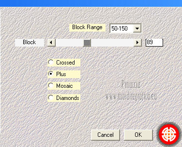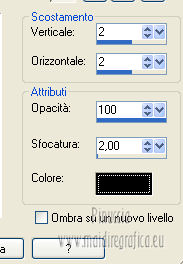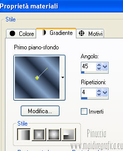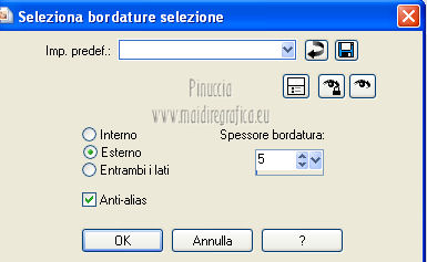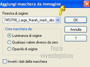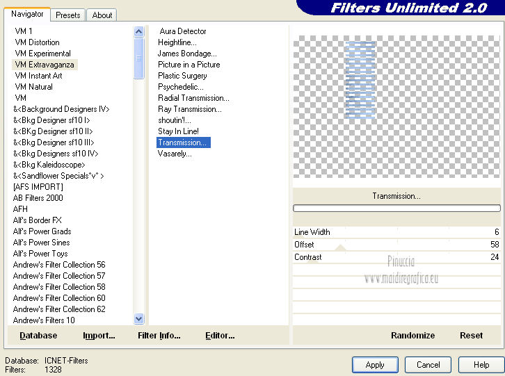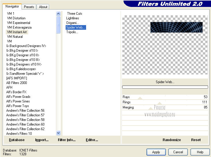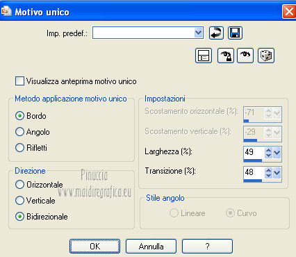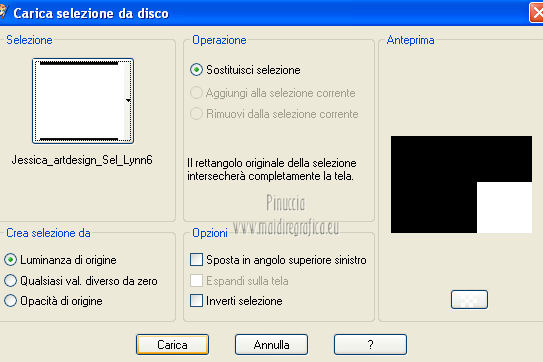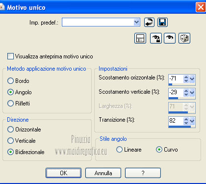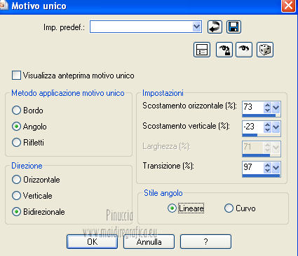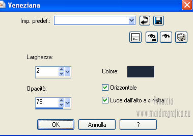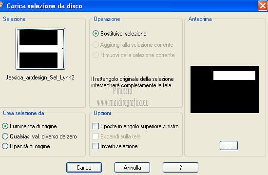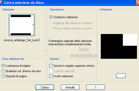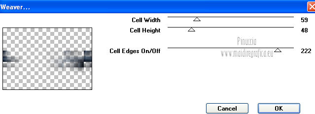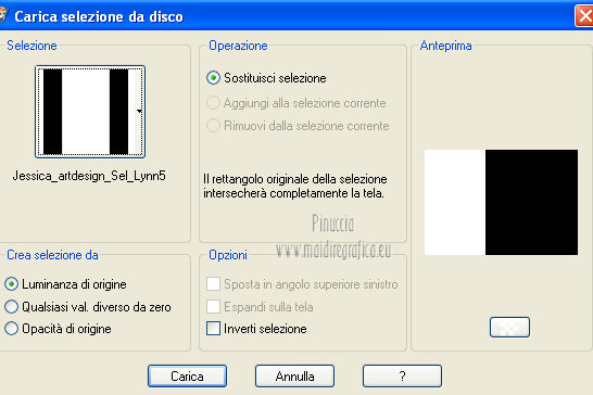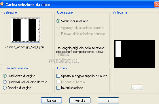 qui puoi trovare qualche risposta ai tuoi dubbi. Se l'argomento che ti interessa non è presente, ti prego di segnalarmelo. Per tradurre questo tutorial ho usato PSP X. Occorrente: Un tube a scelta. Il resto del materiale qui Il tube usato per il mio esempio è di K@rine Filtri in caso di dubbi, ricorda di consultare la mia sezione filtri qui Filters Unlimited 2.0 qui VM Extravaganza qui VM Instant Art qui Mehdi qui L&K's - L&K's Zitah qui Toadies qui I filtri della serie Visman (VM Extravaganza, VM Instant Art) e Toadies si possono usare da soli, o importati in Filters Unlimited (come fare vedi qui) ma possono funzionare anche da soli. ![]() Metti le selezioni nella cartella Selezioni. Apri la maschera 7453700_Large_Narah_mask_abstract104 in PSP e minimizzala con il resto del materiale. 1. Scegli due colori dal tuo tube. Imposta il colore di primo piano con il colore chiaro, e il colore di sfondo con il colore scuro. 2. Apri una nuova immagine trasparente 900 x 625 pixels, e riempila con il colore di primo piano.3. Livelli>Nuovo livello raster. Selezione>Seleziona tutto. 4. Apri paper1 e vai a Modifica>Copia. Torna al tuo lavoro e vai a Modifica>Incolla nella selezione. Selezione>Deseleziona. Cambia la modalità di miscelatura di questo livello in Luminanza (esistente). 5. Effetti>Effetti di immagine>Motivo unico. ![]() 6. Livelli>Unisci>Unisci tutto. 7. Livelli>Nuovo livello raster. Riempi il livello con il colore di sfondo.8. Livelli>Nuovo livello maschera>Da immagine. Apri il menu sotto la finestra di origine e vedrai la lista dei files aperti. Seleziona la maschera 7453700_Large_Narah_mask_abstract104, con i seguenti settaggi. ![]() 9. Livelli>Unisci>Unisci tutto. 10. Selezione>Carica/Salva selezione>Carica selezione da disco. Cerca e carica la selezione Jessica_artdesign_Sel_Lynn1. ![]() Selezione>Innalza selezione a livello. Selezione>Deseleziona. 11. Effetti>Plugins>Filters Unlimited 2.0 - VM Extravaganza - Transmission. ![]() Regola>Messa a fuoco>Metti a fuoco. Cambia la modalità di miscelatura di questo livello in Moltiplica. 12. Effetti>Effetti di distorsione>Vento - da destra, intensità 79. ![]() 13. Livelli>Duplica. Immagine>Rifletti. Riporta la modalità di miscelatura di questo livello a Normale. 14. Passa il colore di primo piano a Gradiente di primo piano/sfondo, stile Lineare. ![]() 15. Livelli>Nuovo livello raster. Selezione>Carica/Salva selezione>Carica selezione da disco. Cerca e carica la selezione Jessica_artdesign_Sel_Lynn2. ![]() Riempi la selezione con il gradiente.16. Regola>Sfocatura>Sfocatura gaussiana - raggio 35. ![]() Selezione>Deseleziona. 17. Effetti>Plugins>Filters Unlimited 2.0 - VM Instant Art – Spider web. ![]() 18. Effetti>Effetti di immagine>Motivo unico. ![]() Selezione>Carica/Salva selezione>Carica selezione da disco. Carica nuovamente la selezione Jessica_artdesign_Sel_Lynn2. ![]() Premi sulla tastiera il tasto CANC: Selezione>Deseleziona. 19. Selezione>Carica/Salva selezione>Carica selezione da disco. Cerca e carica la selezione Jessica_artdesign_Sel_Lynn3. ![]() 20. Apri il tuo tube e vai a Modifica>Copia. non chiuderlo perchè lo userai ancora Torna al tuo lavoro e vai a Modifica>Incolla come nuovo livello. 21. Immagine>Ridimensiona, se e quanto necessario, tutti i livelli non selezionato. (per il mio esempio ho ridimensionato 2 volte al 120%). 22. Posiziona il viso del tube nell'area selezionata.Selezione>Inverti. Premi sulla tastiera il tasto CANC. 23. Selezione>Inverti. Regola>Messa a fuoco>Metti a fuoco. Cambia la modalità di miscelatura di questo livello in Luminanza (esistente). 24. Livelli>Duplica. Cambia la modalità di miscelatura di questo livello in Indebolisci, e abbassa l'opacità al 44%. Livelli>Unisci>Unisci giù. 25. Effetti>Effetti di trama>Veneziana, con il colore di sfondo. ![]() Selezione>Deseleziona. 26. Attiva il livello inferiore. ![]() 27. Selezione>Carica/Salva selezione>Carica selezione da disco. Cerca e carica la selezione Jessica_artdesign_Sel_Lynn4. ![]() Selezione>Innalza selezione a livello. Cambia la modalità di miscelatura di questo livello in Sovrapponi, e abbassa l'opacità all'83%. Selezione>Deseleziona. 28. Effetti>Effetti di trama>Veneziana, con i settaggi precedenti, ma orizzontale non selezionato. ![]() 29. Effetti>Plugins>L&K's - L&K's Zitah. ![]() 30. Attiva il livello Raster 1 (il livello sotto il tube, con l'effetto Spider web). ![]() Cambia la modalità di miscelatura di questo livello in Rafforza, e abbassa l'opacità al 32%. 31. Effetti>Plugins>Toadies - Weaver. ![]() 32. Effetti>Effetti di bordo>Aumenta. Livelli>Duplica. Immagine>Rifletti. Immagine>Capovolgi. 33. Attiva il livello superiore. 34. Apri Jessica_artdesign_Wordart_Love, e vai a Modifica>Copia. Torna al tuo lavoro e vai a Modifica>Incolla come nuovo livello. 35. Effetti>Effetti di immagine>Scostamento. ![]() 36. Selezione>Seleziona tutto. Selezione>Mobile. Livelli>Nuovo livello raster. Riempi il livello con il gradiente.Selezione>Deseleziona. 37. Elimina il livello sottostante dell'originale. Attiva nuovamente il livello superiore. Cambia la modalità di miscelatura di questo livello in Luce netta, e abbassa l'opacità al 55%. 38. Effetti>Effetti 3D>Sfalsa ombra. ![]() Effetti>Effetti di bordo>Aumenta di più. 39. Livelli>Nuovo livello raster. Selezione>Carica/Salva selezione>Carica selezione da disco. Cerca e carica la selezione Jessica_artdesign_Sel_Lynn5. ![]() 40. Attiva nuovamente il tuo tube. Immagine>Rifletti. Modifica>Copia, e minimizzalo perchè ti servirà ancora. Torna al tuo lavoro e vai a Modifica>Incolla nella selezione. 41. Regola>Sfocatura>Sfocatura gaussiana - raggio 15. ![]() 42. Effetti>Plugins>Mehdi - Sorting Tiles. ![]() Cambia la modalità di miscelatura di questo livello in Differenza. Effetti>Effetti di bordo>Aumenta. 43. Selezione>Modifica>Seleziona bordature selezione. ![]() 44. Livelli>Nuovo livello raster. Riempi la selezione con il gradiente.Selezione>Deseleziona. Cambia la modalità di miscelatura d