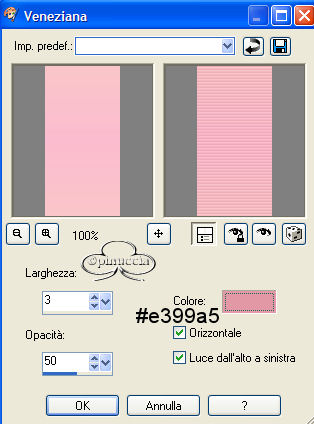 Effetti>Effetti di trama>Veneziana, con i seguenti settaggi, colore #e399a5.