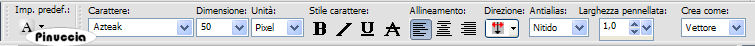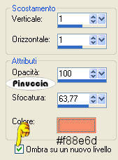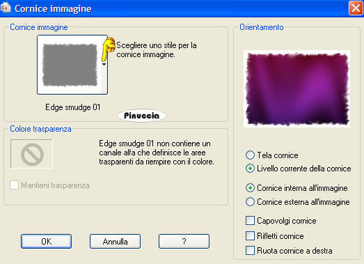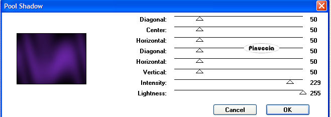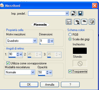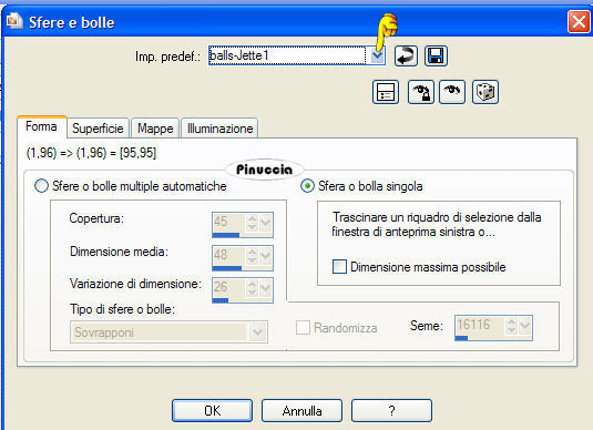 qui puoi trovare qualche risposta ai tuoi dubbi. Se l'argomento che ti interessa non è presente, ti prego di segnalarmelo. Occorrente: Materiale qui Metti il file "Preset_BallsAndBubbles_balls-Jette1.pspscript" nella cartella Impostazioni predefinite. Metti la cornice immagine Edge smudge01.pspFrame nella cartella Cornici-immagine. Apri il font Azteak e minimizzalo nella tua area di lavoro. Lo troverai nella lista dei font disponibili quando ti servirà. Filtri: Fotomatic - Skygrad qui Greg's Factory Output II qui 1. Apri una nuova immagine trasparente 550 x 400 pixels. 2. Imposta il colore di primo piano con ##1c0a2c, e riempi l'immagine trasparente con questo colore.3. Effetti>Plugins>Greg's Factory Output II - Pool Shadows, con i seguenti settaggi. ![]() 4. Effetti>Plugins>Fotomatic - Skygrad, con i seguenti settaggi: ![]() 5. Livelli>Duplica. 6. Attiva il livello inferiore. 7. Immagine>Capovolgi. 8. Chiudi questo livello. 9. Attiva il livello superiore. 10. Immagine>Cornice-immagine, cerca e seleziona Edge smudge01, con i seguenti settaggi: ![]() 11. Selezione>Seleziona tutto. 12. Selezione>Mobile. 13. Selezione>immobilizza. 14. Chiudi il livello della cornice. 15. Attiva il livello sottostante. 16. Premi sulla tastiera il tasto CANC ![]() 17. Selezione>Nessuna selezione. 18. Effetti>Effetti 3D>Sfalsa ombra, con i seguenti settaggi: ![]() 19. Apri il livello inferiore. ![]() 20. Livelli>Unisci>Unisci visibile. 21. Livelli>Duplica. 22. Effetti>Effetti artistici>Mezzitoni, con i seguenti settaggi. ![]() 23. Abbassa l'opacità di questo livello al 20%. 24. Livelli>Unisci>Unisci visibile. 25. Chiudi questo livello. 26. Livelli>Nuovo livello raster. 27. Attiva lo strumento Selezione , rettangolo,e traccia una quadrato come nella schermata sotto: ![]() 28. Effetti>Effetti artistici - Sfere e bolle. Apri il menu delle impostazioni predefinite, cliccando sulla freccia a fianco del box, cerca e seleziona il preset che hai trovato con il materiale, e clicca ok. ![]() 29. Selezione>Nessuna selezione. 30. Effetti>Effetti 3D>Sfalsa ombra, con i seguenti settaggi, colore #f88e6d, ombra su nuovo livello selezionato. ![]() 31. Attiva nuovamente il livello della bolla. 32. Ripeti l'Effetto Sfalsa ombra, ma cambiando verticale e orizzontale a -1. 33. Chiudi il livello della bolla. 34. Livelli>Unisci>Unisci visibile. 35. Attiva il livello dell'ombra. 36. Livelli>Duplica. 37. Rendi nuovamente visibile il livello della bolla. 38. Livelli>Unisci>Unisci visibile. 39. Abbassa l'opacità di questo livello all'80%. 40. Rendi nuovamente visibili tutti i livelli (Livelli>Visualizza>Tutto). 41. Sposta la palla come nel mio esempio.![]() 42. Apri il tube licornes_37 copie, e vai a Modifica>Copia. 43. Torna al tuo lavoro e vai a Modifica>Incolla>Incolla come nuovo livello. 44. Spostalo come nel mio esempio.45. Abbassa l'opacità di questo livello all'87%. 46. Apri il tube Beauty-face.pspimage, e vai a Modifica>Copia. 47. Torna al tuo lavoro e vai a Modifica>Incolla>Incolla come nuovo livello. Spostalo a sinistra, vedi il mio esempio.48. Nella paletta dei livelli abbassa l'opacità di questo livello intorno al 55-60%. 49. Apri il tube e1.psp, e vai a Modifica>Copia. 50. Torna al tuo lavoro e vai a Modifica>Incolla>Incolla come nuovo livello. Livelli>Duplica, 2 volte e posiziona le tre stelle come preferisci. 51. Apri il tube birds, e vai a Modifica>Copia. 52. Torna al tuo lavoro e vai a Modifica>Incolla>Incolla come nuovo livello. 53. Nella paletta dei livelli cambia la modalità di miscelatura di questo livello in Sovrapponi, e abbassa l'opacità al 67%. 54. Apri il tube bubbles-jette, e vai a Modifica>Copia. 55. Torna al tuo lavoro e vai a Modifica>Incolla>Incolla come nuovo livello. Spostalo in basso a destra, vedi il mio esempio.Abbassa l'opacità di questo livello al 30%. 56. Livelli>Unisci>Unisci tutto. 57. Immagine>Aggiungi bordatura, 1 pixel, simmetriche, con il colore #f88e6d. Immagine>Aggiungi bordatura, 3 pixels, simmetriche, con il colore #440147. 58. Attiva lo strumento Testo , con i seguenti settaggi:![]() dovrai regolare il settaggio della dimensione a seconda della lunghezza del testo e anche della versione di PSP che stai usando, perchè tra la 9 e la X i pixels non corrispondono. Su queste differenze, vedi alcuni appunti in fondo a questa pagina 59. Chiudi il colore di primo piano e imposta il colore di sfondo con #b66b8c. 60. Scrivi il tuo nome e posizionalo. 61. Livelli>Converti livello raster. 62. Livelli>Unisci>Unisci tutto, e salva in formato jpg. ![]() Se hai problemi o dubbi, o trovi un link non funzionante, o anche soltanto per dirmi che ti è piaciuto, scrivimi. 29 Luglio 2007 |