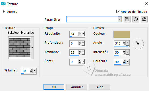 11. Effets>Effets de textures>Texture - sélectionner la texture Basksteen-Monaiekje, couleur d'avant plan.