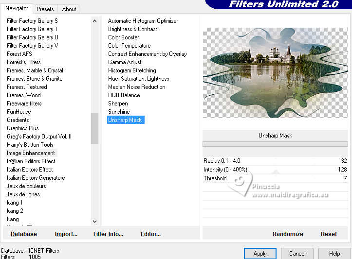 13. Effetti>Plugins>Filters Unlimited 2.0 - Image Enhancement - Unsharp Mask.
