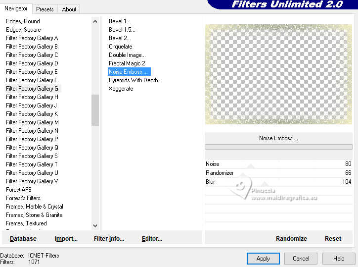 19. Effets>Modules Externes>Filter Factory Gallery G - Noise Emboss, par défaut.