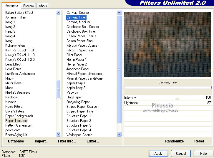 7. Effetti>Plugins>Filters Unlimited 2.0 - Paper textures - Canvas Fine, con i settaggi standard.