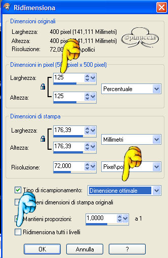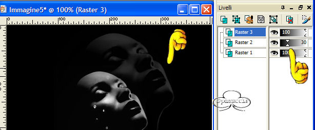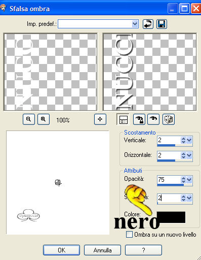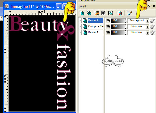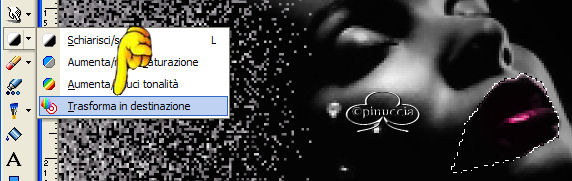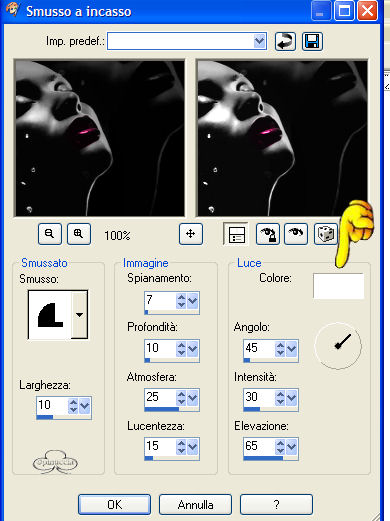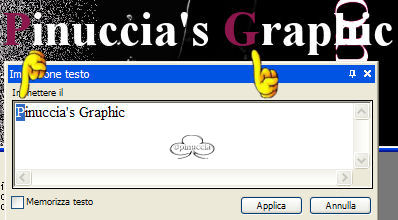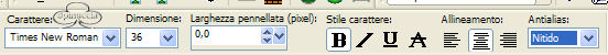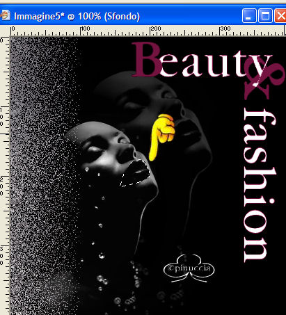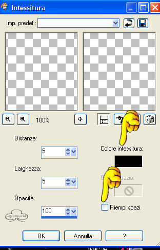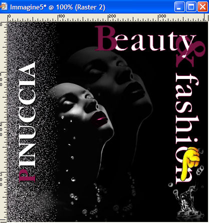 Possiamo partire. Buon divertimento. Apri una nuova immagine trasparente 400x400 e riempila di nero. Apri il file MD-Woman-1.psp e vai a Modifica>Copia. Torna alla tua tela nera e vai a Modifica>Incolla>Incolla come nuovo livello. Immagine>Ridimensiona>125%>tutti i livelli non selezionato (manina blu). Muovi la donna un po' su e sulla sinistra. Questo deve essere fatto a tuo gusto. Potrai controllare se la posizione è di tuo gradimento quando avrai incollato la seconda donna. Porta l'opacità di questo livello a 30. Incolla di nuovo la donna. Spostala come ho detto prima. Se fin qui è tutto ok dovresti avere questo: Apri il file MD-Silverborder.psp contenuto nello zip. Livelli>Carica/Salva maschera>Carica maschera da disco. Cerca la maschera right-to-left e Applica. Livelli>Unisci>Unisci gruppo. Modifica>Copia e torna al tuo lavoro e vai a Modifica>Incolla>Incolla come nuovo livello. Muovi il bordo tutto a sinistra. Abbassa l'opacità di questo livello a 80 e cambia la modalità di miscelatura in "Dissolvi". Apri il file MD-B&FMask,psp. Apri una nuova immagine 225x325 e riempila di bianco. Livelli>Nuovo livello maschera>Da immagine. Cerca la Maschera MD-B&F, inverti i dati della maschera selezionato. Applica. Livelli>Unisci>Unisci gruppo. Livelli>Nuovo livello raster. Sposta questo livello sotto. Riempi questo livello di nero. Seleziona il livello superiore (il testo). Livelli>Nuovo livello raster. Riempi questo livello con il colore #8b174d. Cambia la modalità di miscelatura di questo livello in "sovrapponi". Livelli>Unisci>Unisci visibile. Con la bacchetta magica Selezione>Inverti. Modifica>Copia. Torna al tuo lavoro e vai a Modifica>Incolla>incolla come nuovo livello e sposta il testo, come si vede in tutti gli esempi, in alto a destra. Livelli>Unisci>Unisci tutto (appiattisci). Con lo zoom ingrandisci la bocca della donna (l'immagine più piccola). Con lo strumento Selezione a mano libera Assicurati che il colore di primo piano sia #8b174d. Adesso seleziona lo strumento "Trasforma in destinazione". Lo trovi cliccando sulla freccia accanto a "Pennello chiarisci/scurisci" Questi i settaggi: Attentamente clicca nella selezione una volta. Selezione>Nessuna selezione. Imposta il colore di sfondo sul bianco, colore di primo piano nullo. Strumento testo, cerca il font Times New Roman: Scrivi il tuo nome o il testo che vuoi. Nella finestra dove stai scrivendo il testo, seleziona la prima lettera del nome o di ognuna delle parole che hai scritto, imposta il riempimento con il colore #8b174d e quelle lettere prenderanno il colore rosa. Avrai questo effetto. Nella paletta dei livelli converti in livello raster. Immagine>Ruota>Ruota per gradi>90 gradi a sinistra, tutti i livelli non selezionato. Muovi il testo sul bordo argentato. Effetti>Effetti 3D>Sfalsa ombra, nero: Apri il file MD-Waterdrops.psp e vai a Modifica>Copia. Torna al tuo lavoro e vai a Modifica>Incolla>Incolla come nuovo livello. Sposta le gocce d'acqua sotto il testo Beauty&Fashion. Livelli>Unisci>Unisci tutto (appiattisci). Immagine>Aggiungi bordatura>5 px simmetrico, colore #8b174d. Effetti>Effetti 3D>Smusso a incasso, bianco: Effetti>Effetti 3D>Sfalsa ombra, con il precedente settaggio. Ripeti Sfalsa ombra cambiando orizzontale e verticale a -2. Immagine>Aggiungi bordatura>5 px simmetrico, colore nero. Immagine>Aggiungi bordatura>5 px simmetrico, colore #8b174d. Ripeti lo smusso a incasso e lo sfalsa ombra a 2 e a -2. Selezione>Seleziona tutto. Selezione>Modifica>Contrai di 15 px. Selezione>Inverti Effetti>Effetti di Trama>Intessitura, nero: Ripeti nuovamente lo smusso a incasso e lo sfalsa ombra a 2 e a -2. La tag è finita. |