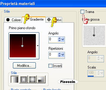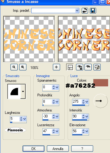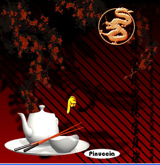 qui puoi trovare qualche risposta ai tuoi dubbi. Se l'argomento che ti interessa non è presente, ti prego di segnalarmelo. Occorrente: Materiale: qui Apri tutte le immagini in PSP. Apri il font e minimizzalo. Lo avrai immediatamente a disposizione del tuo strumento Testo. Dal momento che non tutti riescono ad aprire il font Mandarnn.pfm, ho aggiunto un secondo font orientale nello zip. Il primo è molto più carino, se riuscite ad aprirlo.... Ricordati di salvare spesso. Apri una nuova immagine trasparente 400 x 400. Imposta il colore di primo piano su #920000. Imposta il colore di sfondo sul nero. Passa il colore di primo piano a gradiente di primo piano/sfondo, con questi settaggi, trame non selezionato: ![]() Riempi l'immagine con il gradiente.Apri il file MD-ChinaStripes.psp e vai a Modifica>Copia. Torna al tuo lavoro e vai a Modifica>Incolla>Incolla come nuovo livello. Le strisce sono già al posto giusto, non muoverle. Apri il file MD-Shadow-1 e vai a Modifica>Copia. Torna al tuo lavoro e vai a Modifica>Incolla>Incolla come nuovo livello. L'ombra è già al posto giusto, non muoverla. Livelli>Duplica. Immagine>Ridimensiona, 75%, tipo di ricampionamento bicubica, tutti i livelli non selezionato. ![]() Sposta questa ombra un po' più in su.![]() Apri il file MD-Blossom1.psp e vai a Modifica>Copia. Torna al tuo lavoro e vai a Modifica>Incolla>Incolla come nuovo livello. Sposta i fiori in alto a sinistra.Apri il file MD-Blossom2.psp e vai a Modifica>Copia. Torna al tuo lavoro e vai a Modifica>Incolla>Incolla come nuovo livello. Sposta i fiori in alto a destra.Apri il file MD-Blossom3.psp e vai a Modifica>Copia. Torna al tuo lavoro e vai a Modifica>Incolla>Incolla come nuovo livello. Sposta i fiori tra gli altri due fiori.Se tutto è andato bene, dovresti avere questo: ![]() Apri il file MD-ChineesText.psp e vai a Modifica>Copia. Torna al tuo lavoro e vai a Modifica>Incolla>Incolla come nuovo livello. Spostalo a destra, come si vede nella schermata:![]() Apri il file MD-Dragon.psp e vai a Modifica>Copia. Torna al tuo lavoro e vai a Modifica>Incolla>Incolla come nuovo livello. Sposta il dragone come si vede nella schermata:![]() Apri il file MD-China.psp e vai a Modifica>Copia. Torna al tuo lavoro e vai a Modifica>Incolla>Incolla come nuovo livello. Spostalo in basso a sinistra (vedi schermata):![]() Infine apri il file MD-Shadow-2.psp e vai a Modifica>Copia. Torna al tuo lavoro e vai a Modifica>Incolla>Incolla come nuovo livello. Se non vedi l'ombra, attiva lo strumento Deformazione ![]() Renderà visibile l'ombra. Spostala sotto la tazzina, ma lasciala sporgere un po' in fondo.Nella paletta dei livelli sposta questo livello sotto il livello della tazzina. Livelli>Unisci>Unisci tutto (appiattisci). Imposta il colore di sfondo con #ffc66f e chiudi il colore di primo piano. Attiva lo strumento Testo e cerca il font Takeout (è nello zip).dimensione 28, pennellata 0, B per bold, antialias selezionato o Nitido. ![]() Scrivi il tuo testo. Io ho scritto "Chinese Corner". Livelli>Converti in livello raster. Effetti>Effetti 3D>Smusso a incasso, colore #a76252. ![]() Posiziona il testo nella tag.Livelli>Unisci>Unisci tutto (appiattisci). Immagine>Aggiungi bordatura, 5 pixels, simmetriche, con il colore nero. Immagine>Aggiungi bordatura, 5 pixels, simmetriche, con il colore #790000. Immagine>Aggiungi bordatura, 5 pixels, simmetriche, con il colore nero. ![]() Se hai problemi o dubbi, o trovi un link non funzionante, o anche soltanto per un saluto, scrivimi Luglio 2006 |