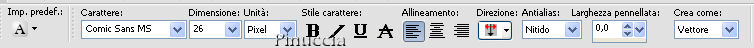 font Comic Sans MS (lo trovi nello zip con il materiale), dimensione 26, pennellata 0, B per Bold, antialias o nitido.
