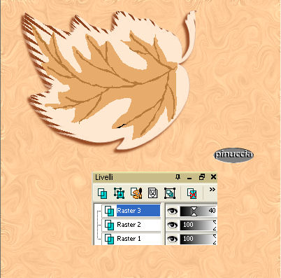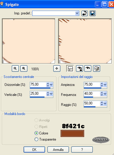 qui puoi trovare qualche risposta ai tuoi dubbi. Se l'argomento che ti interessa non è presente, ti prego di segnalarmelo. Occorrente: Materiale qui Eye Candy 3.1 qui Scompatta il filtro nella cartella plugins di PSP. Chiudi e riavvia PSP, altrimenti il filtro non funziona. Apri tutte le immagini dello zip in PSP. Apri il font e minimizzalo. Lo vedrai nella lista dei font disponibili attivando lo strumento Testo. Ricordati di salvare spesso. Apri una nuova immagine trasparente 400 x 400 pixels e riempila con il colore #ffcc99.Effetti>Plugins>Eye Candy 3.1 > Swirl. ![]() Applica. Apri una nuova immagine trasparente 250 x 200 pixels e riempila con il colore #ffe8d1.Apri MD-Fallmask.jpg. Livelli>Nuovo livello maschera>Da immagine. ![]() Cerca la maschera MD-Fallmask.jpg (inverti dati maschera selezionato) e clicca Applica. ![]() Livelli>Unisci>Unisci gruppo. Modifica>Copia e torna alla tua immagine 400x400. Modifica>Incolla>Incolla come nuovo livello. Sposta la foglia un po' in alto (vedi schermata).![]() Effetti>Effetti 3D>Sfalsa ombra, colore #8f421c. Attenzione il settaggio è verticale 4 e orizzontale -4. ![]() Selezione>seleziona tutto. Selezione>Mobile. Selezione>Immobilizza. (suona male ma è corretto così). Effetti>Effetti di deformazione>Spigato, colore #8f421c. ![]() Selezione>Nessuna selezione. Apri MD-InnerLeave.psp e vai a Modifica>Copia. Torna al tuo lavoro e vai a Modifica>Incolla>Incolla come nuovo livello. Sposta la foglia interna sopra la prima foglia.Nella paletta dei livelli abbassa l'opacità di questo livello al 40%. ![]() Livelli>Unisci>Unisci visibile. Apri uno dei funghi e vai a Modifica>Copia. Torna al tuo lavoro e vai a Modifica>Incolla>Incolla come nuovo livello. Apri il Porcospino e vai a Modifica>Copia. Torna al tuo lavoro e vai a Modifica>Incolla>Incolla come nuovo livello. Apri le due foglie (Leave 1 e 2) e vai a Modifica>Copia. Torna al tuo lavoro e vai a Modifica>Incolla>Incolla come nuovo livello. Usando i tubes, spostali e crea il tuo scenario. Questo è come appare il mio: ![]() Se sei soddisfatto, clicca sul livello di ogni tube che hai incollato e ripeti - un tube alla volta - l'Effetto Sfalsa ombra che hai usato per gli altri tubes. Chiudi il colore di primo piano e imposta il colore di sfondo con #8f421c. Attiva lo strumento Testo ![]() cerca il font Comic Sans Ms (è nello zip). Dimensione 36, pennellata 0, B per Bold, antialias selezionato o Nitido. Assicurati che l'allineamento sia impostato al centro. ![]() Scrivi Fall, o un altro testo autunnale o il tuo nome. Se hai un nome lungo, regola la dimensione del font. Clicca Applica. Livelli>Converti in livello raster. Effetti>Effetti 3D>Sfalsa ombra, con i settaggi precedenti. Livelli>Unisci>Unisci tutto (appiattisci). Immagine>Aggiungi bordatura, 5 pixels, simmetriche, con il colore #8f421c. Attiva la bacchetta magica (sfumatura 0)e seleziona il bordo marrone. Effetti>Effetti 3D>Smusso a incasso, colore bianco. ![]() Immagine>Aggiungi bordatura, 5 pixels, simmetriche, con il colore #ffe8d1. Seleziona il bordo con la bacchetta magica ![]() Effetti>Effetti 3D>Smusso a incasso, con i settaggi precedenti. Immagine>Aggiungi bordatura, 5 pixels, simmetriche, con il colore #8f421c. Seleziona il bordo marrone con la bacchetta magica ![]() Effetti>Effetti 3D>Smusso a incasso, con i settaggi precedenti. Selezione>Seleziona tutto. Selezione>Modifica>Contrai di 15 pixels. ![]() Selezione>Inverti. Effetti>Effetti di trama>Intessitura: Colori #703000 e #e5a563. ![]() Mantieni selezionato. Ripeti l'Effetto Sfalsa ombra ma questa volta Verticale e orizzontale a 4. ![]() Ripeti l'Effetto Sfalsa ombra ma cambiando verticale e orizzontale a -4. Selezione>Nessuna selezione. Apri MD- Chestnut.psp o MD-Rain.psp e vai a Modifica>Copia. Torna al tuo lavoro e vai a Modifica>Incolla>Incolla come nuovo livello. Posizionalo nell'angolo in alto a sinistra.Livelli>Unisci>Unisci tutto (appiattisci). ![]() ![]() ![]() Se hai problemi o dubbi, o trovi un link non funzionante, o anche soltanto per un saluto, scrivimi. Settembre 2006 |