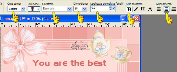 Attiva lo strumento testo e cerca il font Denmark, con i seguenti settaggi: