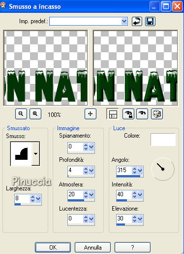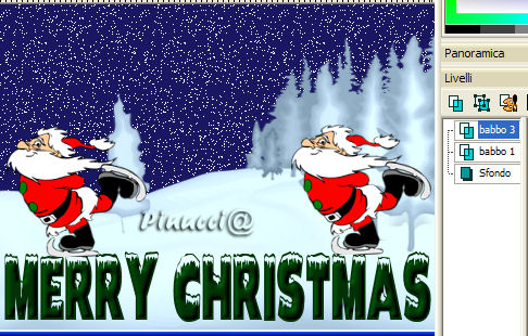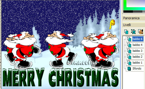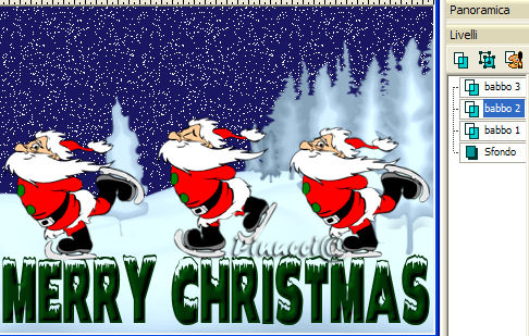 qui puoi trovare qualche risposta ai tuoi dubbi. Se l'argomento che ti interessa non è presente, ti prego di segnalarmelo. Questo tutorial è stato creato in PSP 9. Occorrente: Materiale qui Apri tutte le immagini in PSP. Apri il font e minimizzalo nella tua area di lavoro. Lo troverai disponibile nella lista dei font. Questo tutorial può essere eseguito soltanto se hai Animation Shop (AS). Lo trovi qui Ricordati di salvare spesso. Apri una nuova immagine trasparente 400 x 300 pixels e riempila con il colore #191761.Livelli>Nuovo livello raster. Riempi questo livello con il bianco (#ffffff).Nella paletta dei livelli cambia la modalità di miscelatura in Dissolvi e abbassa l'opacità al 6%. ![]() Apri MD-SnowScape.psp e vai a Modifica>Copia. Torna al tuo lavoro e vai a Modifica>Incolla>Incolla come nuovo livello. Spostalo tutto in basso.![]() Livelli>Unisci>Unisci tutto (appiattisci). Salva l'immagine come "immagine-lavoro.psp". Chiudi il colore di primo piano e passa il colore di sfondo a #023406. Attiva lo strumento Testo e cerca il font Chilled (nello zip).dimensione 48, pennellata 0, B per bold, antialias selezionato o Nitido. ![]() Scrivi il tuo testo tutto in lettere maiuscole. Io ho scritto "Merry Christmas". Come puoi vedere il testo è molto largo. Usando i nodi vettori, adatta il testo allo spazio della tag, anche alzandolo. ![]() Livelli>converti in livello raster. Effetti>Effetti 3D>Smusso a incasso, con il colore bianco: ![]() Livelli>Unisci>Unisci tutto (appiattisci). Apri MD-Skate-Santa-1.psp e vai a Modifica>Copia. Torna al tuo lavoro e vai a Modifica>Incolla>incolla come nuovo livello. Sposta il babbo natale sul lato destro del testo. Nella paletta dei livelli rinomina questo livello "babbo-1". Di nuovo: Modifica>Incolla>Incolla come nuovo livello. Sposta il secondo babbo natale sulla sinistra del testo. Nella paletta dei livelli rinomina questo livello "babbo-3". ![]() Apri MD-Skate-Santa-2.psp e vai a Modifica>Copia. Torna al tuo lavoro e vai a Modifica>Incolla>Incolla come nuovo livello. Spostalo al centro del testo.Nella paletta dei livelli rinomina questo livello "babbo-2". Nella paletta dei livelli sposta questo livello sotto il livello babbo-3. Nella paletta dei livelli dovresti avere questo: ![]() Puoi riconoscere i babbi natale dagli occhi. MD-Skate-Santa-2 ha gli occhi chiusi. Seleziona il livello superiore (deve diventare blu). Modifica>incolla>Incolla come nuovo livello: "MD-Skate-Santa2" è ancora in memoria. Immagine>Rifletti. Rinomina questo livello "babbo-4". Spostalo sopra babbo-3. ![]() Modifica>Incolla>incolla come nuovo livello. Sposta questo babbo natale sopra il primo babbo. Nella paletta dei livelli rinomina questo livello "babbo-6". ![]() Apri MD-Skate-Santa-1.psp e vai a Modifica>Copia. Torna al tuo lavoro e vai a Modifica>Incolla>Incolla come nuovo livello. Immagine>Rifletti. Sposta questo babbo natale al centro, sopra il secondo babbo. Rinomina questo livello "babbo-5". Nella paletta dei livelli sposta questo livello sotto il livello "babbo-6". Controlla che l'ordine dei babbi natale sia corretto. Fai così: chiudi tutti i livelli e aprili di nuovo, uno per uno dal basso all'alto. Adesso chiudi tutti i livelli eccetto il livello babbo-1. Anche il livello di sfondo è aperto. Non chiudetelo! Seleziona il livello babbo-1 (deve diventare blu). La tua paletta dei livelli deve apparire così: ![]() Livelli>Unisci>Unisci tutto (appiattisci). Copia questo livello uniti con Modifica>Copia. Modifica>Incolla>incolla come nuova immagine. Salva questa immagine come Skating-santa.psp. Ritorna alla tua "immagine-lavoro.psp". Modifica>Annulla azione Unisci tutto. Adesso chiudi il livello babbo-1 e apri il livello babbo-2. Livelli>Unisci>Unisci tutto (appiattisci). Copia questo livello uniti con Modifica>copia. Torna alla tua nuova immagine Skating-Santa.psp. Modifica>Incolla>incolla come nuovo livello. Ritorna alla tua "immagine-lavoro.psp". Modifica>Annulla azione unisci tutto .Chiudi il livello babbo-2 e apri il livello babbo-3. Livelli>Unisci>Unisci tutto (appiattisci). Copia questo livello uniti con Modifica>copia. Vai alla tua nuova immagine Skating-santa-psp. Modifica>Incolla>Incolla come nuovo livello. Ritorna alla tua "immagine-lavoro.psp". Modifica>Annulla azione unisci tutto. Ripeti questi passi finchè il file Skating-Santa.psp non avrà sei livelli, con sei differenti posizioni di Babbo Natale. Apri e chiudi tutti i livelli per controllare se i Babbi Natale sono nell'ordine giusto. Babbo Natale pattina da destra a sinistra e poi torna indietro. Chiudi i 5 livelli superiori per il momento. Seleziona il livello inferiore (deve diventare blu). Apri MD-Snow.psp e vai a Modifica>Copia. Torna al tuo Skating-Santa.psp. Modifica>Incolla>Incolla come nuovo livello. Muovi il livello della neve di circa un terzo in alto. Livelli>Unisci>Unisci visibile. Chiudi questo livello, apri e seleziona il livello sopra (deve diventare blu). Modifica>Incolla>incolla come nuovo livello. Sposta questo livello neve più su, ma un po' meno del precedente. Livelli>unisci>Unisci visibile. Ripeti questi passaggi per tutti i sei livelli. Assicurati che la neve si muova in maniera differente su ogni livello. Gioca un po' con i livelli della neve (questa deve cadere giù). Ricorda di chiudere ogni livello unito e di aprire e selezionare il livello sopra. Questi passaggi sono molto importanti. Quando hai finito, riapri tutti i livelli con Visualizza>tutto. Adesso devi avere 6 livelli: lo stesso numero che avevi quando sei partito. Salva di nuovo la tua immagine come skating-santa.psp. Per chi usa PSP 7 può salvare così. Per chi usa le versione superiori di PSP, poichè Animation Shop non riconosce i file .pspimage, devi salvare come file .psp. Ci sono due modi differenti. Per le vecchie versioni di PSP 8 e 9: clicca su opzioni e salva come file .psp 7 compatibile. ![]() Per le ultime versioni di PSP 9 e PSP X, esiste direttamente l'opzione salva come .psp per animation shop. Ce