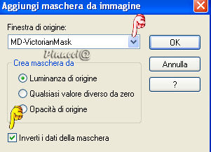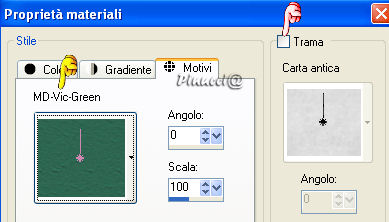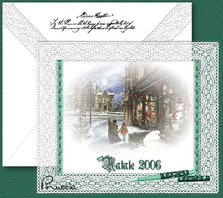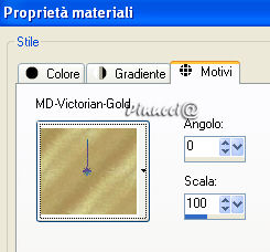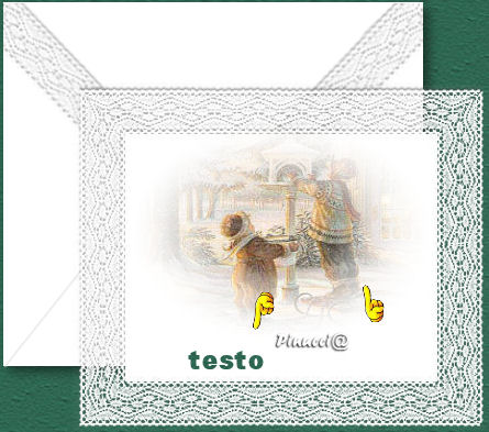 qui puoi trovare qualche risposta ai tuoi dubbi. Se l'argomento che ti interessa non è presente, ti prego di segnalarmelo. Occorrente: Materiale qui Salva la maschera nella cartella Maschere di Psp. Apri tutte le immagini in PSP. Apri il font e minimizzalo nella tua area di lavoro. Lo ritroverai disponibile nella lista dei font. Ricordati di salvare spesso. Questo tutorial è stato fatto con PSP 9. Apri una nuova immagine trasparente 450 x 400 pixels. Imposta il colore di primo piano su Motivi. Apri il menu a fianco del box e cerca "MD-Vic-Green.jpg"> Trame non selezionato (manina rossa). ![]() Naturalmente, puoi anche usare un altro Motivo a tua scelta. Riempi la tua immagine con il Motivo.Livelli>Nuovo livello raster. Attiva lo strumento Selezione , rettangolo, sfumatura 0,e seleziona una larga parte della tua immagine e riempila con il bianco (#ffffff).![]() Hai appena creato la busta. Effetti>Effetti 3D>Sfalsa ombra, con il colore nero. ![]() Selezione>Nessuna selezione. Apri MD-Victorian-envelope.psp e vai a Modifica>Copia. Torna al tuo lavoro e vai a Modifica>Incolla>Incolla come nuovo livello. Con lo strumento Deformazione ![]() ridimensiona e gira la selezione in modo che si adatti alla busta. ![]() Quando hai finito dovresti avere qualcosa di simile a questo: ![]() Chiudi per il momento il livello inferiore, quello dello sfondo. Livelli>Unisci>Unisci visibile. Puoi riaprire il livello di sfondo. Sposta la busta in alto a sinistrama lascia un piccolo spazio dal bordo: ![]() Apri una nuova immagine trasparente 380 x 315 pixels, e riempila con il bianco.Apri MD-VictorianMask.jpg. Livelli>Nuovo livello maschera. ![]() Apri il menu cliccando sulla freccia a fianco del box (manina rossa), cerca e seleziona MD-VictorianMask.jpg e clicca ok. ![]() Livelli>Unisci>Unisci gruppo. Modifica>Copia. Torna al tuo lavoro con la busta e vai a Modifica>Incolla>incolla come nuovo livello. Effetti>effetti 3D>Sfalsa ombra, con il colore #404040. ![]() Sposta la cartolina in basso a destra,ma lascia visibili porzioni del Motivo. ![]() Apri le immagini "Victorian Christmas" fornite nello zip e scegline una. Livelli>Innalza a livello di sfondo. Livelli>Carica/Salva maschera>Carica maschera da disco: ![]() Cerca la maschera !Circle Gradient fornita con il materiale, che hai salvato nella cartella maschere. ![]() Livelli>Unisci>Unisci gruppo. Se la tua immagine ha del bianco o tinte chiare di sfondo, è sufficiente usare questa maschera. Se usi una immagine con colori più scuri, ripeti l'applicazione della maschera. Se lo fai, non dimenticare, dopo il caricamento della maschera: Livelli>Unisci>Unisci gruppo. Modifica>Copia. Torna alla tua cartolina e vai a Modifica>Incolla>Incolla come nuovo livello. Sposta l'immagine sulla cartolina,lasciando lo spazio per il testo: ![]() Chiudi il colore di primo piano. Imposta il colore di sfondo con un colore preso dalla tua immagine. oppure usa un Motivo dorato (lo trovi nello zip). Io ho usato il colore #ca9c1e. Se vuoi usare il pattern, usa questi settaggi: ![]() Attiva lo strumento Testo ![]() seleziona il font Rothenburg Decorative (nello zip), dimensione 18, pennellata 0, B per bold, antialias selezionato o Nitido: ![]() Scrivi il tuo testo. Se necessario, regola la dimensione del font, a seconda del testo che usi. Livelli>Converti in livello raster. Effetti>Effetti 3D>Sfalsa ombra, colore nero: ![]() Livelli>Unisci>Unisci visibile. Apri una delle penne incluse nello zip e vai a Modifica>Copia. Io ho usato MD-Pen-3, perchè si adattava ai colori della mia cartolina. Modifica>Copia. Torna alla tua cartolina e vai a Modifica>Incolla>Incolla come nuovo livello. Spostala dove preferisci.Apri MD-text.psp e vai a Modifica>Copia. Torna alla tua cartolina e vai a Modifica>Incolla>Incolla come nuovo livello. Metti il testo sulla busta.Per finire, apri MD-VictorianRibbon.psp e vai a Modifica>Copia. Se la tua cartolina ha altri colori e vuoi colorizzare il nastro, fai questo per prima cosa. Come usare il viraggio vedi qui Torna alla tua cartolina e vai a Modifica>Incolla>Incolla come nuovo livello. Metti il nastro contro il merletto.Livelli>Unisci>Unisci tutto (appiattisci). La tua cartolina è finita. Firma e salva in formato jpg. ![]() ![]() ![]() ![]() Se hai problemi o dubbi, o trovi un link non funzionante, o anche soltanto per un saluto, scrivimi. Dicembre 2006 |