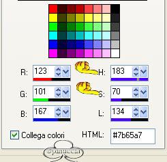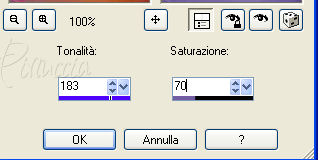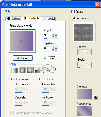 qui puoi trovare qualche risposta ai tuoi dubbi. Se l'argomento che ti interessa non č presente, ti prego di segnalarmelo. Materiale occorrente: 2 tube e un'immagine qui I tubes sono di Suzanne Apri una nuova immagine trasparente 500x500. Scegli due colori compatibili con i colori dei tubes e dell'immagine fornite con questa lezione. Riempi la tela con uno dei due colori. Attiva lo strumento Selezione e vai a Selezione personalizzata: ![]() e riempi le caselline con questi settaggi: ![]() Livelli>Nuovo livello raster. Riempi la selezione con il gradiente creato con i colori scelti e con questo settaggio: ![]() Selezione>Nessuna selezione. Effetti>Effetti di distorsione>Vento, da destra, intensitā del vento: 100. Abbasa l'opacitā di questo livello al 65%. Livelli>Duplica. Immagine>Rifletti. Chiudi il livello inferiore. Livelli>Unisci>Unisci visibile. Regola>Sfocatura>Sfocatura gaussiana: 5. Apri adesso l'immagine di sfondo (file "plaatje">) Devi prima di tutto regolare il colore. Prima clicca sulla paletta dei materiali per prendere nota dei numeri relativi al colore che hai usato per riempire la tela. ![]() Prendi nota dei due colori. Regola>Saturazione e tonalitā>Viraggio. Imposta i numeri del tuo colore. ![]() L'immagine di sfondo adesso ha il colore della tua tela. Modifica>Copia. Ritorna al tuo lavoro. Seleziona>Seleziona tutto. Livelli>Nuovo livello raster. Modifica>Incolla>Incolla nella selezione. Selezione>Nessuna selezione. Abbassa l'opacitā di questo livello al 20%. Livelli>Duplica. Immagine>Rifletti. Chiudi il livello inferiore. Livelli>Unisci>Unisci visibile. Puoi riaprire il livello inferiore. Apri il tube scelto per eseguire il tutorial. Dovrai applicare la maschera 20-20. Livelli>Carica/Salva maschera>Carica maschera da disco e cerca la maschera 20-20 (se non ce l'hai, preleva qui. Applica. Livelli>Unisci>Unisci gruppo. Modifica>Copia. Ritorna al tuo lavoro e vai a Modifica>Incolla>Incolla come nuovo livello. Posizionalo sulla destra. Apri il secondo tube e vai a Modifica>Copia. Torna al tuo lavoro e vai a Modifica>Incolla>Incolla come nuovo livello. Abbassa l'opacitā di questo livello al 30% e cambia la modalitā di miscelatura in Sovrapponi. Adesso puoi mettere delle piccole linee come decoro. Puoi scegliere. Ecco come ho fatto io. Attiva lo strumento penna ![]() e imposta il colore di primo piano #404040. Scegli la linea con la punta di freccia iniziale. ![]() Tenendo premuto il tasto shift (in questo modo la riga verrā diritta), traccia due linee. Nella paletta dei livelli converti il livello vettore in livello raster. Livelli>Duplica. Immagine>Capovolgi. Immagine>Rifletti. Immagine>Ruota>ruota per gradi: 90 a sinistra. Posiziona le linee nell'angolo in alto a sinistra. Immagine>Aggiungi bordatura, 1 pixel, simmetriche, con il colore scuro. Immagine>Ridimensiona 400 x 400 pixels (se vuoi ridurre il blend). Firma e salva. ![]() Se hai problemi o dubbi, o trovi un link non funzionante, o anche soltanto per un saluto, scrivimi. marzo 2006 |