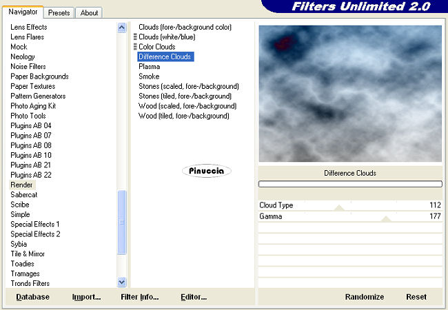 2. Effets>Modules Externes>Filters Unlimited Unlimited 2.0 - Render - Difference Clouds