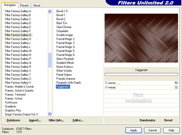 2. Effets>Modules Externes>Filters Unlimited 2.0 - Filter Factory Gallery G - Xaggerate.