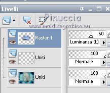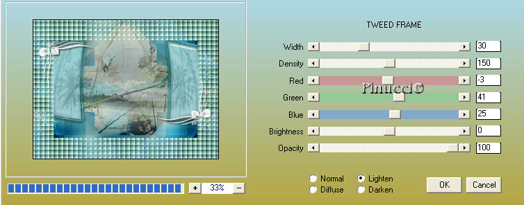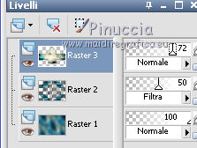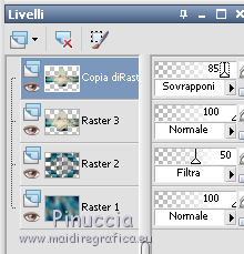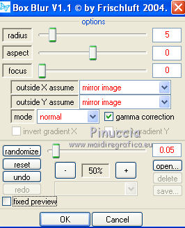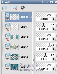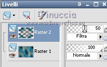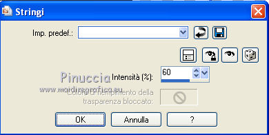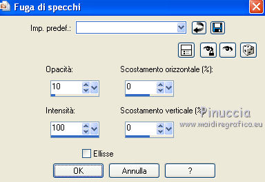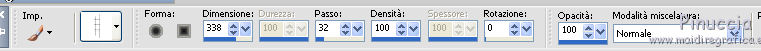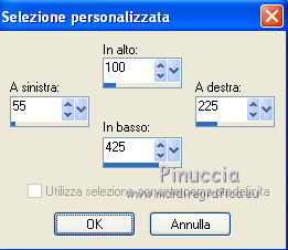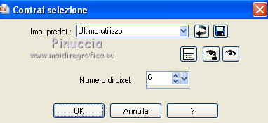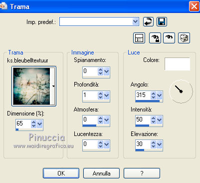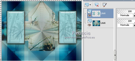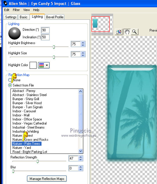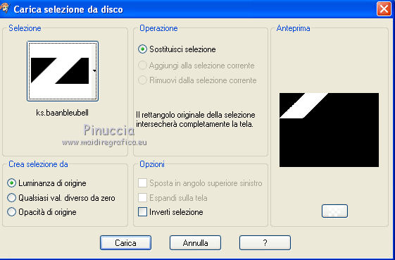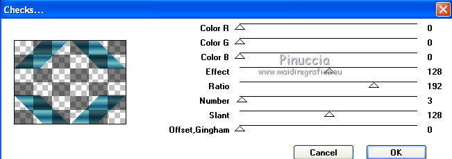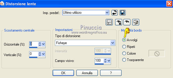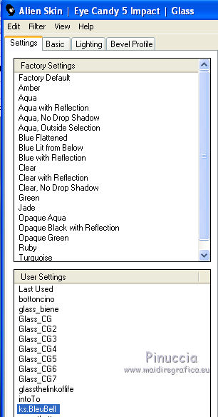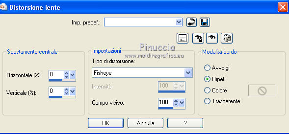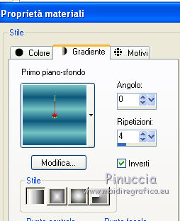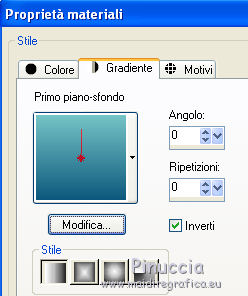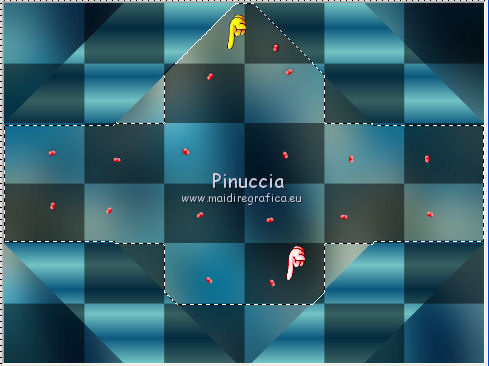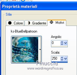 qui puoi trovare qualche risposta ai tuoi dubbi. Se l'argomento che ti interessa non è presente, ti prego di segnalarmelo. Questo tutorial è stato scritto con PSP X2, ma può essere eseguito anche con le altre versioni di PSP. Per tradurlo, ho usato PSP X. Occorrente: Materiale qui Rispetta il lavoro degli autori e mantieni i tubes al loro stato originale. Filtri: Alien Skin Eye Candy 5 Impact - Glass e Perspective Shadow qui Mura Seamless - Checks qui Frishhuft - Box Blur qui Simple qui AAA Filter - Tweed Frame qui ![]() Metti la selezione ks.baanbleubell nella cartella Selezioni. Metti la trama ks.bleubelltextuur nella cartella Trame. Metti i pennelli BrushTip ks.bleubell.corner2 e kslijin 1 nella cartella Pennelli. Metti i preset KS.BleuBell e Ks.bleubell-shadow nella cartella del filtro Alien Skin Eye Candy 5 Impact>Settings>Glass e Alien Skin Eye Candy 5 Impact>Settings>Shadow. Se preferisci, puoi importarli, quando ti serviranno, direttamente dalla cartella in cui hai scompattato il materiale. Vedi la scheda del filtro qui e come importare un preset in Eye Candy qui Apri il resto del materiale in PSP, compreso il motivo ks-BlueBellpatroon. 1. Apri una nuova immagine trasparente 800 x 600 pixels. ![]() Passa il colore di primo piano a Motivi; apri il menu e troverai oltre ai motivi disponibili tutti i files aperti in PSP. Seleziona il motivo ks.Bluebellpatroon, con i seguenti settaggi. ![]() Riempi l'immagine trasparente con questo motivo.Regola>Sfocatura>Sfocatura gaussiana - raggio 35. ![]() 2. Imposta il colore di primo piano con #74c4c5, e il colore di sfondo con #0d587d. Passa il colore di primo piano a Gradiente lineare: ![]() 3. Selezione>Carica/Salva selezione>Carica selezione da disco. Cerca e carica la selezione ks.baanbleubell. ![]() Riempi la selezione con il gradiente.Selezione>Deseleziona. 4. Livelli>Duplica. Immagine>Rifletti. Livelli>Unisci>Unisci giù. Livelli>Duplica. Immagine>Capovolgi. Livelli>Unisci>Unisci giù. 5. Effetti>Plugins>Mura Seamless - Checks. ![]() Attiva lo strumento Bacchetta magica ![]() ![]() Clicca, a cominciare dal primo triangolo indicato dalla manina, continua con il triangolo accanto, e poi via via tutti i quadrati indicati dal puntino rosso, fino all'ultimo indicato dalla manina rossa. Alla fine dovresti avere questo. ![]() Cambia la modalità di miscelatura di questo livello in Filtra, e abbassa l'opacità al 50%. ![]() 6. Livelli>Nuovo livello raster. Apri l'immagine bleubell-plaatje e vai a Modifica>Copia. Torna al tuo lavoro e vai a Modifica>Incolla nella selezione. Selezione>Deseleziona. 7. Livelli>Duplica. Effetti>Effetti di distorsione>Stringi. ![]() Cambia la modalità di miscelatura di questo livello in Sovrapponi, e abbassa l'opacità all'85%. ![]() Effetti>Effetti 3D>Sfalsa ombra, con il colore nero. ![]() Ripeti l'Effetto Sfalsa ombra, cambiando verticale e orizzontale con -4. Livelli>Unisci>Unisci giù. Abbassa l'opacità di questo livello al 72%. ![]() 8. Effetti>Effetti di riflesso>Fuga di specchi. ![]() Effetti>Effetti di bordo>Aumenta. 9. Attiva lo strumento Selezione ,clicca sull'icona Selezione personalizzata ![]() e imposta i seguenti settaggi: ![]() Livelli>Nuovo livello raster. Cambia i settaggi del gradiente. ![]() Riempi la selezione con questo gradiente.11. Effetti>Plugins>Frischluft - Box Blur. ![]() Effetti>Plugins>Alien Skin Eye Candy 5 Impact - Glass, prima seleziona il preset ks-bleuBelle poi, sotto Lighting seleziona Nature-Palm Trees. ![]() ![]() Selezione>Deseleziona. 12. Effetti>Effetti 3D>Sfalsa ombra, come al punto 7. Livelli>Duplica. Immagine>Rifletti. Livelli>Unisci>Unisci giù. 13. Apri il template ks.bleubell e vai a Modifica>Copia. Torna al tuo lavoro e vai a Modifica>Incolla come nuovo livello. Non spostarlo!! Effetti>Effetti di immagine>Scostamento. ![]() 14. Livelli>Duplica. Effetti>Effetti di immagine>Scostamento. ![]() Effetti>Plugins>Simple - 4Way Average. Cambia la modalità di miscelatura di questo livello in Rafforza, e riporta l'opacità al 100%. ![]() 15. Effetti>Effetti di bordo>Aumenta. Chiudi i livelli Raster 4 e Raster 5. ![]() Attiva il livello inferiore. Livelli>Unisci>Unisci visibile. Riapri i livelli Raster 4 e Raster 5. Chiudi il livello inferiore. Livelli>Unisci>Unisci visibile. Riapri il livello inferiore, rimanendo posizionato sull'ultimo livello uniti. ![]() 16. Effetti>Effetti di distorsione>Distorsione lente. ![]() una piccola nota su questo effetto. Il tutorial originale indicava come tipo di distorsione "barile" e campo visivo 100. Nel mio esempio mi sono trovata "barile" con l'unica opzione selezionabile "intensità"; mentre "fisheye" mi consentiva soltanto "campo visivo". Così, ho deciso di usare questi settaggi. A te la scelta se seguire o no il mio esempio. La differenza tra le due opzioni è impercettibile. Apri il template ksbleubellframe e vai a Modifica>Copia. Torna al tuo lavoro e vai a Modifica>Incolla come nuovo livello. Posiziona correttamente le due cornici come nell'esempio.![]() 17. Livelli>Unisci>Unisci giù. Livelli>Nuovo livello raster. Imposta il colore di primo piano con il colore bianco. Attiva lo strumento Pennello ![]() cerca e seleziona il pennello kslinjie: questo pennello è "orfano" del suo script. Per questo potresti non vederlo nella lista dei pennelli disponibili. In questo caso, apri il file in PSP e vai a File>Esporta>Pennello personalizzato; assegna un nome (diverso dall'originale) al pennello e clicca ok. Vedi gli appunti sui Pennelli qui ![]() Applicalo in alto a destra, cliccando con il tasto sinistro del mouse per usare il colore bianco di primo piano. ![]() 18. Livelli>Duplica. Immagine>Capovolgi. Livelli>Unisci>Unisci giù. Livelli>Duplica. Immagine>Rifletti. Livelli>Unisci>Unisci giù. Livelli>Disponi>Sposta giù. Effetti>Effetti di distorsione>Distorsione lente, come al punto 16, ma selezionato Avvolgi. valgono le stesse considerazioni del punto precedente ![]() Cambia la modalità di miscelatura di questo livello in Sovrapponi. 