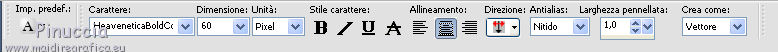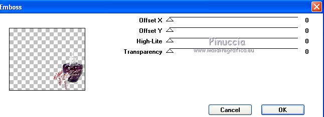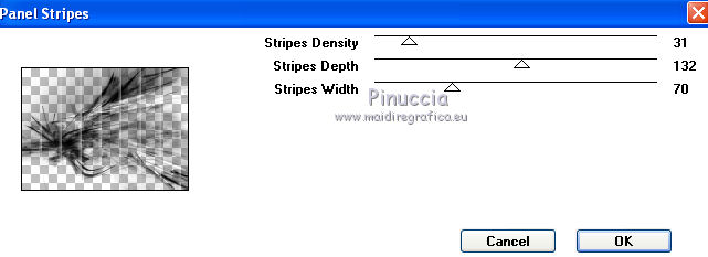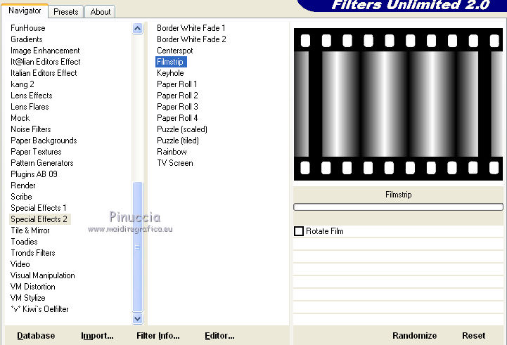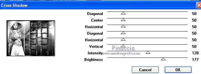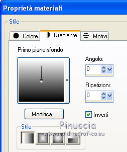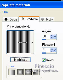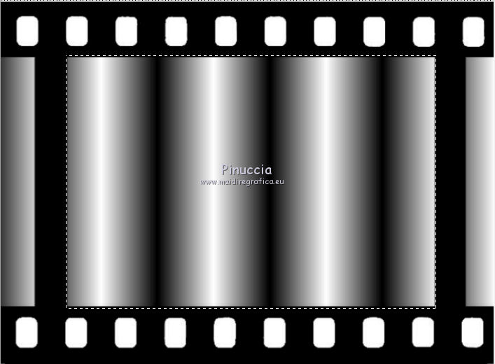 qui puoi trovare qualche risposta ai tuoi dubbi. Se l'argomento che ti interessa non è presente, ti prego di segnalarmelo. Questo tutorial è stato scritto con PSP X2, ma può essere eseguito anche con le altre versioni di PSP. Per tradurlo, ho usato PSP X. Occorrente: Materiale qui Rispetta il lavoro degli autori e mantieni i tubes al loro stato originale. Filtri: Filters Unlimited 2.0 qui Graphics Plus qui ![]() Apri il font e minimizzalo. Lo troverai nella lista dei font disponibili, quando ti servirà. Metti la maschera nella cartella Maschere, e apri il resto del materiale in PSP. 1. Apri una nuova immagine trasparente 750 x 550 pixels. Imposta il colore di primo piano con il bianco, e il colore di sfondo con il nero. Passa il colore di primo piano a Gradiente lineare. ![]() Riempi l'immagine trasparente con il gradiente.Livelli>Nuovo livello raster. Riempi il livello con il colore nero (tasto destro del mouse).2. Livelli>Carica/Salva maschera>Carica maschera da disco. Cerca e carica la maschera masker_20%Birry. ![]() Livelli>Unisci>Unisci gruppo. Effetti>Plugins>Graphics Plus - Panel Stripes. ![]() Effetti>Effetti di bordo>Aumenta. Livelli>Unisci>Unisci giù. 3. Apri il tube damesjiek e vai a Modifica>Copia. Torna al tuo lavoro e vai a Modifica>Incolla come nuovo livello. Immagine>Ridimensiona, all'80%, tutti i livelli non selezionato. Sposta il tube a sinistra.Effetti>Effetti 3D>Sfalsa ombra. ![]() Livelli>Unisci>Unisci visibile. 4. Apri il tube filmstrip_ks e vai a Modifica>Copia. Torna al tuo lavoro e vai a Modifica>Incolla come nuovo livello. Posiziona il film come nel mio esempio.Effetti>Effetti 3D>Sfalsa ombra, con i settaggi precedenti. Livelli>Duplica, e posiziona il film accanto al precedente.![]() 5. Immagine>Aggiungi bordatura, 2 pixels, simmetriche, con il colore nero. Immagine>Aggiungi bordatura, 6 pixels, simmetriche, con il colore bianco. Immagine>Aggiungi bordatura, 2 pixels, simmetriche, con il colore nero. Seleziona con la bacchetta magica il bordo bianco da 6 pixels.Cambia i settaggi del gradiente. ![]() Riempi la selezione con il gradiente.Effetti>Plugins>Graphics Plus - Cross Shadow. ![]() Selezione>Deseleziona. 6. Attiva lo strumento Selezione , rettangolo,e seleziona la prima cornice del film. ![]() Apri uno dei tubes con le boccette di profumo a tua scelta e vai a Modifica>Copia. Torna al tuo lavoro e vai a Modifica>Incolla nella selezione. Immagine>Scala dei grigi. Selezione>Deseleziona. Ripeti questo passsaggio per gli altri undici fotogrammi del film. Selezione>Deseleziona. 7. Effetti>Plugins>Graphics Plus - Cross Shadow. ![]() Effetti>Plugins>Graphics Plus - White Out. ![]() Metti da parte il lavoro, per il momento. 8. Apri una nuova immagine trasparente 750 x 550 pixels, e riempila con il gradiente del punto 5.Effetti>Plugins>Special Effects 2 - Filmstrip. ![]() Attiva lo strumento Selezione , rettangolo,e seleziona il quadro centrale. ![]() 9. Attiva il livello che hai messo da parte prima e vai a Modifica>Copia. Torna al secondo lavoro e vai a Modifica>Incolla nella selezione. Selezione>Deseleziona. Apri il tube Leny makeup 9 e vai a Modifica>Copia. Torna al tuo lavoro e vai a Modifica>Incolla come nuovo livello. Sposta il flacone in basso a destra.Cambia la modalità di miscelatura di questo livello in Luminanza (esistente). 10. Effetti>Plugins>Graphics Plus - Emboss. ![]() Effetti>Effetti 3D>Sfalsa ombra, come al punto 3. ![]() Aggiungi il tuo nome e/o il tuo watermark su un nuovo livello. livelli>Unisci>Unisci tutto. 11. Immagine>Ruota a destra. se stai usando PSP 9: Immagine>Ruota - 90 gradi in senso orario. Attiva lo strumento Testo ![]() ![]() dovrai regolare la dimensione in base al tuo testo e alla versione di PSP che stai usando Imposta il colore nero come colore di primo piano e il gradiente come colore di sfondo. ![]() Scrivi il primo testo. Livelli>Converti in livello raster. Livelli>Unisci>Unisci giù. 12. Immagine>Ruota a sinistra. PSP 9: Immagine>Ruota - 90 gradi in senso antiorario Di nuovo Immagine>Ruota a sinistra. Scrivi il secondo testo. Livelli>Converti in livello raster. Livelli>Unisci>Unisci giù. Immagine>Ruota a destra. Salva in formato jpg.