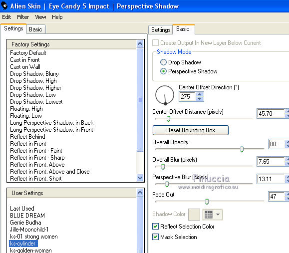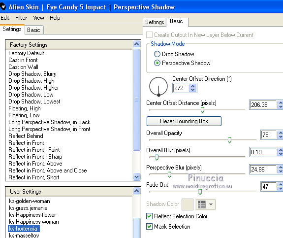 Effets>Modules Externes>Alien skin Eye Candy 5 Impact - Perspective Shadow.
