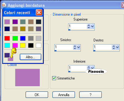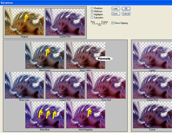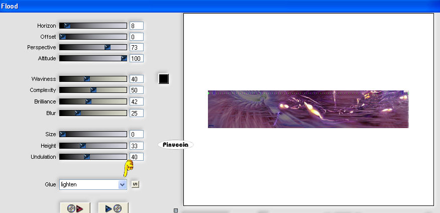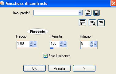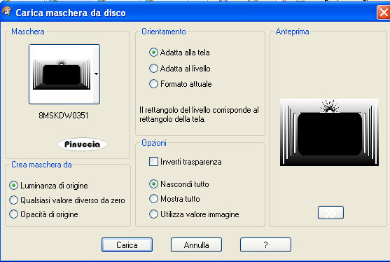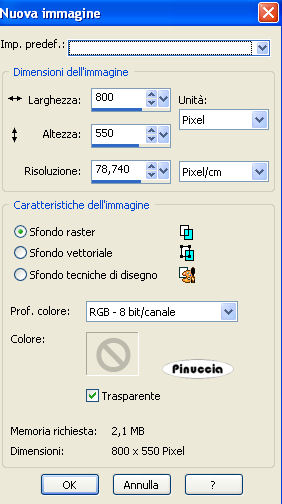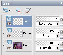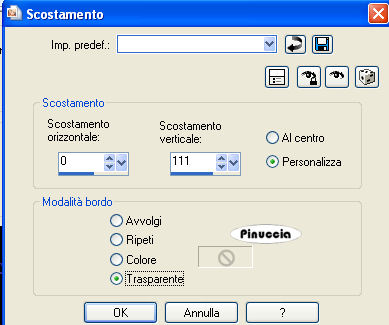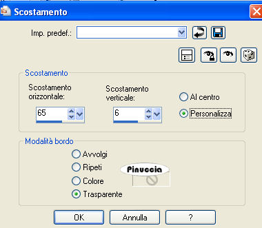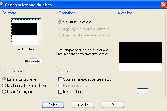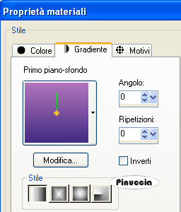 qui puoi trovare qualche risposta ai tuoi dubbi. Se l'argomento che ti interessa non è presente, ti prego di segnalarmelo. Questo tutorial è stato scritto con PSP X2, ma può essere eseguito anche con le altre versioni di PSP. Per tradurlo, ho usato PSP X. Occorrente: Materiale qui Il bel tube del fiore è di Annelies. Rispetta il lavoro degli autori e mantieni i tubes al loro stato originale. Filtri: Toadies qui Adjust - Variations qui Screenworks qui Flaming Pear - Flood qui Metti le selezioni nella cartella Selezioni. Metti la maschera nella cartella Maschere, e apri il resto del materiale in PSP. 1. Apri una nuova immagine trasparente 800 x 550 pixels. ![]() Selezione>Seleziona tutto. 2. Apri l'immagine "Display" e vai a Modifica>Copia. Torna al tuo lavoro e vai a Modifica>Incolla nella selezione. Selezione>Deseleziona. 3. Effetti>Plugins>Toadies - Glaswork color. ![]() Effetti>Plugins>Adjust - Variations: un primo clic su Original, per annullare eventuali precedenti settaggi memorizzati dal filtro; 1 clic su More Green, 1 clic su More Magenta, 3 clic su More Reed e ok. ![]() 4. Apri l'immagine "Tini Dancer 2" e vai a Modifica>Copia. Torna al tuo lavoro e vai a Modifica>Incolla come nuovo livello. 5. Cambia la modalità di miscelatura di questo livello in Filtra. ![]() Regola>Messa a fuoco>Metti a fuoco. Effetti>Effetti di immagine>Scostamento. ![]() E' rimasto dello spazio trasparente nei bordi, che dovrai riempire. ![]() Livelli>Nuovo livello raster. Livelli>Disponi>Porta sotto. Riempi con il colore nero.Attiva nuovamente il livello superiore. 7. Livelli>Nuovo livello raster. Imposta il colore di primo piano con #112c81, e il colore di sfondo con #b374bc. Passa il colore di primo piano a Gradiente. ![]() 8. Riempi il livello con il gradiente.Livelli>Carica/Salva maschera>Carica maschera da disco. Cerca e carica la maschera 8MSDKDW08. ![]() Livelli>Unisci>Unisci gruppo. 9. Effetti>Effetti di immagine>Scostamento. ![]() Effetti>Effetti di bordo>Aumenta. 10. Livelli>Unisci>Unisci visibile. Selezione>Carica/Salva selezione>Carica selezione da disco. Cerca e carica la selezione Let Dance. ![]() 11. Effetti>Plugins>Flaming Pear - Flood. ![]() Selezione>Deseleziona. 12. Apri Template Let-Dance e vai a Modifica>Copia. Torna al tuo lavoro e vai a Modifica>Incolla come nuovo livello. 13. Apri il tube Alies 70 bloemen ìe vai a Modifica>Copia. Torna al tuo lavoro e vai a Modifica>Incolla come nuovo livello. Immagine>Rifletti. Sposta il tube in basso a destra.![]() 14. Livelli>Duplica. Effetti>Effetti di distorsione>Vento, da destra, intensità 100. ![]() Livelli>Disponi>Sposta giù. Cambia la modalità di miscelatura di questo livello in Filtra. ![]() 15. Apri il tube Hairtoy e vai a Modifica>Copia. Torna al tuo lavoro e vai a Modifica>Incolla come nuovo livello. Immagine>Rifletti. Immagine>Ridimensiona, al 90%, tutti i livelli non selezionato. 16. Sposta il tube a sinistra.![]() Effetti>Effetti 3D>sfalsa ombra. ![]() 17. Livelli>Unisci>Unisci visibile. Selezione>Carica/Salva selezione>Carica selezione da disco. Cerca e carica la selezione ks-ruiten. ![]() 18. Livelli>Nuovo livello raster. Riempi con il gradiente del punto 8.Selezione>Deseleziona. 19. Attiva lo strumento Selezione , rettangolo,e seleziona i piccoli quadri in alto al centro. ![]() Premi sulla tastiera il tasto CANC. Selezione>Deseleziona. 20. Effetti>Plugins>Screenworks - Dot Screen. ![]() Cambia la modalità di miscelatura di questo livello in Filtra. ![]() 21. Livelli>Duplica. Effetti>Effetti di distorsione>Vento, da destra, intensità 50. ![]() Cambia la modalità di miscelatura di questo livello in Luce netta, e abbassa l'opacità al 46%. ![]() Livelli>Unisci>Unisci giù. 22. Livelli>Nuovo livello raster. Riempi con il colore #412c81.Selezione>Seleziona tutto. Selezione>Modifica>Contrai - 10 pixels. ![]() Premi sulla tastiera il tasto CANC. Selezione>Deseleziona. 12. Clicca sul bordo con la bacchetta magica ![]() ![]() Effetti>Plugins>Screenworks, con i settaggi precedenti. Selezione>Deseleziona. 24. Immagine>Aggiungi bordatura, 1 pixel, selezionato, con il colore di sfondo #b374bc: clicca con il tasto destro del mouse sulla paletta del colore; ti apparirà una tabellina con i colori recenti e, in basso a sinistra, la tua paletta dei materiali; clicca sul colore corrispondente per impostarlo. ![]() Regola>Messa a fuoco>Maschera di contrasto. ![]() 25. Aggiungi il tuo nome e/o il tuo watermark su un nuovo livello. Livelli>Unisci>Unisci tutto e salva in formato jpg.