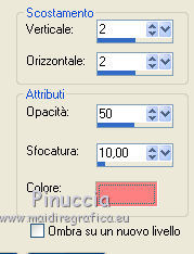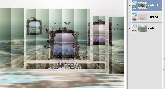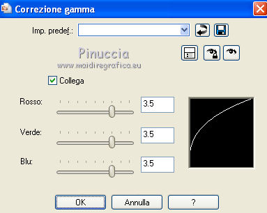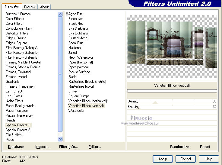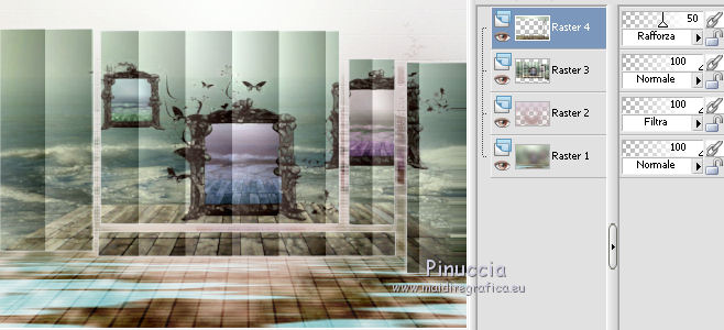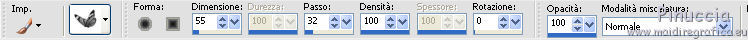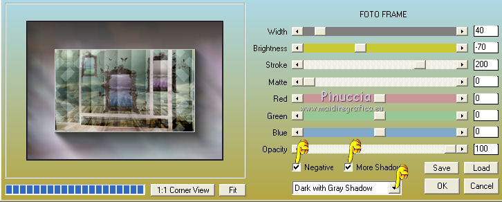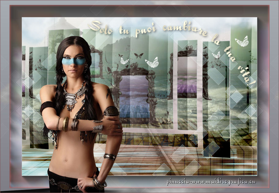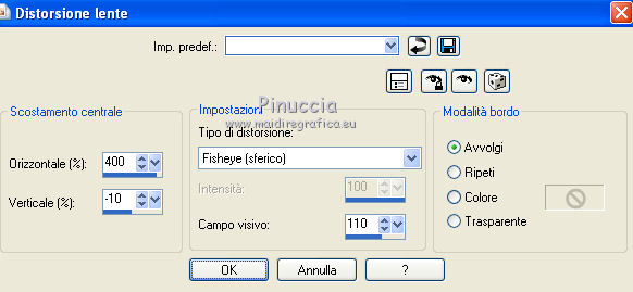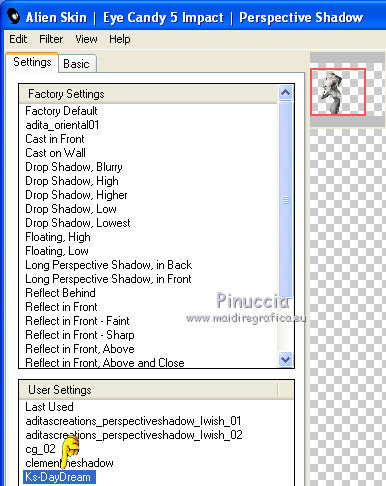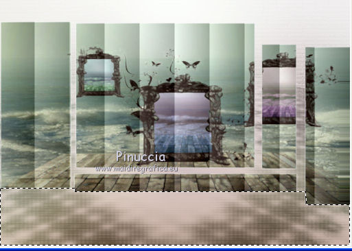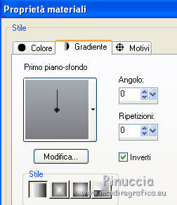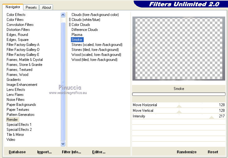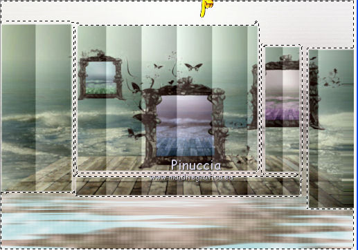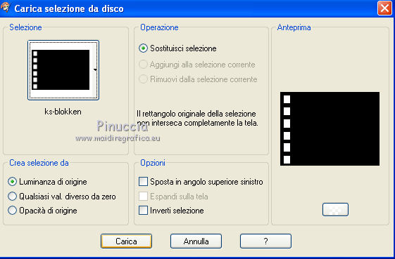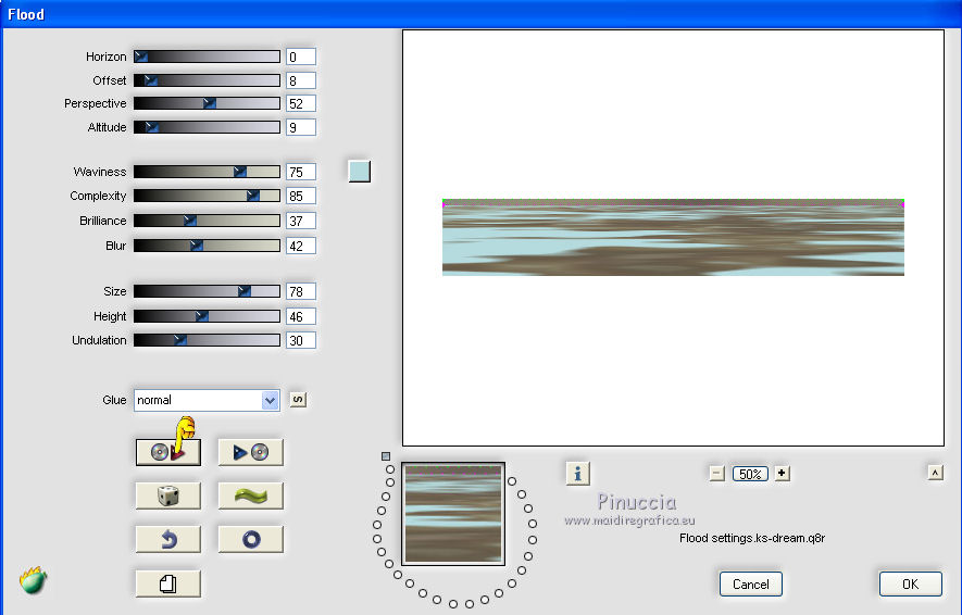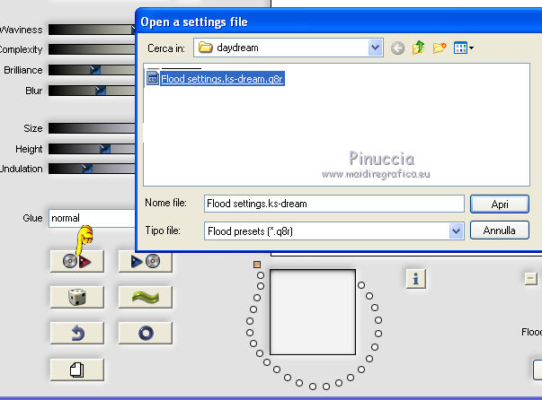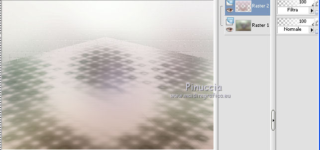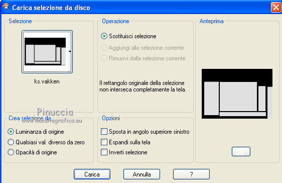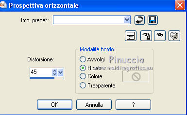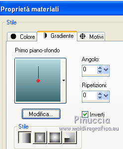 qui puoi trovare qualche risposta ai tuoi dubbi. Se l'argomento che ti interessa non è presente, ti prego di segnalarmelo. Questo tutorial è stato scritto con PSP X2, ma può essere eseguito anche con le altre versioni di PSP. Per tradurlo, ho usato PSP X. Occorrente: Materiale qui Rispetta il lavoro degli autori e mantieni i tubes al loro stato originale. Filtri: Alien Skin Eye Candy 5 Impact qui Filters Unlimited 2.0 qui Flaming Pear - Flood qui Simple qui AAA Frames qui ![]() Metti le selezioni ks.vakken e ks.blokken nella cartella Selezioni. Metti il preset flood settings.ks-dream.q8r nella cartella del filtro Flood. Metti i preset KS.DayDream nella cartella del filtro Alien Skin Eye Candy 5 Impact>Settings>Shadow. Se preferisci, puoi importarli, quando ti serviranno, direttamente dalla cartella in cui hai scompattato il materiale. Vedi la scheda del filtro qui e come importare un preset in Eye Candy qui Metti il pennello Dreamvlinder1 con il suo script BrushTip DayDreamvlinder1 nella cartella Pennelli. 1. Apri una nuova immagine trasparente 850 x 600 pixels. ![]() Selezione>Seleziona tutto. 2. Apri l'immagine "Frames by ryxi 27" e vai a Modifica>Copia. non chiuderla perchè ti servirà ancora Torna al tuo lavoro e vai a Modifica>Incolla nella selezione. Selezione>Deseleziona. 3. Regola>Sfocatura>Sfocatura gaussiana - raggio 55. ![]() 4. Apri il "kittys-template-Dream-Trip" e vai a Modifica>Copia. Torna al tuo lavoro e vai a Modifica>Incolla come nuovo livello. Cambia la modalità di miscelatura di questo livello in Filtra. ![]() 5. Livelli>Nuovo livello raster. Selezione>Carica/Salva selezione>Carica selezione da disco. Cerca e carica la selezione ks.vakken. ![]() 6. Imposta il colore di primo piano con #b5dbde, e il colore di sfondo con #3d6972. Passa il colore di primo piano a Gradiente: ![]() 7. Riempi la selezione con il gradiente.Livelli>Nuovo livello raster. Attiva nuovamente l'immagine "Frames by ryxi 27" e vai a Modifica>Copia. Torna al tuo lavoro e vai a Modifica>Incolla nella selezione. Selezione>Deseleziona. 8. Livelli>Unisci>Unisci giù. Effetti>Effetti di immagine>Scostamento. ![]() Apro una parentesi. A questo punto devo constatare che il risultato...: ![]() ... ha una selezione che non ha lo stesso aspetto di quella originale. Dopo varie prove, ho deciso di ingrandire la selezione e di ripartire dal punto 5 con questa. Decidi tu quale selezione usare. La selezione ingrandita la trovi qui. 9. Effetti>Plugins>Filters Unlimited - Special Effect 1 - Venetian Blinds (vertical). ![]() Effetti>Effetti di bordo>Dilata. 10. Attiva il livello Raster 1. ![]() Attiva lo strumento Selezione a mano libera , da punto a punto, sfumatura 0,e seleziona la parte inferiore. ![]() 11. Effetti>Plugins>Flaming Pear - Flood. clicca sull'icona indicata dalla manina; ![]() cerca e seleziona il preset Flood settings.ks-dream ok. ![]() Selezione>Deseleziona. 12. Attiva nuovamente il livello raster 3. ![]() Attiva lo strumento Bacchetta magica ![]() ![]() Clicca in alto sulla parte chiara per selezionarla. ![]() 13. Livelli>Nuovo livello raster. Attiva nuovamente l'immagine "Frames by ruxy27" e vai a Modifica>Copia. adesso puoi chiuderla, perchè non ti servirà più Torna al tuo lavoro e vai a Modifica>Incolla nella selezione. Selezione>Deseleziona. Cambia la modalità di miscelatura di questo livello in Rafforza, e abbassa l'opacità al 50%. ![]() 14. Effetti>Effetti geometrici>Prospettiva orizzontale. ![]() 15. Attiva nuovamente il livello Raster 3. Effetti>Effetti di distorsione>Distorsione lente. ![]() Livelli>Unisci>Unisci visibile. 15. Apri il tube "vuurtoren" e vai a Modifica>Copia. Torna al tuo lavoro e vai a Modifica>Incolla come nuovo livello. Sposta il tube in alto a sinistra.![]() Cambia la modaltà di miscelatura di questo livello in Luminanza (esistente) e abbassa l'opacità al 36%. ![]() 16. Apri il tube "nuage" e vai a Modifica>Copia. Torna al tuo lavoro e vai a Modifica>Incolla come nuovo livello. Sposta il tube in alto a destra.17. Livelli>Duplica. Immagine>Rifletti. Posiziona il duplicato a sinistra.![]() Livelli>Unisci>Unisci giù. 18. Apri il tube Train Rails e vai a Modifica>Copia. Torna al tuo lavoro e vai a Modifica>Incolla come nuovo livello. Spostalo in basso al centro.![]() Cambia la modalità di miscelatura di questo livello in Luminanza (Esistente), e abbassa l'opacità al 60%. ![]() 19. Imposta il colore di primo piano con il colore bianco. Livelli>Nuovo livello raster. Selezione>Carica/Salva selezione>Carica selezione da disco. Cerca e carica la selezione ks.blokken. ![]() 20. Riempi la selezione con il colore bianco.Selezione>Deseleziona. 21. Effetti>Plugins>Simple - Diamond. Effetti>Plugins>Simple - 4Way Average. Effetti>Effetti di bordo>Aumenta. per il mio esempio ho cambiato la modalità di miscelatura di questo livello in Filtra. 22. Livelli>Unisci>Unisci visibile. Effetti>Plugins>AAA Frames - Foto Frame. seleziona il preset Day with Gray Shadow", e spunta "Negative" e "More Shadow". ![]() 23. Immagine>Aggiungi bordatura, simmetriche non selezionato, con il colore bianco. ![]() Seleziona il bordo bianco con la bacchetta magica ![]() Livelli>Nuovo livello raster. 24. Imposta il colore di primo piano con #a6acb2, e il colore di sfondo con #7a7c85. Passa il colore di primo piano a Gradiente. ![]() Riempi la selezione con il gradiente.Effetti>Plugins>Filters Unlimited - Render - Smoke. ![]() 26. Effetti>Effetti 3D>Sfalsa ombra, con il colore #ff8080. ![]() Ripeti l'Effetto Sfalsa ombra, cambiando verticale e orizzontale con -2. Selezione>Deseleziona. Livelli>Unisci>Unisci visibile. 27. Livelli>Nuovo livello raster. Carica nuovamente la selezione ks-blokken. Imposta il colore di primo piano con il bianco. Riempi la selezione con il colore bianco.Selezione>Deseleziona. Ripeti l'Effetto Simple-Diamonds. Ripeti l'Effetto Simple-4Way Average. Effetti>Effetti di bordo>Aumenta. Cambia la modalità di miscelatura di questo livello in Luce diffusa. ![]() 28. Apri il tube