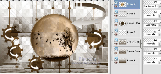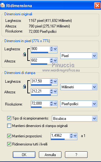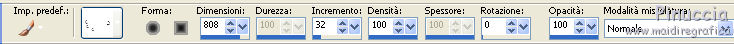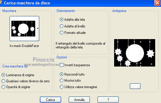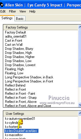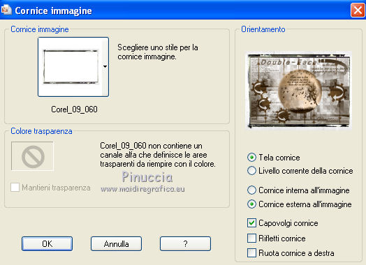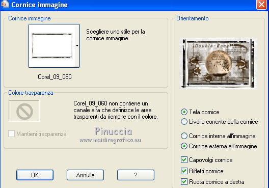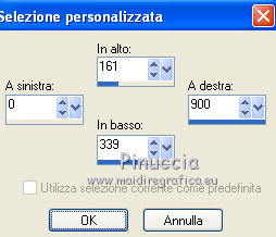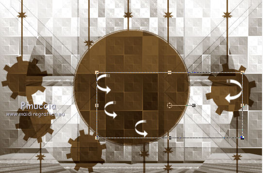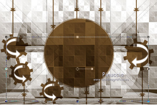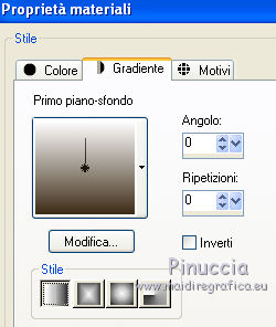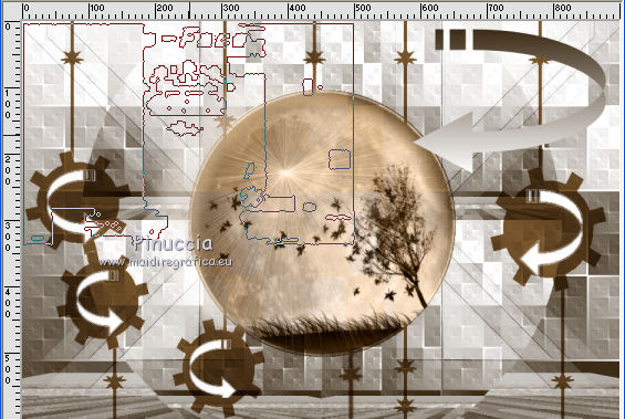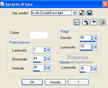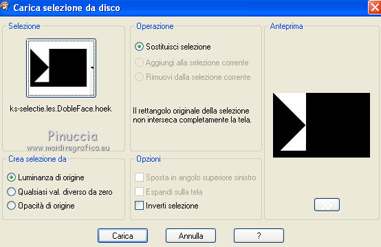 qui puoi trovare qualche risposta ai tuoi dubbi. Se l'argomento che ti interessa non è presente, ti prego di segnalarmelo. Questo tutorial è stato scritto con PSP X2 e tradotto con PSPX, ma può essere eseguito anche con le altre versioni di PSP. Dalla versione X4, il comando Immagine>Rifletti è stato sostituito con Immagine>Capovolgi in orizzontale, e il comando Immagine>Capovolgi con Immagine>Capovolgi in verticale. Nelle versioni X5 e X6, le funzioni sono state migliorate rendendo disponibile il menu Oggetti. Con la nuova versione X7, sono tornati Rifletti>Capovolgi, ma con nuove varianti. Vedi la scheda sull'argomento qui Traduzione francese qui Le vostre versioni quiOccorrente: Materiale qui I tubes della donna sono di Annelies Il tube del paesaggio è di Marion&Dieter. Filtri: in caso di necessità, consulta la sezione filtri qui Filters Unlimited 2.0 qui Toadies - What are you qui Filter Factory Gallery F - Patchwork qui Filter Factory Gallery J - Radial Quad Mirror qui Mura's Meister - Perspective Tiling qui Alien Skin Eye Candy 5 Impact qui AAA Frames - Foto Frames qui I filtri Toadies e Factory Gallery si possono usare da soli o importati in Filters Unlimited (come fare vedi qui) Se un filtro fornito appare con questa icona ![]() non esitare a cambiare modalità di miscelatura e opacità secondo i colori utilizzati. Nelle ultime versioni di PSP non c'è il gradiente di primo piano/sfondo (Corel_06_029) Puoi usare i gradienti delle versioni precedenti. Trovi qui i gradienti Corel X. ***** La forma predefinita Corel_11_009 è standard nelle versioni più recenti di PSP, e corrisponde nelle versioni precedenti alla forma Freccia 9. Se non la trovi nel tuo PSP, metti quella fornita nella cartella Forme predefinite. La cornice-immagine Corel_09_060 è standard nelle versioni più recenti di PSP e corrisponde nelle versioni precedenti alla cornice-immagine Pellicola03. Se non la trovi nel tuo PSP, metti quella fornita nella cartella Cornici-immagine. Metti il preset "Preset_Sunburst ks-les-DoubleFace-light" nella cartella Impostazioni predefinite. Apri i pennelli ks-les-DoubleFace e ks-penseel-les-Double-Face-tekst in PSP ed esportalo come pennello personalizzato. Se il suo PSP non supporta pennelli superiori a 500 pixels, prima di esportarli ridimensionali a 500 pixel di larghezza. ***** Metti i preset "ks-les-doubleface" e ks-les-DoubleFaceAlies" Cliccando sul file una o due volte (a seconda delle tue impostazioni), automaticamente il preset si installerà nella cartella corretta. perchè uno o due clic vedi qui ***** Metti le selezioni "ks-selectie.les-DoubleFace" e "ks-selectie.les.DobleFace-hoek" nella cartella Selezioni. Metti la maschera "ks-mask-DoubleFace" nella cartella Maschere. ![]() 1. Apri una nuova immagine trasparente 900 x 600 pixels. ![]() Imposta il colore di primo piano con #3d2c17, e il colore di sfondo con il colore bianco #ffffff. ![]() Passa il colore di primo piano a Gradiente di primo piano/sfondo, stile Lineare. ![]() 2. Riempi l'immagine trasparente con il gradiente.Effetti>Plugins>Filters Unlimited 2.0 - Filter Factory Gallery F - Patchwork. ![]() Effetti>Effetti di bordo>Aumenta. Livelli>Duplica. 3. Attiva lo strumento Selezione ,clicca sull'icona Selezione personalizzata ![]() e imposta i seguenti settaggi: ![]() Selezione>Innalza selezione a livello. Selezione>Deseleziona. 4. Effetti>Plugins>Mura's Meister - Perspective Tiling. ![]() Effetti>Plugins>Alien Skin Eye Candy 5 Impact - Extrude. Seleziona il preset ks-les-doubleface e ok. ![]() Effetti>Effetti di bordo>Erodi. Livelli>Unisci>Unisci giù. 5. Livelli>Duplica. Effetti>Plugins>Filters Unlimited 2.0 - Filter Factory Gallery J - Radial Quad Mirror. ![]() Effetti>Effetti di bordo>Dilata. 6. Livelli>Nuovo livello raster. Selezione>Carica/Salva selezione>Carica selezione da disco. Cerca e carica la selezione ks-selectie.les.DoubleFace.hoek. ![]() Riempi la selezione con il colore bianco #ffffff.Selezione>Deseleziona. Livelli>Duplica. Immagine>Rifletti. Livelli>Unisci>Unisci giù. 7. Effetti>Plugins>Filters Unlimited 2.0 - Toadies - What are you. ![]() Effetti>Effetti di bordo>Aumenta di più. Abbassa l'opacità di questo livello al 65%. 8. Livelli>Nuovo livello raster. Passa il colore di primo piano a Colore. Riempi con il colore #3d2c17.Livelli>Carica/Salva maschera>Carica maschera da disco. Cerca e carica la maschera ks-mask-Double-Face. ![]() Livelli>Unisci>Unisci gruppo. Cambia la modalità di miscelatura di questo livello in Luce netta. ![]() 9. Livelli>Nuovo livello raster. Attiva lo strumento Pennello ![]() cerca e seleziona il pennello ks-les-DoubleFace. ![]() Applicalo cliccando una volta con il tasto destro del mouse per usare il colore bianco di sfondo. ![]() se hai ridimensionato il pennello prima di esportarlo, dopo averlo applicato premi il tasto D (valido per tutte le versioni) per attivare lo strumento Deformazione ![]() ![]() e tira i nodi centrali della griglia per adattare il pennello come nell'esempio. ![]() 10. Chiudi il colore di primo piano. Imposta il colore di sfondo con il gradiente, selezionando Inverti. ![]() Attiva lo strumento Forme predefinite ![]() cerca e seleziona la forma Corel_11_009 o Freccia 9. ![]() Traccia la forma in alto a desta, come nell'esempio. ![]() Livelli>Converti in livello raster. Livelli>Unisci>Unisci giù. 11. Livelli>Nuovo livello raster. Selezione>Carica/Salva selezione>Carica selezione da disco. Cerca e carica la selezione ks-selectie.les.DoubleFace. ![]() Apri il tube mds4821 Moon and Tree e vai a Modifica>Copia. Torna al tuo lavoro e vai a Modifica>Incolla nella selezione. Selezione>Deseleziona. Cambia la modalità di miscelatura di questo livello in Luminanza (esistente). ![]() 12. Effetti>Effetti di illuminazione>Sprazzo di luce. Seleziona il preset Preset_Sunburst_ks-les-DoubleFace-light e ok. ![]() Effetti>Effetti 3D>Sfalsa ombra, con il colore bianco. ![]() 13. Livelli>Nuovo livello raster. Attiva lo strumento Pennello ![]() cerca e sel