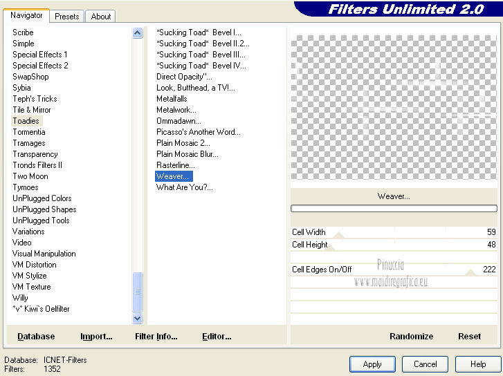 Effets>Modules Externes>Filters Unlimited 2.0 - Toadies - Weaver, par défaut.