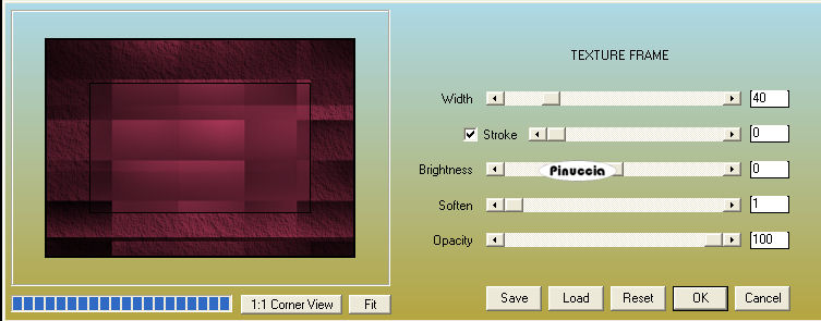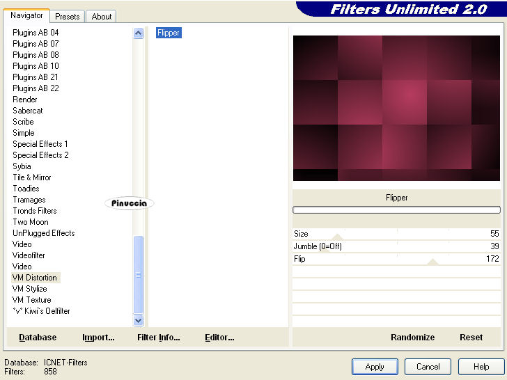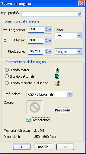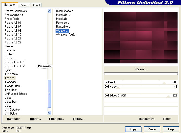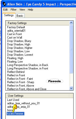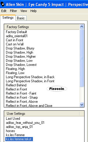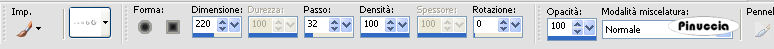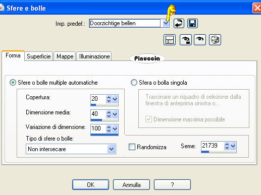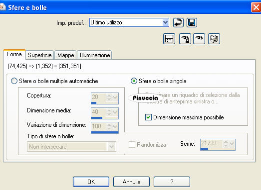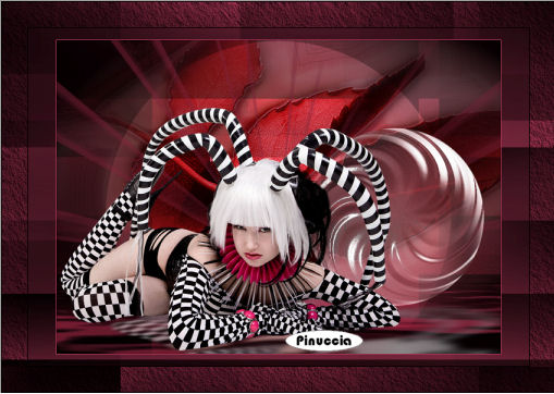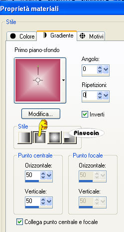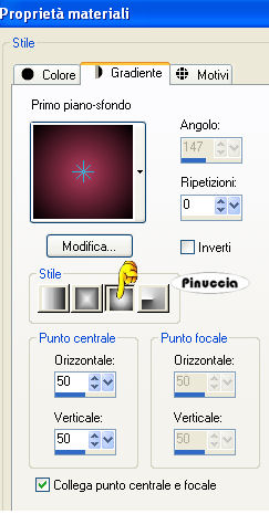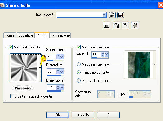 qui puoi trovare qualche risposta ai tuoi dubbi. Se l'argomento che ti interessa non è presente, ti prego di segnalarmelo. Questo tutorial è stato scritto con PSP X2, ma può essere eseguito anche con le altre versioni di PSP. Per tradurlo, ho usato PSP X. Occorrente: Materiale qui I tubes sono di Kitty. Rispetta il lavoro degli autori e mantieni i tubes al loro stato originale. Filtri: Filters Unlimited qui Toadies - Weaver qui VM Distortion - Flipper qui AAA Frames - Texture Frame qui Alien skin Eye Candy 5 Impact - Perspective Shadow qui ![]() Metti la selezione ks.les.femme nella cartella Selezioni. Metti il pennello ks.parels nella cartella Pennelli. Attenzione, il pennello è composto da due files che non devono essere separati. Vedi gli appunti sui pennelli qui Apri il pennello ks.horizon in PSP ed esportalo come pennello personalizzato. Metti ks.spiraal nella cartella Mappe di rugosità. Metti il preset BallsAndBubbles_Doorzichtige bellen nella cartella Impostazioni predefinite. Metti i preset ks.les Femme, e ks.les femme.tekst nella cartella Settings>Shadow del filtro Eye Candy 5 Impact. Oppure, puoi importarli nel filtro dalla cartella del tutorial quando ti serviranno. Vedi gli appunti su come importare un preset nella scheda del filtro qui 1. Apri una nuova immagine trasparente 850 x 600 pixels. ![]() Imposta il colore di primo piano con #b63c5e, e il colore di sfondo con il nero. 2. Passa il colore di primo piano a Gradiente: ![]() Riempi l'immagine trasparente con il gradiente.3. Effetti>Plugins>Filters Unlimited - VM Distortion - Flipper: ![]() 4. Livelli>Duplica. 5. Effetti>Plugins>Filters Unlimited 2.0 - Toadies - Weaver: ![]() Livelli>Unisci>Unisci giù. Modifica>Copia. Modifica>Incolla come nuova IMMAGINE e metti da parte questa immagine che ti servirà più tardi. Torna al lavoro originale. Effetti>Effetti di bordo>Aumenta. Apri il tube Wallpapers e vai a Modifica>Copia. Torna al tuo lavoro e vai a Modifica>Incolla come nuovo livello. Posiziona l'immagine in alto a destra.![]() Livelli>Duplica. Cambia la modalità di miscelatura di questo livello in Luce diffusa. ![]() Livelli>Unisci>Unisci giù. 8. Attiva lo strumento Penna ![]() Imposta il colore di primo piano con un colore a scelta (per il mio esempio ho usato il bianco) e chiudi il colore di sfondo. Traccia una linea a sinistra. ![]() ![]() Livelli>Converti in livello raster. 9. Effetti>Effetti geometrici>Cerchio. ![]() Abbassa l'opacità di questo livello al 30%. ![]() Attiva lo strumento Gomma e cancella la linea del cerchio.![]() 10. Attiva l'immagine che hai messo da parte al punto 5 e vai a Modifica>Copia. minimizzala nuovamente perchè ti servirà ancora Torna al tuo lavoro e vai a Modifica>Incolla come nuovo livello. Cambia la modalità di miscelatura di questo livello in Luce netta, e abbassa l'opacità al 65%. ![]() 11. Livelli>Nuovo livello raster. Imposta nuovamente il colore di primo piano con #b63c5e. Attiva lo strumento Pennello ![]() cerca e seleziona il pennello ks.horizon: ![]() Se stai usando PSP X, non potrai usare il pennello perchè ha una dimensione superiore a 500 pixels. Fai così: apri il pennello in PSP. Immagine>Ridimensiona, a 500 pixels di larghezza. File>Esporta>Pennello personalizzato, dai un nome al pennello e ok. Applica il pennello con la dimensione massima di 500 pixels. Attiva lo strumento Deformazione premendo sulla tastiera il tasto D, e allarga il pennello per tutta l'ampiezza della tela. ![]() Effetti>Effetti di bordo>Aumenta di più. 12. Livelli>Duplica. Cambia la modalità di miscelatura di questo livello in Indebolisci. ![]() Livelli>Unisci>Unisci giù. 13. Livelli>Nuovo livello raster. Attiva lo strumento Selezione , cerchio,e traccia un cerchio in basso a destra. ![]() 14. Effetti>Effetti artistici>Sfere e bolle e seleziona il preset doorzichtige bellen: ![]() teoricamente, dopo aver selezionato un preset, non si dovrebbe fare altro che ok. Qui, però, non avendo un risultato simile a quello del tutorial originale, dopo aver impostato il preset, ho selezionato "sfere e bolle singole". ![]() Sotto la linguetta Superficie ho cambiato il colore del materiale con un colore chiaro #c18a90 ![]() e sotto la linguetta Mappe - come indicato dal tutorial - ho selezionato la mappa di rugosità impostando Mulinello. La mappa è standard in PSP. Se non la trovi usa quella fornita con il materiale "Spiraal", ![]() Selezione>Deseleziona. 15. Livelli>Duplica. Cambia la modalità di miscelatura di questo livello in Luce netta. ![]() Livelli>Unisci>Unisci giù. 16. Apri il tube Femme Fatale" e vai a Modifica>Copia. Torna al tuo lavoro e vai a Modifica>Incolla come nuovo livello. Immagine>Ridimensiona, all'80%, tutti i livelli non selezionato. Sposta il tube in basso a sinistra.17. Effetti>Plugins>Alien Skin Eye Candy 5 Impact - Perspective Shadow. seleziona il preset ks.les femme e ok. ![]() 18. Immagine>Agigungi bordatura, 1 pixel, simmetriche, con il colore di primo piano #b63c5e. Modifica>Copia. 19. Attiva l'immagine che hai messo da parte al punto 5. Effetti>Plugins>AAA Frames - Texture Frame. ![]() Ripeti l'Effetto Texture Frame. Modifica>Incolla come nuovo livello e dovresti avere questo. ![]() Livelli>Unisci>Unisci tutto. 20. Livelli>Nuovo livello raster. Imposta il colore di primo piano con #f5f1f1. Attiva lo strumento Pennello ![]() cerca e seleziona il pennello ks.parels. ![]() Applica il pennello cliccando due volte in basso a destra con il tasto sinistro del mouse per usare il colore di primo piano. Livelli>Duplica. Immagine>Rifletti. Livelli>Unisci>Unisci giù. Effetti>Effetti di bordo>Aumenta. 21. Aggiungi il tuo nome e/o il tuo watermark su un nuovo livello. Livelli>Nuovo livello raster. Imposta nuovamente il colore di primo piano con #b63c5e, e riempi il livello con il colore di primo piano.22. Selezione>Seleziona tutto. Selezione>Modifica>Contrai - 2 pixels. ![]() Premi sulla tastiera il tasto CANC. Selezione>Deseleziona. 23. Livelli>Unisci>Unisci tutto. Regola>Messa 