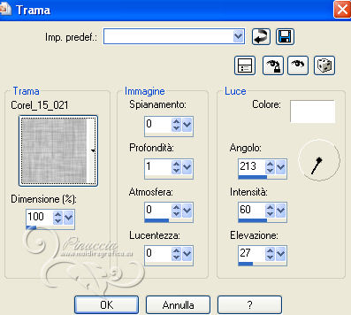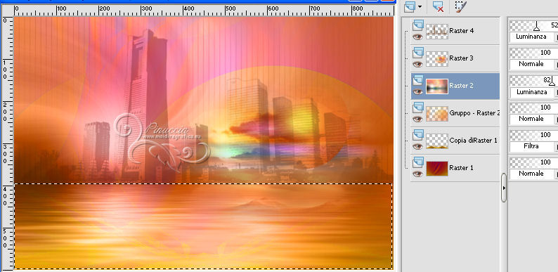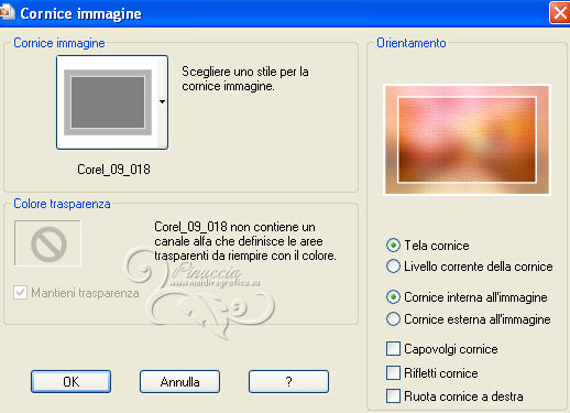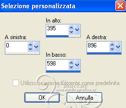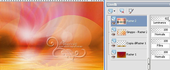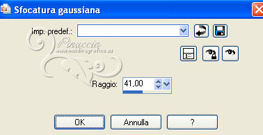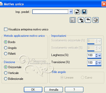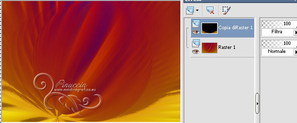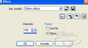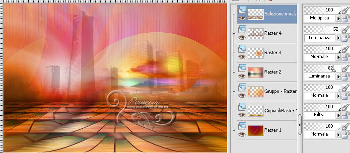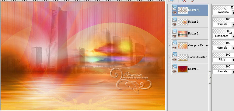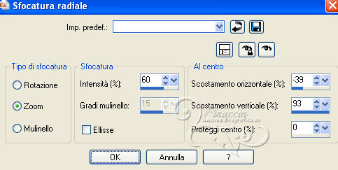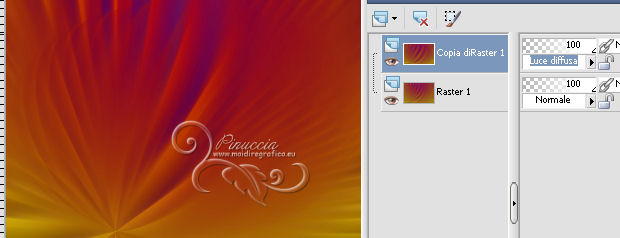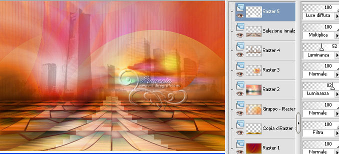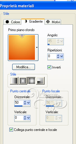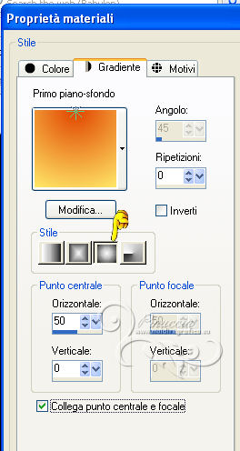 qui puoi trovare qualche risposta ai tuoi dubbi. Se l'argomento che ti interessa non è presente, ti prego di segnalarmelo. Questo tutorial è stato scritto con PSP X2 e tradotto con Corel X, ma può essere eseguito anche con le altre versioni di PSP. Dalla versione X4, il comando Immagine>Rifletti è stato sostituito con Immagine>Capovolgi in orizzontale, e il comando Immagine>Capovolgi con Immagine>Capovolgi in verticale. Nelle versioni X5 e X6, le funzioni sono state migliorate rendendo disponibile il menu Oggetti. Con la versione X7 sono tornati i comandi Immagine>Rifletti e Immagine>Capovolgi, ma con nuove funzioni. Vedi la scheda sull'argomento qui traduzione francese qui Le vostre versioni qui Tutorial originale quiOccorrente: Materiale qui La maschera è di Ann Tdstudio Il tube è di Kitty Rispetta il lavoro degli autori e mantieni i tubes al loro stato originale. Filtri: in caso di necessità, consulta la sezione filtri qui Filters Unlimited 2.0 qui VM Distortion qui AAA Frames - Foto Frame qui Plugins AB 06 - Raspberry Ripple Ice Cream qui VanDerLee - Unplugged-X qui Mura's Meister - Perspective Tiling qui Alien Skin Eye Candy 5 Impact - Perspective Shadow, Glass qui I filtri VM Distortions e Plugins AB si possono usare da soli o importati in Filters Unlimited. (come fare vedi qui). Se un filtro fornito appare con questa icona Metti i preset Cliccando sul file una o due volte (a seconda delle tue impostazioni), il preset si installerà automaticamente nella cartella corretta. perchè uno o due clic vedi qui Metti i pennelli nella cartella Pennelli. Attenzione, ogni pennello è composto da due files che non devono essere separati. Vedi gli appunti sui pennelli qui La cornice-immagine Corel_09_018 è standard nelle versioni più recenti di PSP, e corrisponde alla cornice standard delle versioni precedenti Cornice Trasparente 01. Se non la trovi nel tuo PSP, metti quella fornita nella cartella Cornici-immagine. La trama Corel-15_021 è standard nelle versioni più recenti di PSP, e corrisponde alla cornice standard delle precedenti versioni Tratteggio fine. Se non la trovi nel tuo PSP, metti quella fornita nella cartella Trame. Metti la selezione nella cartella Selezioni. Apri la maschera in PSP e minimizzala con il resto del materiale. 1. Imposta il colore di primo piano con #e14401, e il colore di sfondo con #ffe968. ![]() Passa il colore di primo piano a Gradiente, stile Sprazzo di luce, con i seguenti settaggi. ![]() 2. Apri una nuova immagine 900 x 600 pixels, ![]() e riempila con il gradiente.Effetti>Plugins>Filters Unlimited 2.0 - Plugins AB 06 - Raspberry Ripple Ice Cream ![]() Regola>Sfocatura>Sfocatura radiale. ![]() 3. Livelli>Duplica. Effetti>Effetti geometrici>Sfera. ![]() Cambia la modalità di miscelatura di questo livello in luce diffusa. ![]() Livelli>Unisci>Unisci giù. 4. Effetti>Effetti geometrici>Sfera. ![]() Effetti>Effetti di bordo>Aumenta. Livelli>Duplica. 5. Effetti>Plugins>VanDerLee - Unplugged-X. ![]() Cambia la modalità di miscelatura di questo livello in Filtra. ![]() Attiva lo strumento Bacchetta magica , sfumatura e tolleranza 0,e clicca nella parte nera per selezionarla. Non vedrai la parte nera perchè nascosta dalla modalità di miscelatura, ma la puoi visualizzare nella paletta dei livelli. ![]() Premi sulla tastiera il tasto CANC. ![]() Selezione>Deseleziona. 6. Effetti>Effetti di bordo>Aumenta. Effetti>Effetti di immagine>Motivo unico. ![]() Livelli>Duplica. Immagine>Rifletti. Livelli>Unisci>Unisci giù. 7. Livelli>Nuovo livello raster. Cambia i settaggi del gradiente, selezionando Inverti. ![]() Riempi il livello con il gradiente.Livelli>Nuovo livello maschera>Da immagine. Apri il menu sotto la finestra di origine e vedrai la lista dei files aperti. Seleziona la maschera @nn_071212_mask_219_tdstudio. ![]() Livelli>Unisci>Unisci gruppo. Effetti>Effetti di bordo>Aumenta. 8. Livelli>Nuovo livello raster. Selezione>Seleziona tutto. Apri l'immagine @nn_090313_bg_010_tdstudio, e vai a Modifica>Copia. Torna al tuo lavoro e vai a Modifica>Incolla nella selezione. Selezione>Deseleziona. Cambia la modalità di miscelatura di questo livello in Luminanza, e abbassa l'opacità all'82%. ![]() 9. Apri il tube fs-Followme-zon e vai a Modifica>Copia. Torna al tuo lavoro e vai a Modifica>Incolla come nuovo livello. Effetti>Effetti di immagine>Scostamento. ![]() 10. Imposta il colore di primo piano con #5d2c09. Livelli>Nuovo livello raster. Attiva lo strumento Pennello ,cerca e seleziona il pennello skyline_brushes_by_hawksmont_12 ![]() Applica il pennello cliccando una volta con il tasto sinistro del mouse per usare il colore di primo piano. ![]() se il tuo PSP non supporta pennelli superiori a 500 pixels, imposta la dimensione del pennello a 500 e, dopo aver applicato: Immagine>Ridimensiona, al 200%, tutti i livelli non selezionato. 11. Cambia la modalità di miscelatura di questo livello in luminanza, e abbassa l'opacità al 52%. ![]() 12. Attiva lo strumento Selezione ,clicca sull'icona Selezione personalizzata ![]() e imposta i seguenti settaggi: ![]() Attiva il livello del paesaggio @nn_090313_bg_010_tdstudio ![]() Selezione>Innalza selezione a livello. Selezione>Deseleziona. 13. Effetti>Plugins>Filters Unlimited 2.0 - VM Distortion - Broken Mirror. ![]() Effetti>Plugins>Mura's Meister - Perspective Tiling. ![]() Livelli>Disponi>Porta in alto. 14. Effetti>Plugins>Alien Skin Eye Candy 5 Impact - Perspective Shadow. Seleziona il preset ks-rand-Followme e ok. ![]() Questi i settaggi che, in caso di problemi con il preset, puoi impostare manualmente. ![]() Cambia la modalità di miscelatura di questo livello in Moltiplica. ![]() Effetti>Effetti geometrici>Cilindro orizzontale. ![]() 15. Apri il tube ks-FollowMe trap e vai a Modifica>Copia. Torna al tuo lavoro e vai a Modifica>Incolla come nuovo livello. Effetti>Effetti di immagine>Scostamento. ![]() Cambia la modalità di miscelatura di questo livello in luce diffusa. ![]() 16. Livelli>Nuovo livello raster. S