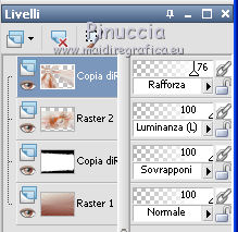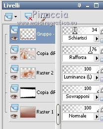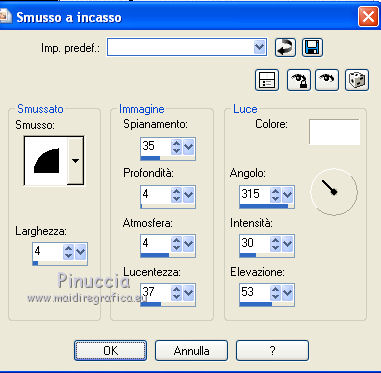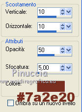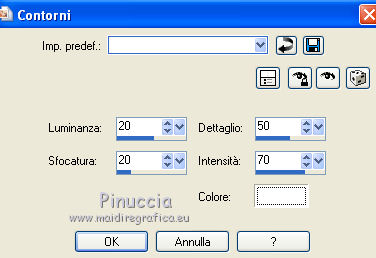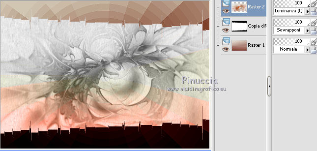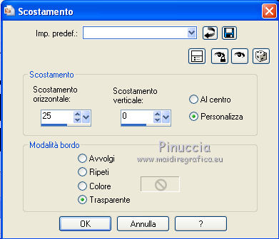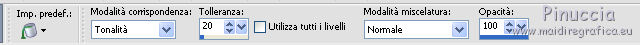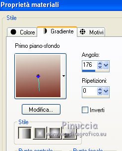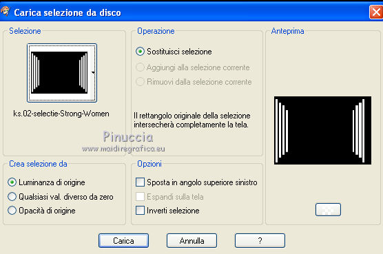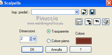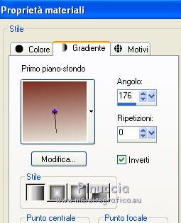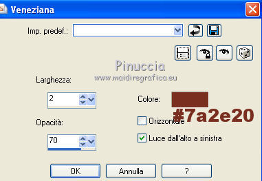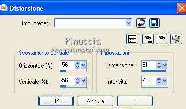 qui puoi trovare qualche risposta ai tuoi dubbi. Se l'argomento che ti interessa non è presente, ti prego di segnalarmelo. Questo tutorial è stato scritto con PSP X2 e tradotto con PSP X, ma può essere eseguito anche con le altre versioni di PSP. Dalla versione X4, il comando Immagine>Rifletti è stato sostituito con Immagine>Capovolgi in orizzontale, e il comando Immagine>Capovolgi con Immagine>Capovolgi in verticale. Nelle versioni X5 e X6, le funzioni sono state migliorate rendendo disponibile il menu Oggetti. Con la nuova versione X7, sono tornati Rifletti>Capovolgi, ma con nuove varianti. Vedi la scheda sull'argomento qui traduzione francese qui le vostre versioni quiOccorrente: Materiale qui Il tube della donna è di Kitty Il tube del vaso è di Patries Rispetta il lavoro degli autori e mantieni i tubes al loro stato originale. Filtri: in caso di necessità, consulta la sezione filtri qui Alien Skin Eye Candy 5 Impact qui Filters Unlimited 2.0 qui BKG Designer sf10II (da importare in Filters Unlimited) qui VM Experimental qui VM Extravaganza qui Mura's Meister - Perspective Tiling qui I filtri Visman (VM Experimental, VM Extravaganza) si possono usare importandoli in Filters Unlimited, ma possono funzionare anche da soli ![]() non esitare a cambiare modalità di miscelatura e opacità secondo i colori utilizzati. Nelle ultime versioni di PSP non c'è il gradiente di primo piano/sfondo (Corel_06_029) Puoi usare i gradienti delle versioni precedenti. Trovi qui i gradienti Corel X. Metti i presets Cliccando sul file una o due volte (a seconda delle tue impostazioni), automaticamente il preset si installerà nella cartella corretta. perchè uno o due clic vedi qui Metti le maschere cat014 e maskanyway_camerontags nella cartella Maschere. Metti la selezione ks.02-selectie-Strong-Women nella cartella Selezioni. Apri il resto del materiale in PSP. 1. Apri una nuova immagine trasparente 850 x 600 pixels. ![]() Imposta il colore di primo piano con #e9e5db, e il colore di sfondo con #7a2e20. Passa il colore di primo piano a Gradiente di primo piano/sfondo. ![]() 2. Riempi l'immagine trasparente con il gradiente.Effetti>Plugins>Filters Unlimited 2.0 - BKg Designer sf10II - PIX Sector Mosaic. ![]() Effetti>Effetti di bordo>Aumenta. 3. Livelli>Duplica. Effetti>Plugins>Filters Unlimited - VM Experimental - Oscilloscope... ![]() Cambia la modalità di miscelatura di questo livello in Sovrapponi. ![]() 4. Attiva lo strumento Bacchetta magica , sfumatura e tolleranza 0,e clicca al centro dell'immagine. ![]() Livelli>Nuovo livello raster. 5. Apri l'immagine "sept" e vai a Modifica>Copia. Torna al tuo lavoro e vai a Modifica>Incolla nella selezione. Selezione>Deseleziona. Cambia la modalità di miscelatura di questo livello in Luminanza (Esistente). ![]() 6. Livelli>Duplica. Effetti>Effetti di distorsione>Distorsione. ![]() Cambia la modalità di miscelatura di questo livello in Rafforza, e abbassa l'opacità al 76%. ![]() 7. Cambia i settaggi del gradiente selezionando Inverti. ![]() Livelli>Nuovo livello raster. Riempi con il gradiente.Livelli>Carica/Salva maschera>Carica maschera da disco. Cerca e carica la maschera cat014. ![]() Livelli>Unisci>Unisci gruppo. Immagine>Capovolgi. Effetti>Effetti di bordo>Aumenta. Cambia la modalità di miscelatura di questo livello in Schiarisci, e abbassa l'opacità al 34%. ![]() 8. Livelli>Nuovo livello raster. Selezione>Carica/Salva selezione>Carica selezione da disco. Cerca e carica la selezione ks.02-selectie-strong-Women. ![]() Riporta il colore di primo piano al colore #e9e5db. Imposta lo strumento Riempimento con i seguenti settaggi. ![]() 9. Riempi la selezione con il colore di primo piano. Selezione>Deseleziona. Effetti>Effetti di immagine>Scostamento. ![]() 10. Effetti>Plugins>Mura's Meister - Perspective Tiling. ![]() 11. Immagine>Capovolgi. Abbassa l'opacità di questo livello al 63%. Effetti>Effetti di distorsione>Vento - da destra, intensità 100. ![]() Livelli>unisci>Unisci visibile. 12. Livelli>Nuovo livello raster. Selezione>Carica/Salva selezione>Carica selezione da disco. Carica nuovamente la selezione ks.02-selectie-strong-Women. ![]() Riporta lo strumento Riempimento ai settaggi standard. ![]() Riempi la selezione con il gradiente (inverti selezionato).Selezione>Deseleziona. Effetti>Effetti di immagine>Scostamento, come al punto 9. ![]() 13. Effetti>Effetti di trama>Veneziana, con il colore #7a2e20. ![]() Regola>Messa a fuoco>Accentua messa a fuoco. 14. Livelli>Nuovo livello raster. Riempi con il colore di primo piano #e9e5db.Livelli>Carica/Salva maschera>Carica maschera da disco. Cerca e carica la maschera maskanyway_camerontags. ![]() Livelli>Unisci>Unisci gruppo. 15. Effetti>Effetti di trama>Veneziana, con i settaggi precedenti. Effetti>Plugins>VM Extravaganza - James Bondage. ![]() Cambia la modalità di miscelatura di questo livello in Luce diffusa. ![]() Effetti>Effetti di bordo>Aumenta. 16. Apri il tube Mariel_2006 e vai a Modifica>Copia. Torna al tuo lavoro e vai a Modifica>Incolla come nuovo livello. Effetti>Effetti di immagine>Scostamento. ![]() 17. Livelli>Duplica. Immagine>Rifletti. Effetti>Effetti di immagine>Scostamento. ![]() Livelli>Unisci>Unisci visibile. 18. Effetti>Plugins>Filters Unlimited - special Effect 2 - Border White Fade 1. ![]() Livelli>Nuovo livello raster. Riempi con il colore di sfondo #7a2e20.Livelli>Carica/Salva maschera>Carica maschera da disco. Carica nuovamente la maschera come al punto 14. Livelli>Unisci>Unisci gruppo. 19. Effetti>Effetti 3D>Scalpello, colore di sfondo. ![]() Effetti>Effetti 3D>Smusso a incasso. ![]() 20. Effetti>Effetti artistici>Contorni. ![]() Abbassa l'opacità di questo livello al 55%. 21. Apri il tube 1Patries_BL114-gemberpot e vai a Modifica>Copia. Torna al tuo lavoro e vai a Modifica>Incolla come nuovo livello. Sposta il tube in basso a destra.Effetti>Plugins>Alien Skin Eye Candy 5 Impact - Perspective Shadow. Seleziona il preset ks-rosebotel e ok. ![]() Questi i settaggi, in cas