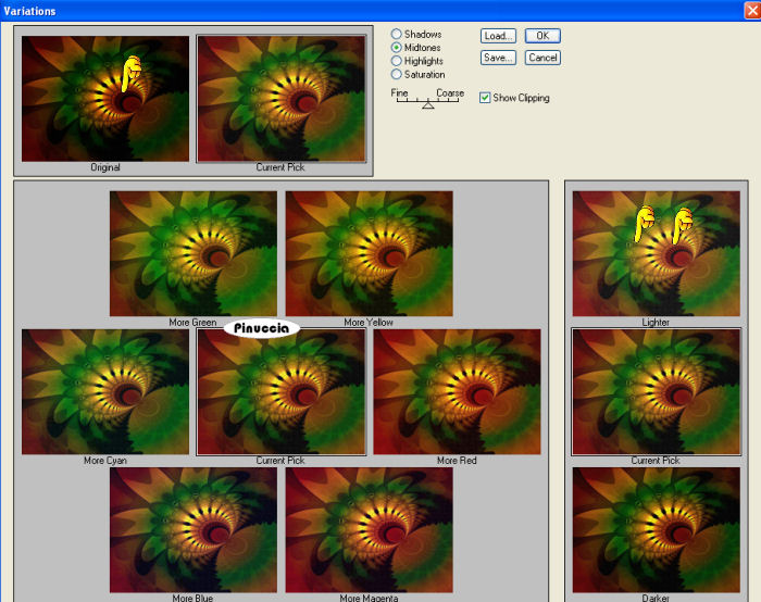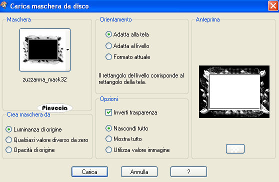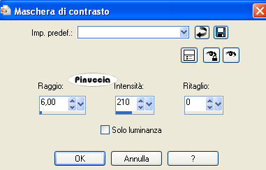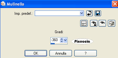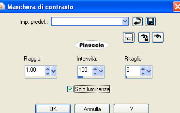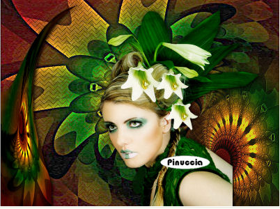 qui puoi trovare qualche risposta ai tuoi dubbi. Se l'argomento che ti interessa non è presente, ti prego di segnalarmelo. Questo tutorial è stato scritto con PSP X2, ma può essere eseguito anche con le altre versioni di PSP. Per tradurlo, ho usato PSP X. Occorrente: Materiale qui Rispetta il lavoro degli autori e mantieni i tubes al loro stato originale. Filtri: Adjust - Variations qui FM Tile Tools - Blend Emboss qui Ap-01 Silverline qui ![]() Metti la maschera nella cartella Maschere. 1. Apri una nuova immagine trasparente 800 x 600 pixel. Selezione>Seleziona tutto. Apri il file Abient-Nector e vai a Modifica>Copia. Torna al tuo lavoro e vai a Modifica>Incolla nella selezione. Selezione>Deseleziona. 2. Effetti>Plugins>AP-01 - Lines Silverling. ![]() 3. Effetti>Plugins>Adjust>Variations. clicca una volta su Original (per annullare eventuali precedenti settaggi memorizzati dal filtro), e poi 2 volte su Lighter. ![]() Regola>Messa a fuoco>Maschera di contrasto: ![]() 3. Apri il tube Abient-Nector-2 e vai a Modifica>copia. Torna al tuo lavoro e vai a Modifica>Incolla come nuovo livello. Spostalo in basso a destra.4. Apri il tube "Green Lady ks" e vai a Modifica>copia. Torna al tuo lavoro e vai a Modifica>Incolla come nuovo livello. Immagine>Ridimensiona, all'80%, tutti i livelli non selezionato. Immagine>Rifletti. Spostalo a destra.![]() Effetti>Effetti 3D>Sfalsa ombra: ![]() 5. Apri il tube Abient-Nector-3 e vai a Modifica>copia. Torna al tuo lavoro e vai a Modifica>Incolla come nuovo livello. Spostalo a sinistra.Effetti>Effetti 3D>Sfalsa ombra: ![]() 6. Effetti>Effetti di distorsione>Mulinello. ![]() Ripeti l'Effetto Mulinello ancora due volte. 7. Effetti>Plugins>Adjust - Variations, come al punto 2, ma cliccando su Lighter 4 volte. Livelli>Duplica. Ripeti l'Effetto Mulinello 3 volte. Immagine>Ruota per gradi - 90 gradi a sinistra. ![]() Spostalo sopra la spalla della donna.![]() 8. Apri il tube Grasshopper2 e vai a Modifica>copia. Torna al tuo lavoro e vai a Modifica>Incolla come nuovo livello. Immagine>Ridimensiona, 2 volte al 50%, tutti i livelli non selezionato. Spostalo a sinistra.Effetti>Plugins>FM Tile Tools - Blend Emboss, con i settaggi standard. ![]() Livelli>Unisci>Unisci tutto. Modifica>Copia, e metti da parte l'immagine. 9. Apri una nuova immagine trasparente 800 x 600 pixels. Imposta il colore di primo piano con #1f120a, e riempi l'immagine trasparente con questo colore.Livelli>Nuovo livello raster. Imposta il colore di primo piano con #e4cf2e, e riempi il livello con questo colore.Livelli>Carica/Salva maschera>Carica maschera da disco. Cerca e carica la maschera Zuzunna-mask 32: ![]() Livelli>Unisci>Unisci gruppo. 10. Attiva lo strumento Bacchetta magica ![]() ![]() e clicca al centro della maschera per selezionarla. Attiva l'immagine che hai messo da parte prima e vai a Modifica>Copia. Torna al tuo lavoro e vai a Modifica>Incolla nella selezione. Selezione>Deseleziona. 11. Apri il tube Grasshopper1 e vai a Modifica>copia. Torna al tuo lavoro e vai a Modifica>Incolla come nuovo livello. Immagine>Ridimensiona, 2 volte al 50%, tutti i livelli non selezionato. Immagine>Rifletti. Spostalo nell'angolo in basso a destra.Effetti>Plugins>FM Tile Tools - Blend Emboss, con i settaggi standard. 12. Aggiungi il tuo nome e/o il tuo watermark su un nuovo livello. Livelli>Unisci>Unisci tutto. Regola>Messa a fuoco>Maschera di contrasto: ![]() Salva in formato jpg.