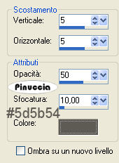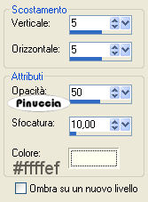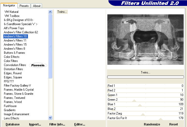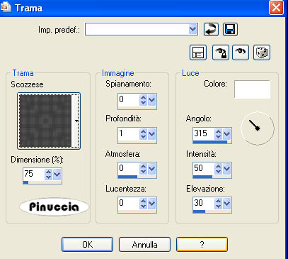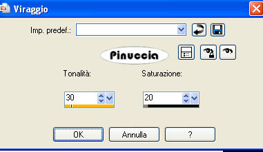 qui puoi trovare qualche risposta ai tuoi dubbi. Se l'argomento che ti interessa non è presente, ti prego di segnalarmelo. Questo tutorial è stato scritto con PSP X2, ma può essere eseguito anche con le altre versioni di PSP. Per tradurlo, ho usato PSP X. Per favore, rispetta il lavoro degli autori e mantieni i tubes inalterati. Occorrente: Materiale qui Filtri: FM Tile Tools qui Filters Unlimited qui Andrews Filters 10 qui I filtri Andrews per essere usati devono prima essere convertiti. Come fare vedi qui Si usano importati in Filters Unlimited ma funzionano anche da soli Metti la maschera nella cartella Maschere. Metti la trama nella cartella Trame. Metti il pennello nella cartella Pennelli. 1. Apri una nuova immagine trasparente 600 x 400 pixels, e riempila con il colore #ffffef.Effetti>Effetti di trama>Trama - seleziona la trama Scozzese: questa trama è standard in PSP. Se non la trovi, usa la trama Plaid15, fornita con il tutorial ![]() Effetti>Effetti di bordo>Aumenta. 2. Livelli>Nuovo livello raster. Selezione>Seleziona tutto. Apri l'immagine Mephyso e vai a Modifica>Copia. Torna al tuo lavoro e vai a Modifica>Incolla nella selezione. Selezione>Deseleziona. 3. Effetti>Plugins>Filters Unlimited - Andrew's 10 - Twins: ![]() Cambia la modalità di miscelatura di questo livello in Moltiplica. Effetti>Effetti di bordo>Aumenta. Regola>Tonalità e saturazione>Viraggio: ![]() 4. Apri il tube Band e vai a Modifica>Copia. Torna al tuo lavoro e vai a Modifica>Incolla come nuovo livello. Posizionalo sul cappello.![]() Effetti>Plugins>FM Tile Tools - Blend Emboss, con i settaggi standard. ![]() Livelli>Unisci>Unisci giù. 5. Apri il tube Riem e vai a Modifica>Copia. Torna al tuo lavoro e vai a Modifica>Incolla come nuovo livello. Posiziona il tube sul collo del cane.![]() Effetti>Plugins>FM Tools - Blend Emboss, con i settaggi standard. Livelli>Unisci>Unisci giù. 6. Livelli>Nuovo livello raster. Imposta il colore di primo piano con #ffffef. Attiva lo strumento Pennello ![]() cerca e seleziona il pennello Falln-Bruch: ![]() e applicalo sul cappello con il colore di primo piano. 7. Livelli>Nuovo livello raster. Cambia la rotazione del pennello a 132. Applica nuovamente il pennello. Livelli>Nuovo livello raster. Cambia la rotazione del pennello a 174. Applica nuovamente il pennello. Sistema le piume sul cappello,vedrai le tue piume diverse dal mio esempio: questo perchè le ho un po' "sfumate" con il pennello distorsione ![]() ![]() Assicurati di essere sul livello superiore e vai a Livelli>Unisci>Unisci giù, e ripeti 2 volte, per avere così le tre piume su un solo livello. Effetti>Effetti di bordo>Aumenta. 8. Apri il tube Snowflake e vai a Modifica>copia. Torna al tuo lavoro e vai a Modifica>Incolla come nuovo livello. Posiziona il tube sulle piume.Effetti>Plugins>FM Tile Tools - Blend Emboss, con i settaggi standard. Livelli>Unisci>Unisci giù. 9. Apri il tube Sweet e vai a Modifica>Copia. Torna al tuo lavoro e vai a Modifica>Incolla come nuovo livello. Spostalo in basso al centro.Effetti>Effetti 3D>Sfalsa ombra: ![]() Livelli>Unisci>Unisci tutto. Metti da parte questa immagine, per il momento. 10. Apri una nuova immagine trasparente 800 x 600 pixels, e riempila con il colore #ffffef.Effetti>Effetti di trama>Trama - con i settaggi precedenti. ![]() Livelli>Nuovo livello raster. Riempi con il colore #5d5b54.Livelli>Carica/Salva maschera>Carica maschera da disco. Cerca e carica la maschera schijf-Boxed-Didda: ![]() Livelli>Unisci>Unisci gruppo. Immagine>Capovolgi. 11. Attiva lo strumento Selezione , rettangolo,e traccia una selezione al centro della maschera. ![]() Attiva l'immagine che hai messo da parte prima e vai a Modifica>copia. Torna all'immagine di sfondo (800x600) e vai a Modifica>Incolla nella selezione. Selezione>Deseleziona. 12. Apri il tube Parie e vai a Modifica>Copia. Torna al tuo alvoro e vai a Modifica>Incolla come nuovo livello. Immagine>Ridimensiona, all'80%, tutti i livelli non selezionato. Sposta il tube a destra.Effetti>Effetti 3D>Sfalsa ombra, come al punto 9. 13. Apri il tube di testo Grey e vai a Modifica>Copia. Torna al tuo lavoro e vai a Modifica>Incolla come nuovo livello. Spostalo in alto a sinistra.Effetti>Effetti 3D>Sfalsa ombra: ![]() 14. Apri il tube di testo Hound e vai a Modifica>Copia. Torna al tuo lavoro e vai a Modifica>Incolla come nuovo livello. Effetti>Effetti 3D>Sfalsa ombra, come al punto 13, ma con il colore #ffffef. ![]() 15. Aggiungi il tuo nome e/o il tuo watermark su un nuovo livello. Livelli>Unisci>Unisci tutto. Regola>Messa a fuoco>Metti a fuoco. Salva in formato jpg. ![]() Se hai problemi o dubbi, o trovi un link non funzionante, o anche soltanto per un saluto, scrivimi 6 Ottobre 2008 |