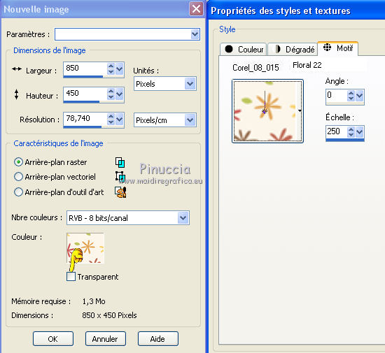 1. Ouvrir une nouvelle image 850 x 450 pixels, arrière plan motif Corel_08_015 ou Floral 22.