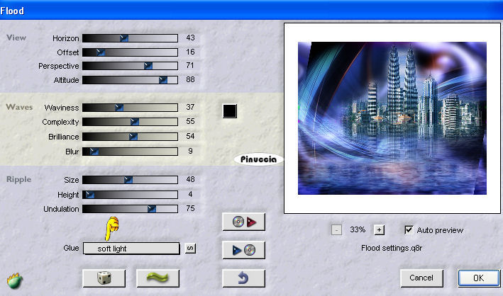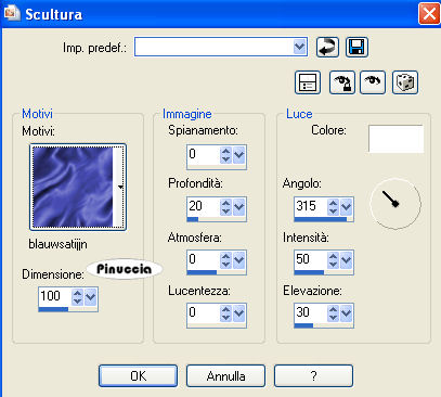 9. Effetti>Effetti di trama>Scultura - seleziona la trama Blauw satijn con i seguenti settaggi:
