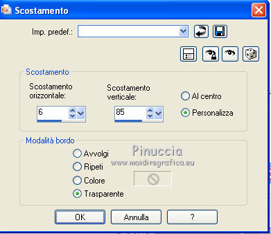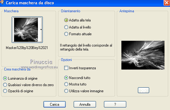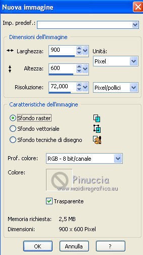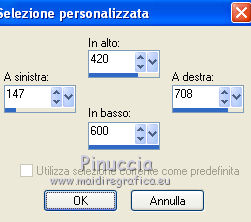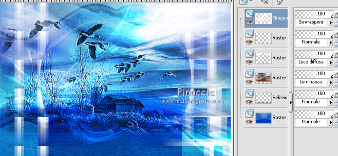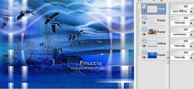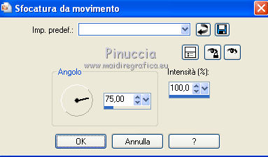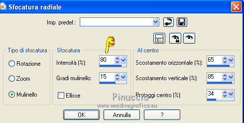 qui puoi trovare qualche risposta ai tuoi dubbi. Se l'argomento che ti interessa non è presente, ti prego di segnalarmelo. Questo tutorial è stato scritto con PSP X2 e tradotto con PSP X, ma può essere eseguito anche con le altre versioni di PSP. Dalla versione X4, il comando Immagine>Rifletti è stato sostituito con Immagine>Capovolgi in orizzontale, e il comando Immagine>Capovolgi con Immagine>Capovolgi in verticale. Nelle versioni X5 e X6, le funzioni sono state migliorate rendendo disponibile il menu Oggetti. Con la nuova versione X7, sono tornati Rifletti>Capovolgi, ma con nuove varianti. Vedi la scheda sull'argomento qui traduzione francese qui le vostre versioni quiOccorrente: Materiale qui Il tube della donna è di Kitty Rispetta il lavoro degli autori e mantieni i tubes al loro stato originale. Filtri: in caso di necessità, consulta la sezione filtri qui Alien Skin Eye Candy 5 Impact qui Two Moon - Vertical ChopBlur qui Filters Unlimited 2.0 qui &&kt;BKG Designersf10I> - AF62 Effected Emboss (da importare in Unlimited) qui FM Tile Tools - Blend Emboss qui Flaming Pear - Flood qui Photo Tools - Gradient Sky qui Toadies - What are you, Weaver qui I filtri Toadies, Two Moon e Photo Tools si possono usare da soli o importati in Filters Unlimited (come fare vedi qui) Se un filtro fornito appare con questa icona ![]() Metti il preset Cliccando sul file una o due volte (a seconda delle tue impostazioni), automaticamente il preset si installerà nella cartella corretta. perchè uno o due clic vedi qui Metti il preset ks-maseltov-Flood settings.q8r in una cartella a scelta. Metti i pennelli nella cartella Pennelli. Attenzione, ogni pennello è composto da due files che non devono essere separati. Vedi gli appunti sui pennelli qui Metti la selezione ks-selectie-maseltov nella cartella Selezioni. Metti la maschera Masker%20by%20Birry%2021 nella cartella maschere. 1. Apri una nuova immagine trasparente 900 x 600 pixels. ![]() Selezione>Seleziona tutto. Apri l'immagine ks-klaproosbleu e vai a Modifica>Copia. Torna al tuo lavoro e vai a Modifica>Incolla nella selezione. Selezione>Deseleziona. 2. Regola>Sfocatura>Sfocatura radiale. ![]() Livelli>Duplica. Immagine>Rifletti. Cambia la modalità di miscelatura di questo livello in Moltiplica. ![]() Livelli>Unisci>Unisci giù. 3. Livelli>Duplica. Regola>Sfocatura>Sfocatura radiale. Cambia Intensità con 80 e ok. ![]() 4. Effetti>Plugins>Filters Unlimited 2.0 - Tile & Mirror - Seamless Blend (horizontal). ![]() Regola>Messa a fuoco>Accentua messa a fuoco. Livelli>Unisci>Unisci giù. 5. Effetti>Plugins>Filters Unlimited 2.0 - Two Moon - VerticalChopBlur.. ![]() Effetti>Effetti di bordo>Aumenta di più. 6. Apri il tube ks-birds e vai a Modifica>Copia. Torna al tuo lavoro e vai a Modifica>Incolla come nuovo livello. Effetti>Effetti di immagine>Scostamento. ![]() Cambia la modalità di miscelatura di questo livello in Luminanza. ![]() 7. Effetti>Plugins>FM Tile Tools - Blend Emboss. ![]() 8. Livelli>Nuovo livello raster. Selezione>Carica/Salva selezione>Carica selezione da disco. Cerca e carica la selezione ks-maseltov. ![]() Imposta il colore di primo piano con il colore bianco #ffffff. Riempi la selezione con il colore bianco di primo piano.9. Effetti>Plugins>Toadies - What are you. ![]() Selezione>Deseleziona. 10. Livelli>Duplica. Immagine>Rifletti. Effetti>Effetti di riflesso>Specchio rotante. ![]() Livelli>Unisci>Unisci giù. 11. Effetti>Plugins>Filters Unlimited 2.0 - Toadies - Weaver. ![]() Effetti>Effetti geometrici>Sfera. ![]() 12. Attiva il livello inferiore. Attiva lo strumento Selezione ,clicca sull'Icona Selezione personalizzata ![]() e imposta i seguenti settaggi. ![]() Selezione>Innalza selezione a livello. Selezione>Deseleziona. 13. Effetti>Plugins>Flaming Pear - Flood. Clicca sull'icona con la freccia rossa (in alcune versioni del filtro la serie di icone si trova a destra e la freccia non è rossa), cerca il preset ks-maseltof-Flood settings.q8r e ok. ![]() Regola>Messa a fuoco>Metti a fuoco. Attiva nuovamente il livello superiore. 14. Livelli>Nuovo livello raster. Selezione>Carica/Salva selezione>Carica selezione da disco. Carica nuovamente la selezione ks-maseltov. ![]() Riempi la selezione con il colore bianco #ffffff.15. Effetti>Plugins>Filters Unlimited 2.0 - Toadies - What are you, come al punto 9. ![]() Selezione>Deseleziona. Immagine>Ruota per gradi - 90 gradi a sinistra. ![]() 16. Effetti>Effetti geometrici>Prospettiva orizzontale. ![]() Regola>Messa a fuoco>Metti a fuoco. 17. Effetti>Effetti di distorsione>Onda. ![]() Effetti>Effetti di immagine>Scostamento. ![]() 18. Livelli>Duplica. Immagine>Rifletti. Sposta le due immagini verso il centro per unirle.Livelli>Unisci>Unisci giù. Attiva lo strumento Selezione a mano libera , da punto a punto,e seleziona la parte indicata nell'esempio. ![]() Premi sulla tastiera il tasto CANC Selezione>Deseleziona. Cambia la modalità di miscelatura di questo livello in Luce diffusa. ![]() 19. Effetti>Plugins>Filters Unlimited 2.0 - Bkg Designersf10I - 4Way Average. ![]() Effetti>Effetti di bordo>Aumenta di più. 20. Attiva lo strumento Bacchetta magica ![]() e clicca nelle sezioni in alto e in basso per selezionarle. ![]() Riempi le selezioni con il colore bianco #ffffff.Selezione>Deseleziona. Livelli>Disponi>Sposta giù. 21. Selezione personalizzata ![]() ![]() Premi sulla tastiera il tasto CANC. Selezione>Deseleziona. Attiva nuovamente il livello superiore. 22. Livelli>Nuovo livello raster. Riempi con il colore bianco #ffffff.Livelli>Carica/Salva maschera>Carica maschera da disco. Cerca e carica la maschera Masker%20by%20Birry%2021. ![]() Livelli>Unisci>Unisci gruppo. Cambia la modalità di miscelatura di questo livello in Sovrapponi. ![]() Immagine>Rifletti. 23. Livelli>Nuovo livello raster. Imposta il colore di primo piano con #13181d. Attiva lo strumento Pennello ![]() cerca e seleziona il pennello treextension, cambia la dimensione a 300 pixels ![]() e applicalo a sinistra cliccand