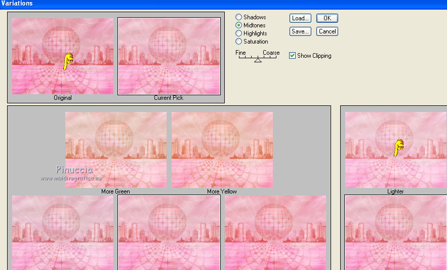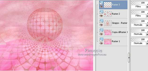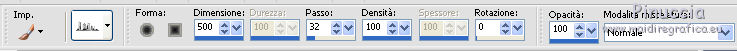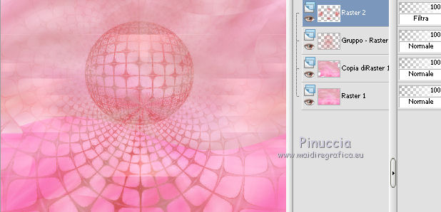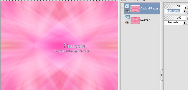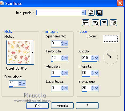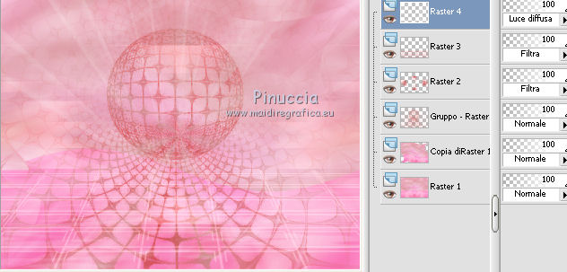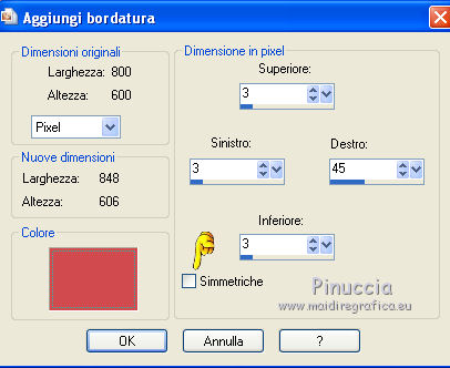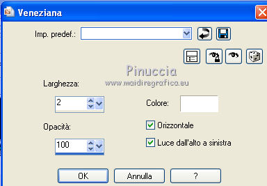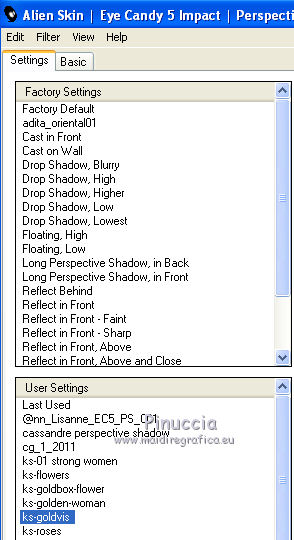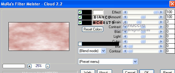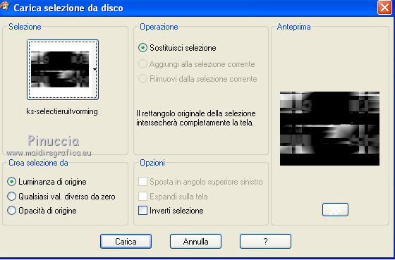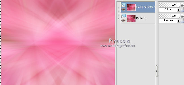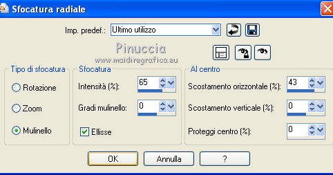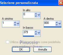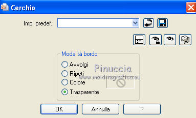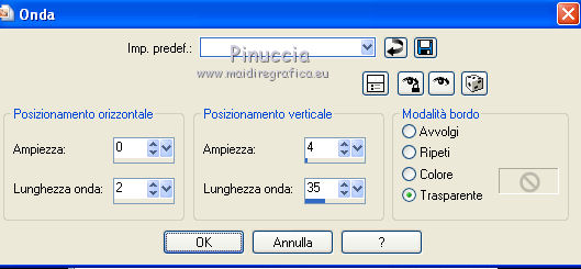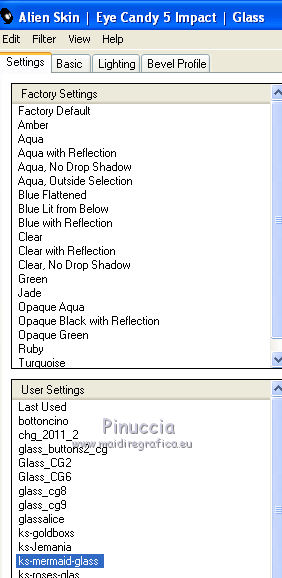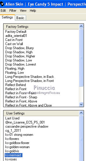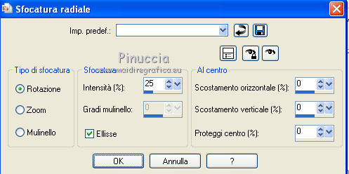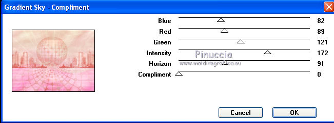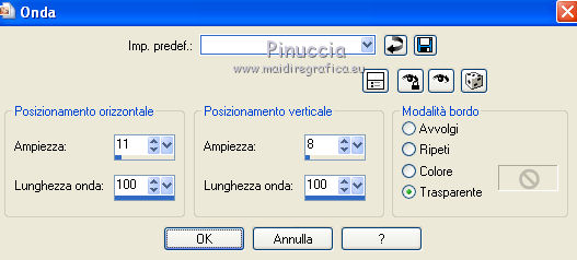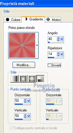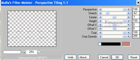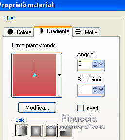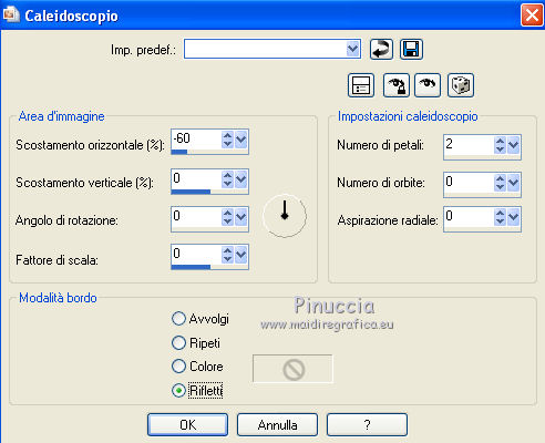 qui puoi trovare qualche risposta ai tuoi dubbi. Se l'argomento che ti interessa non è presente, ti prego di segnalarmelo. Questo tutorial è stato scritto con PSP X2, ma può essere eseguito anche con le altre versioni di PSP. Per tradurlo, ho usato PSP X. Occorrente: Materiale qui I tubes usati sono di Kitty. Rispetta il lavoro degli autori e mantieni i tubes al loro stato originale. Filtri: in caso di necessità, consulta la sezione filtri qui Alien Skin Eye Candy 5 Impact qui Adjust - Variations qui Photo Tools qui Mura's Meister - Cloud qui Mura's Meister - Perspective Tiling qui Metti il motivo Corel_08_015 nella cartella Motivi. Metti le selezioni selectieks-jemania1, ks-selectieruitvormin e ks-selectie-mermaid nella cartella Selezioni. Metti la maschera ks-lightball nella cartella Maschere. Apri il pennello skyline_brushes_by_hawksmont_13 in PSP ed esportalo come Pennello personalizzato. Metti i preset ks-goldvis.f1s, ks-mermaid.f1s e ks-mermaid-glass.f1s nelle cartelle del filtro Alien Skin Eye Candy Impact 5>Settings>Shadow (i primi due) e ...Setting>Glass il terzo preset. Se preferisci puoi importarli direttamente dalla cartella in cui hai scompattato il materiale. Vedi la scheda del filtro qui e come importare un preset in Eye Candy qui Apri il resto del materiale in PSP. 1. Apri una nuova immagine trasparente 800 x 600 pixels. ![]() Selezione>Seleziona tutto. Apri l'immagine "rozes" e vai a Modifica>Copia. Torna al tuo lavoro e vai a Modifica>Incolla nella selezione. Selezione>Deseleziona. 2. Regola>Sfocatura>Sfocatura radiale. ![]() Livelli>Duplica. Immagine>Rifletti. Cambia la modalità di miscelatura di questo livello in Filtra. ![]() Livelli>Unisci>Unisci giù. 3. Livelli>Duplica. Immagine>Capovolgi. Cambia la modalità di miscelatura di questo livello in Luce netta. ![]() Livelli>Unisci>Unisci giù. Livelli>Duplica. 4. Attiva lo strumento Selezione ,clicca sull'icona Selezione personalizzata ![]() e imposta i seguenti settaggi: ![]() Premi sulla tastiera il tasto CANC. Effetti>Plugins>Mura's Meister - Cloud. colore di primo piano bianco; colore di sfondo #c48179: ![]() 5. Regola>Sfocatura>Sfocatura gaussiana - raggio 5. ![]() Abbassa l'opacità di questo livello al 60%. ![]() Selezione>Deseleziona. Livelli>Unisci>Unisci giù. Livelli>Duplica. Effetti>Effetti di distorsione>Onda. ![]() 6. Imposta il colore di primo piano con #d14a4e, e il colore di sfondo con #c48179. Passa il colore di primo piano a Gradiente radiale. ![]() 7. Livelli>Nuovo livello raster. Riempi con il gradiente.Livelli>Carica/Salva maschera>Carica maschera da disco. Cerca e carica la maschera ks-lightball. ![]() Livelli>Unisci>Unisci gruppo. Regola>Messa a fuoco>Metti a fuoco. 8. Livelli>Nuovo livello raster. Selezione>Carica/salva selezione>Carica selezione da disco. Cerca e carica la selezione ks-selectieruitvorming. ![]() Riempi la selezione con il colore di primo piano #d14a4e.Selezione>Deseleziona. 9. Effetti>Effetti di riflesso>Caleidoscopio. ![]() Livelli>Duplica. Livelli>Unisci>Unisci giù. Cambia la modalità di miscelatura di questo livello in Filtra. ![]() 10. Livelli>Nuovo livello raster. Selezione>Carica/salva selezione>Carica selezione da disco. Cerca e carica la selezione selectieks-jemania1. ![]() Riempi la selezione con il colore di primo piano #d14a4e.Selezione>Deseleziona. 11. Effetti>Plugins>Mura's Meister - Perspective Tiling. ![]() Selezione personalizzata ; come al punto 4.![]() Premi sulla tastiera il tasto CANC. Selezione>Deseleziona. Livelli>Duplica. Immagine>Rifletti. Livelli>Unisci>Unisci giù. Cambia la modalità di miscelatura di questo livello in Filtra. ![]() 12. Apri il template ks-horizon e vai a Modifica>Copia. Torna al tuo lavoro e vai a Modifica>Incolla come nuovo livello. Cambia la modalità di miscelatura di questo livello in Luce diffusa. ![]() 13. Livelli>Nuovo livello raster. Imposta nuovamente il colore di primo piano con il colore #d14a4e. Attiva lo strumento Pennello ![]() cerca e seleziona il pennello skyline_brushes_by_hawksmont_13 ![]() e applica a sinistra cliccando uan volta con il tasto sinistro del mouse per usare il colore di primo piano. ![]() Livelli>Duplica. Immagine>Rifletti. 14. Livelli>Unisci>Unisci visibile. Effetti>Plugins>Adjust - Variations: 1 clic su Original per annullare eventuali precedenti settaggi memorizzati dal filtro, 1 clic su Lighter e ok. ![]() 15. Effetti>Plugins>Photo Tools - Gradient Sky - Compliment. ![]() 16. Apri il tube goldvis e vai a Modifica>Copia. Torna al tuo lavoro e vai a Modifica>Incolla come nuovo livello. Sposta il tube come nell'esempio.![]() Cambia la modalità di miscelatura di questo livello in Sovrapponi. ![]() 17. Effetti>Plugins>Alien Skin Eye Candy 5 Impact - Perspective Shadow. Seleziona il preset ks-goldvis e ok. ![]() 18. Livelli>Nuovo livello raster. Selezione>Carica/salva selezione>Carica selezione da disco. Cerca e carica la selezione ks-selectie-mermaid01. ![]() Passa il colore di primo piano a Gradiente lineare, con gli stessi colori del punto 6. ![]() Riempi la selezione con il gradiente.Effetti>Effetti di trama>Veneziana. ![]() Selezione>Deseleziona. 19. Livelli>Duplica. Immagine>Rifletti. Livelli>Unisci>Unisci giù. Cambia la modalità di miscelatura di questo livello in Luce diffusa. ![]() 20. Effetti>Effetti di distorsione>Onda. ![]() Effetti>Effetti 3D>Sfalsa ombra, con il colore #55090a. ![]() 21. Apri il tube JHanna_190_tube_120809 e vai a Modifica>Copia. Torna al tuo lavoro e vai a Modifica>Incolla come nuovo livello. Sposta il tube a sinistra, come nel mio esempio.![]() Effetti>Effetti 3D>Sfalsa ombra, con i settaggi precedenti. Livelli>Duplica. Immagine>Ridimensiona, al 50%, tutti i livelli non selezionato. Lascia questo tube come sta. E' già correttamente posizionato. Livelli>Unisci>Unisci visibile. 24. Immagine>Aggiungi bordatura, simmetriche non selezionato. ![]() Seleziona il bordo rosso con la bacchetta magica .Selezione>Innalza selezione a livello. Effetti>Effetti di trama>Scu