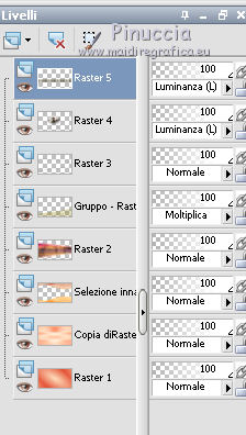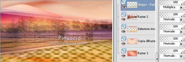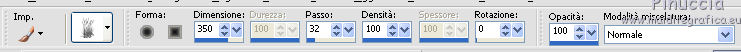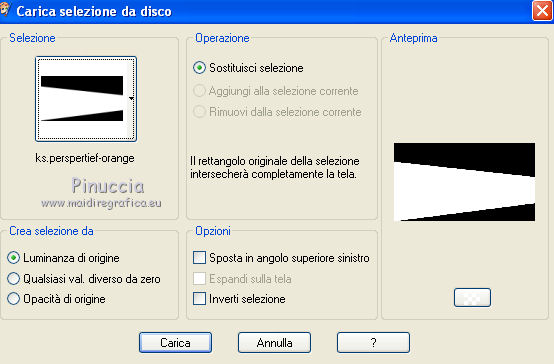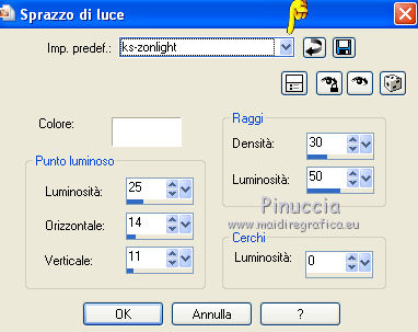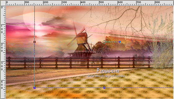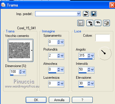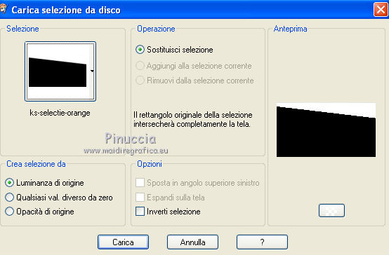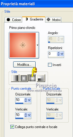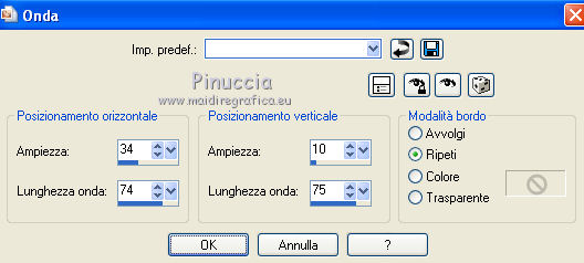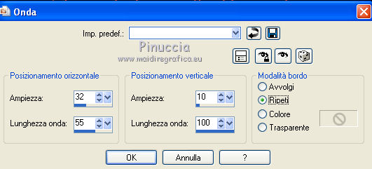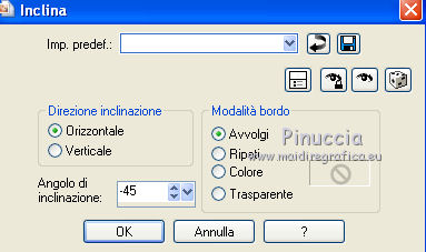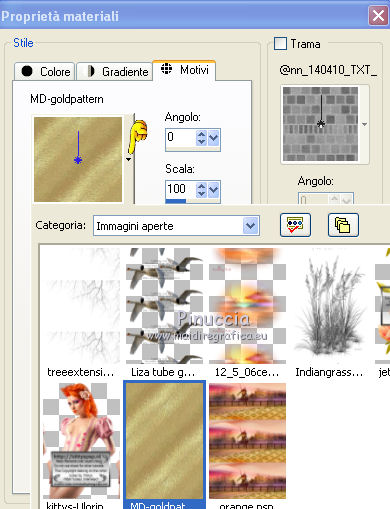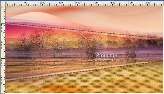 qui puoi trovare qualche risposta ai tuoi dubbi. Se l'argomento che ti interessa non è presente, ti prego di segnalarmelo. Questo tutorial è stato scritto con PSP X2 e tradotto con PSPX, ma può essere eseguito anche con le altre versioni di PSP. Dalla versione X4, il comando Immagine>Rifletti è stato sostituito con Immagine>Capovolgi in orizzontale, e il comando Immagine>Capovolgi con Immagine>Capovolgi in verticale. Nelle versioni X5 e X6, le funzioni sono state migliorate rendendo disponibile il menu Oggetti. Con la nuova versione X7, sono tornati Rifletti>Capovolgi, ma con nuove varianti. Vedi la scheda sull'argomento qui Traduzione francese qui Le vostre versioni quiOccorrente: Materiale qui Il tube della donna è di Kitty Rispetta il lavoro degli autori e mantieni i tubes al loro stato originale. Filtri: in caso di necessità, consulta la sezione filtri qui Filters Unlimited 2.0 qui Andrew's Filters 11 - Coloured Stepping Stones qui Toadies - What are you qui Alien Skin Eye Candy 5 Impact - Perspective Shadow, Glass qui AAA Frames/AAA Filters qui Nik Software - Color Efex pro qui Xero - Porcelain qui I filtri Andrew's e Toadies si possono usare da soli o importati in Filters Unlimited (come fare vedi qui) Se un filtro fornito appare con questa icona ![]() non esitare a cambiare modalità di miscelatura e opacità secondo i colori utilizzati. Nelle ultime versioni di PSP non c'è il gradiente di primo piano/sfondo (Corel_06_029) Puoi usare i gradienti delle versioni precedenti. Trovi qui i gradienti Corel X. Metti i preset ks-orange (Glass) e kskittys-Ulorin Vex Model, ks-orange-birds e ks-orange-flower nelle cartelle del filtro: Alien Skin Eye Candy 5 Impact>Settings>Shadow e Glass (con un doppio clic sul file e il preset sarà automaticamente installato). Se preferisci, anche in questo caso puoi importarlo direttamente dalla cartella in cui hai scompattato il materiale, quando sarà il momento di usarlo. Vedi la scheda del filtro qui e come importare un preset in Eye Candy qui La trama Corel_15_041 è standard nelle versioni più recenti di PSP, e nelle versioni precedenti corrisponde alla trama Vecchio cemento. Se non la trovi nel tuo PSP, metti quella fornita nella cartella Trame. sulle nuove denominazioni degli strumenti di PSP vedi qui Metti le selezioni ks-selectie-orange e ks-perspectief-orange nella cartella Selezioni. Metti la maschera ks-maskerOrange nella cartella Maschere. Metti i pennelli ks-orange-lijntjes e ks-orange-hekwerk nella cartella Pennelli. Attenzione, entrambi i pennelli sono composti da due files che non devono essere separati. Vedi gli appunti sui pennelli qui Metti il preset "Preset_Sunburst ks-zonlight" nella cartella Impostazioni predefinite. Metti il motivo MD-goldpattern nella cartella Motivi. Se non vuoi appesantire la cartella, aprilo in PSP e minimizzalo e lo troverai nella lista dei motivi disponibili, quando ti servirà. Questi i colori usati nel corso del tutorial. ![]() 1. Apri una nuova immagine trasparente 900 x 500 pixels. ![]() Imposta il colore di primo piano con #fdddbc, e il colore di sfondo con #e44b2f. Passa il colore di primo piano a Gradiente, stile Sprazzo di luce, con i seguenti settaggi. ![]() Riempi l'immagine trasparente con il gradiente.2. Effetti>Effetti geometrici>Inclina. ![]() Livelli>Duplica. Effetti>Effetti di distorsione>Onda. ![]() 3. Effetti>Plugins>Filters Unlimited 2.0 - Andrew's Filter 11 - Coloured Stepping Stones... ![]() Livelli>Duplica. Immagine>Rifletti. Cambia la modalità di miscelatura di questo livello in Filtra. ![]() Livelli>Unisci>Unisci giù. 4. Selezione>Carica/Salva selezione>Carica selezione da disco. Cerca e carica la selezione ks-selectie-orange. ![]() Selezione>Innalza selezione a livello. Selezione>Deseleziona. Effetti>Effetti di distorsione>Onda. ![]() 5. Livelli>Duplica. Immagine>Capovolgi. Livelli>Unisci>Unisci giù. Effetti>Plugins>Nik Software - Color efex Pro 3.0 - Bi-color Filters. A destra Color-Set Cool/warm 4. ![]() 6. Livelli>Nuovo livello raster. Selezione>Carica/Salva selezione>Carica selezione da disco. Cerca e carica la selezione ks.perspertief-orange. ![]() Apri l'immagine golden_pathway_by_t7_productions-d4gpe1b e vai a Modifica>Copia. Torna al tuo lavoro e vai a Modifica>Incolla nella selezione. Selezione>Deseleziona. 7. Effetti>Plugins>Filters Unlimited 2.0 - Toadies - What are you. ![]() Effetti>Effetti di bordo>Aumenta. 8. Effetti>Effetti di immagine>Scostamento. ![]() Di nuovo Effetti>Plugins>Nik Software - Color efex Pro 3.0 - Bi-Color Filters. Color-Set Violet/pink 1. ![]() 9. Imposta il colore di primo piano con #958001. Livelli>Nuovo livello raster. Riempi il livello con il colore di primo piano.Livelli>Carica/Salva maschera>Carica maschera da disco. Cerca e carica la maschera ks-maskerOrange. ![]() Livelli>Unisci>Unisci gruppo. 10. Effetti>Effetti di bordo>Aumenta. Cambia la modalità di miscelatura di questo livello in Moltiplica. ![]() Effetti>Effetti di trama>Trama - seleziona la trama Corel_15_041 o Vecchio cemento, con i seguenti settaggi: ![]() 11. Imposta il colore di primo piano con #493105. Livelli>Nuovo livello raster. Attiva lo strumento Pennello ![]() cerca e seleziona il pennello ks-orange-lijntjes, e applicalo al centro, cliccando due volte con il tasto sinistro del mouse per usare il colore di primo piano. ![]() se il tuo PSP non supporta pennelli superiori a 500 pixels, quando selezionerai il pennello troverai la dimensione a 32. ![]() Imposta la dimensione massima di 500 pixels e, dopo aver applicato il pennello: Immagine>Ridimensiona, al 180%, tutti i livelli non selezionato. Posiziona correttamente il pennello,e dovresti avere questo. ![]() 12. Apri il tube "molentje in Weesp" e vai a Modifica>Copia. Torna al tuo lavoro e vai a Modifica>Incolla come nuovo livello. Posiziona il tube al centro, come nel mio esempio.Cambia la modalità di miscelatura di questo livello in Luminanza (esistente). ![]() 13. Livelli>Nuovo livello raster. Mantieni il color